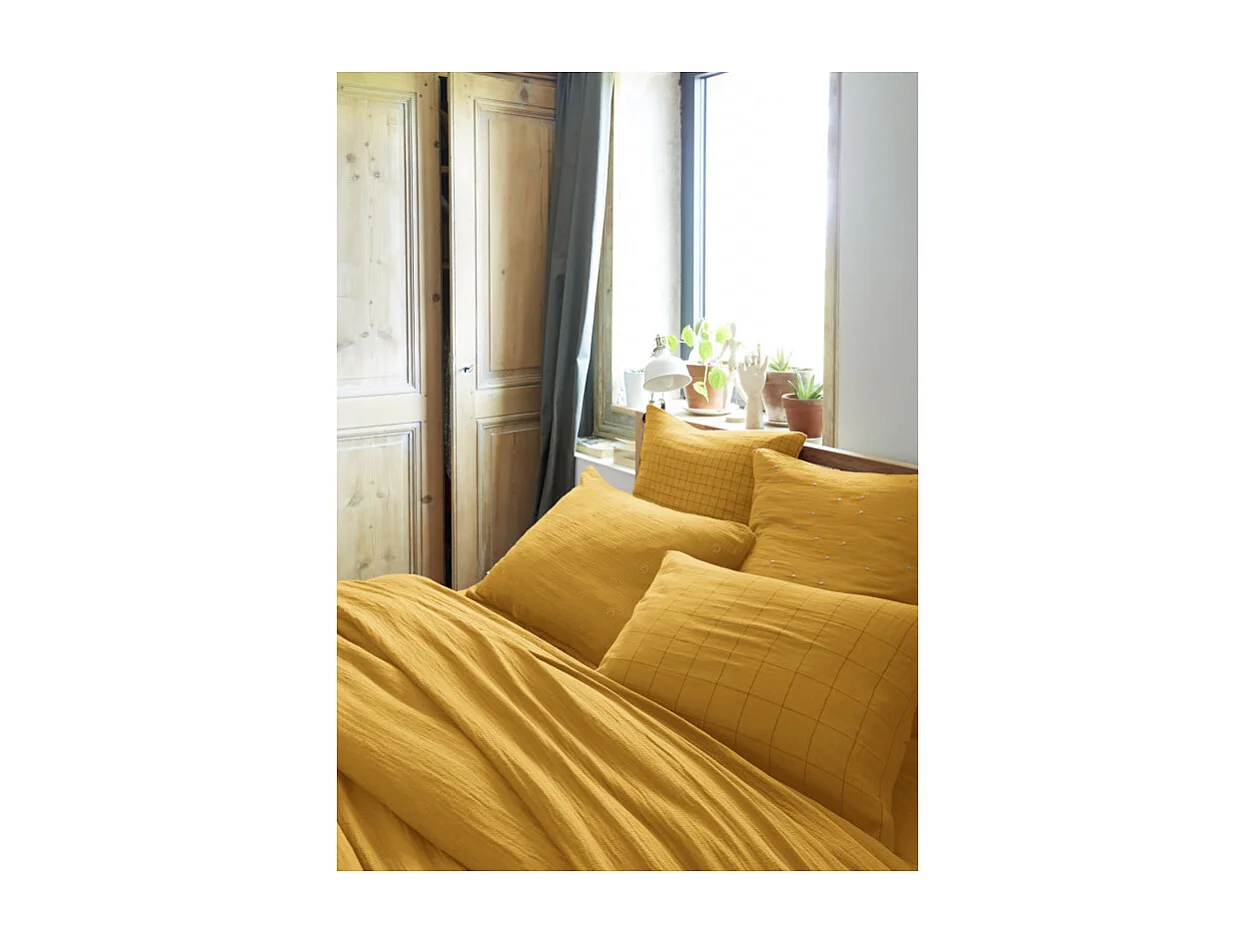 Taie d'oreiller brodée double gaze de coton jaune safran 50x70 cm