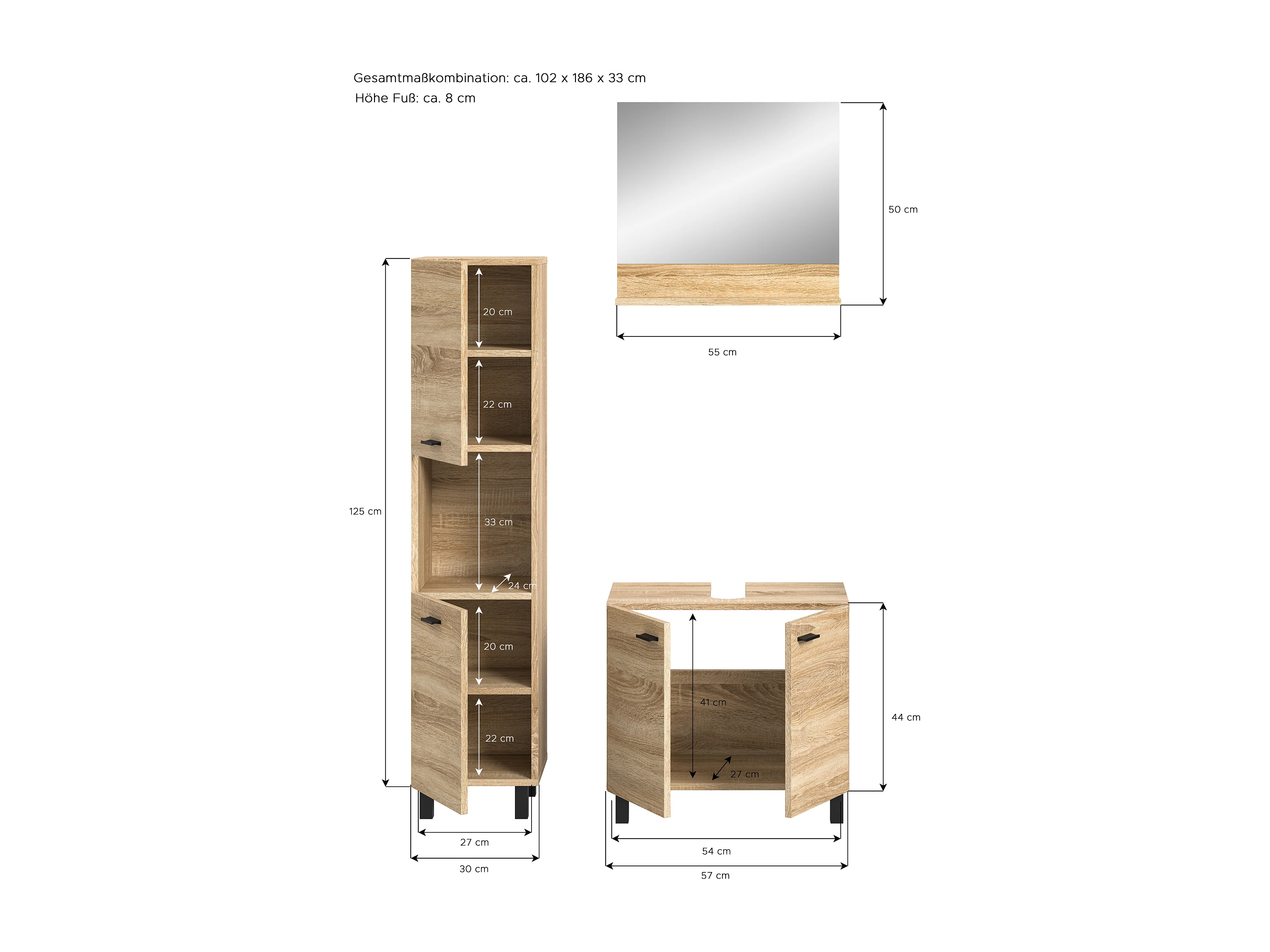 Tambo - Ensemble de 3 meubles de salle de bains (L/H/P : 102x186x33 cm) en mélaminé chêne, vasque non incluse