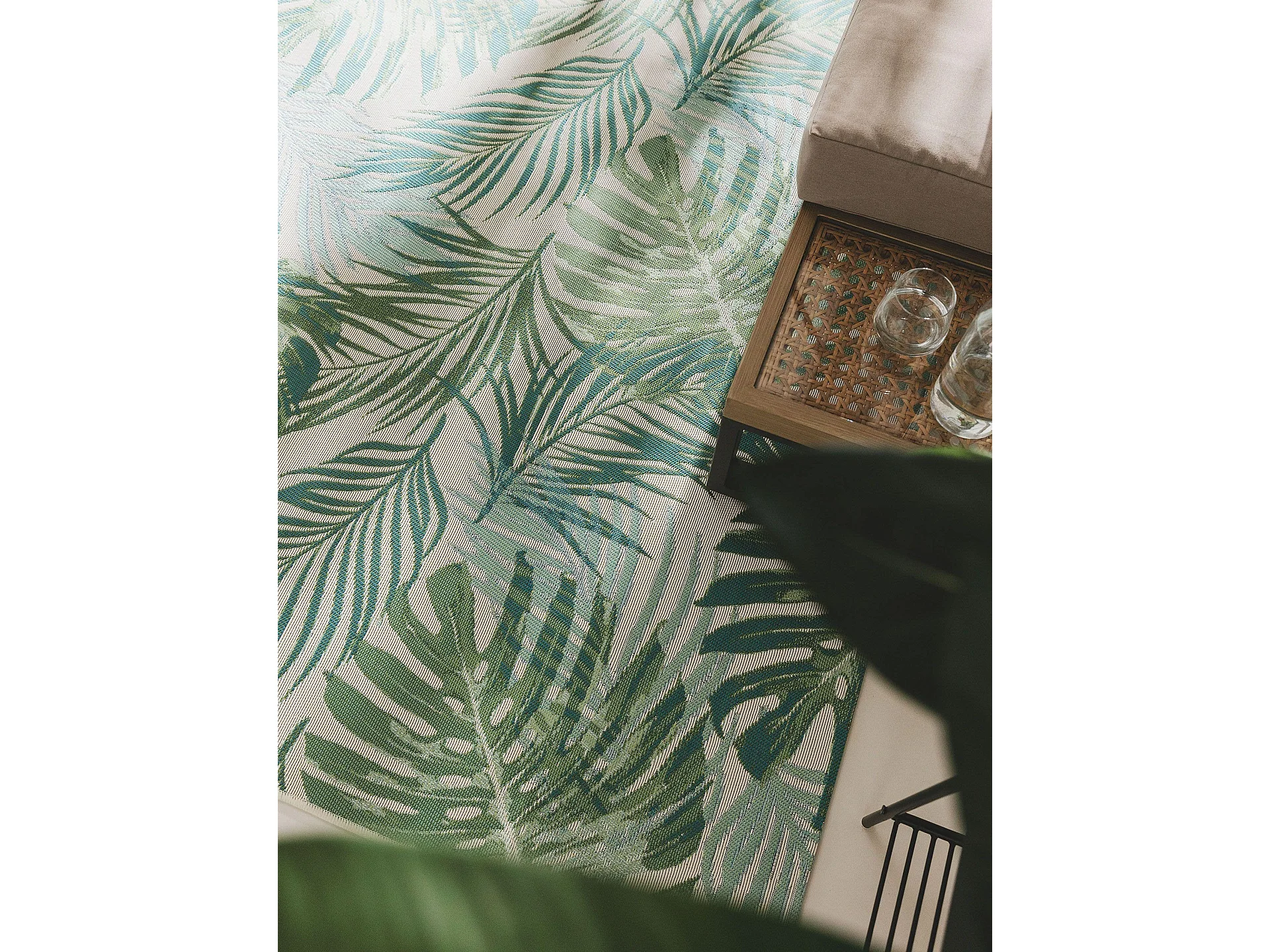 Tapis d'extérieur réversible imperméable dim. 365L x 274l cm motif feuillage sac transport motif feuillage PP vert crème