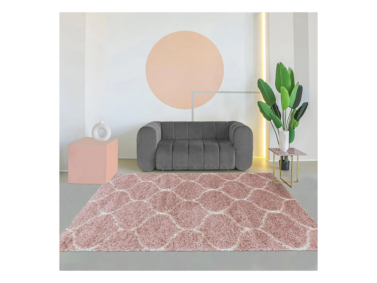 Tapis shaggy 280x370 rectangle tissé rose crème et me motif scandinave