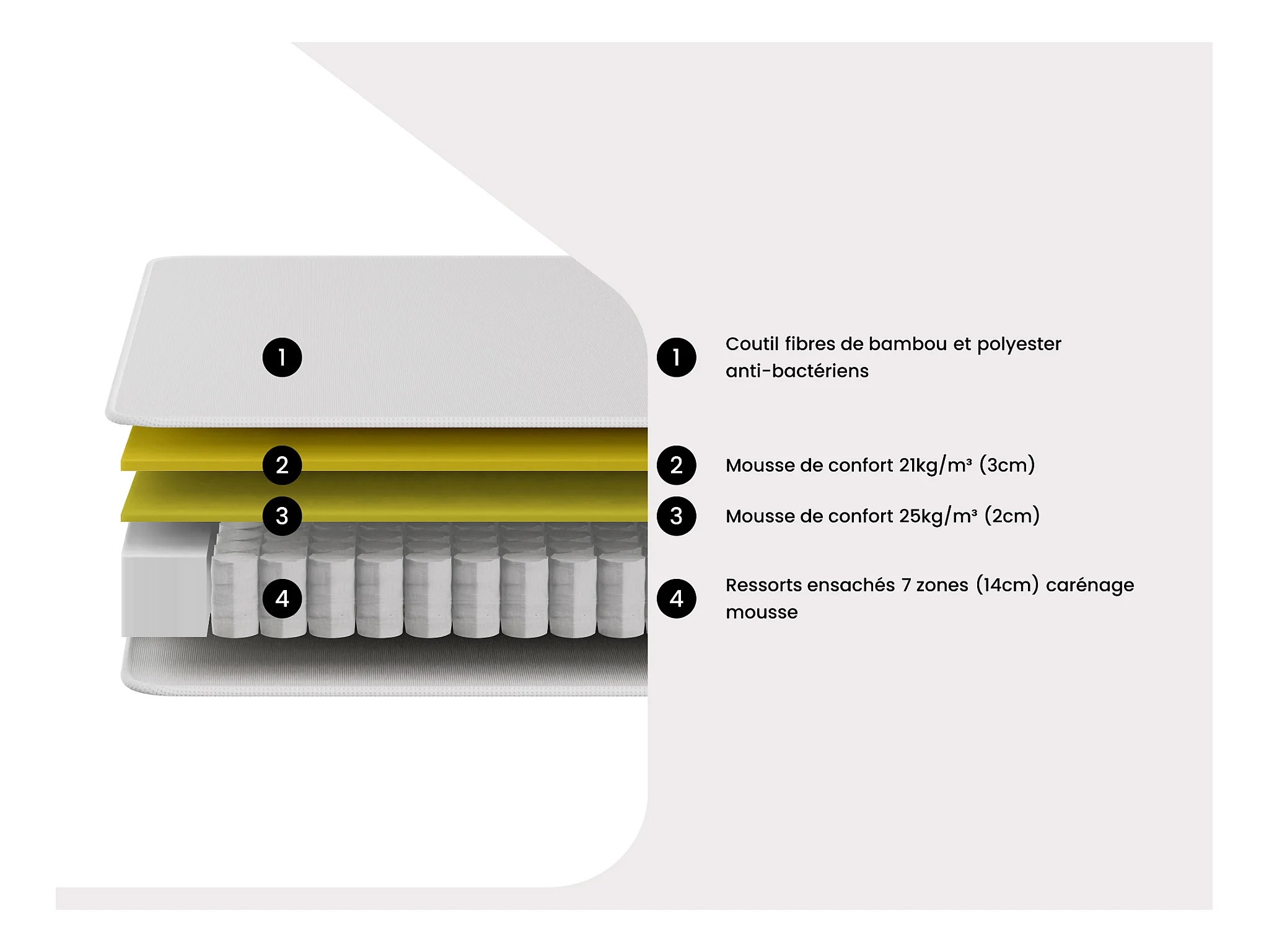 Ensemble 180 x 200 cm sommier tapissier + matelas ressorts ensachés 7 zones surmatelas intégré et coutil bambou ép.23cm - TAREVO de NATUREA