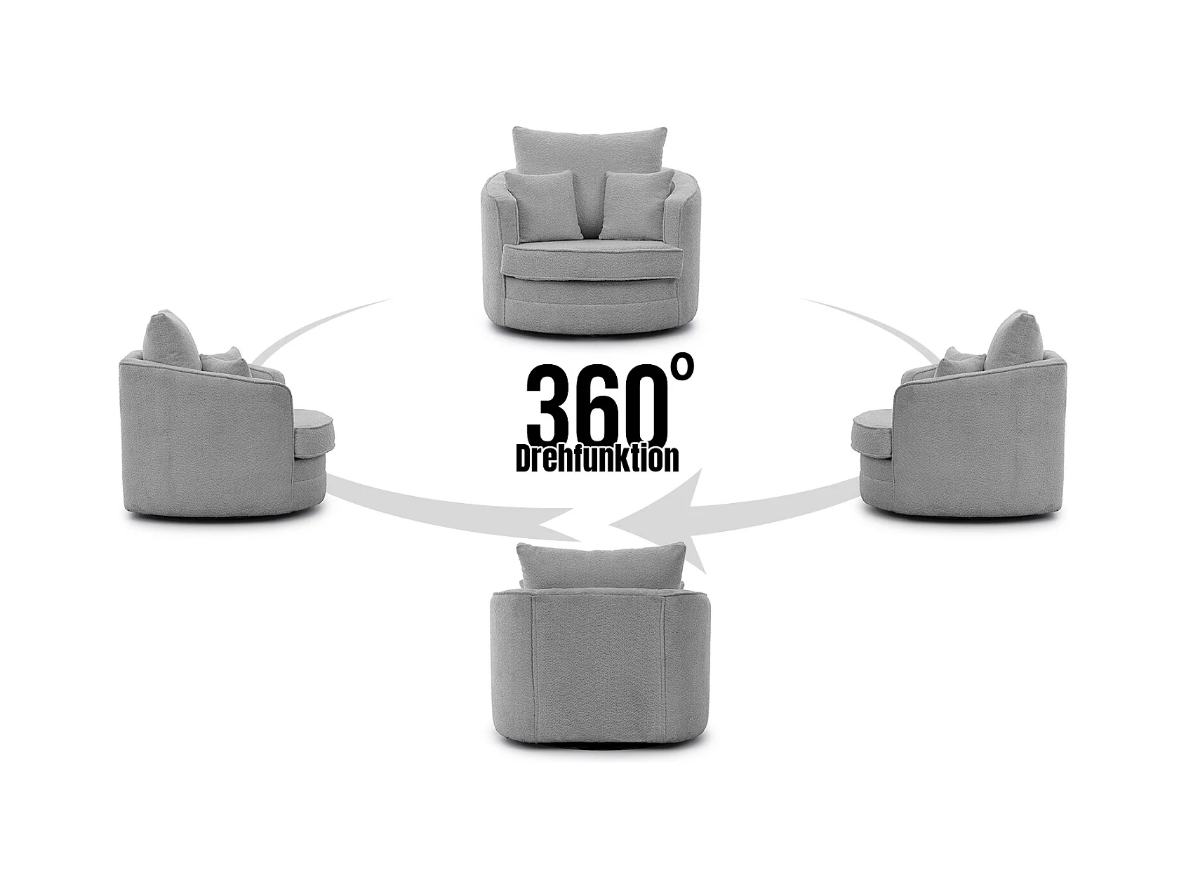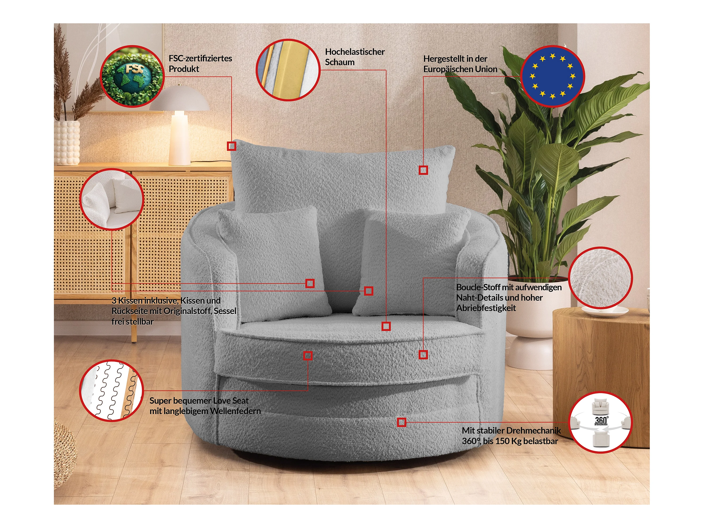 Ted – Fauteuil pivotant Love Seat XXL rotatif à 360 degrés en tissu bouclé gris