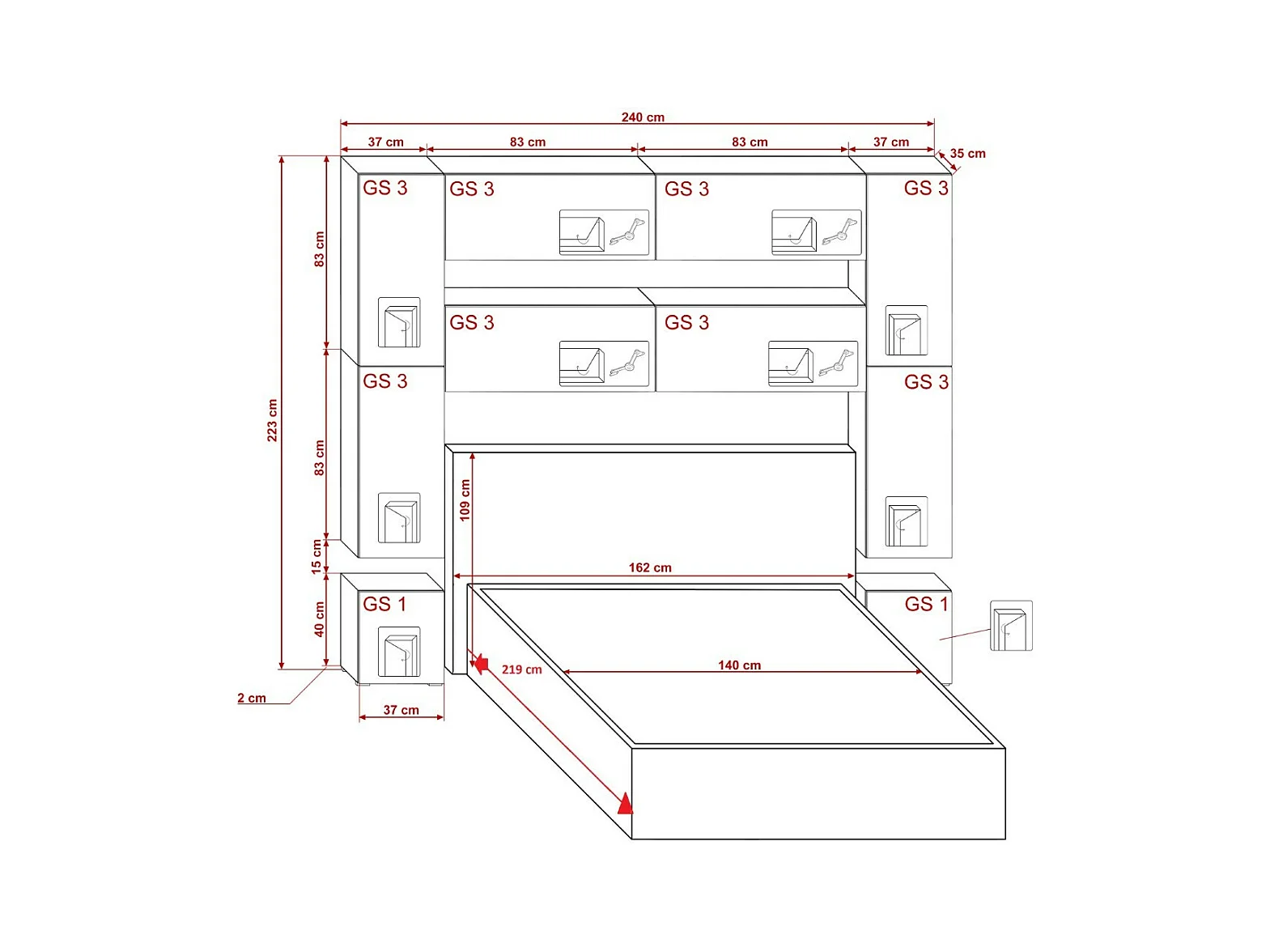 Tête de lit avec rangement Armoire - pont de lit PANAMA 4/M/W/3-1B blanc 240x223x35cm