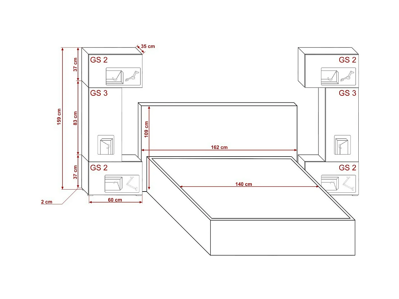 Tête de lit avec rangement Armoire - pont de lit PANAMA 3/21W/HG2 blanc/blanc brillant 282-322x159x35cm