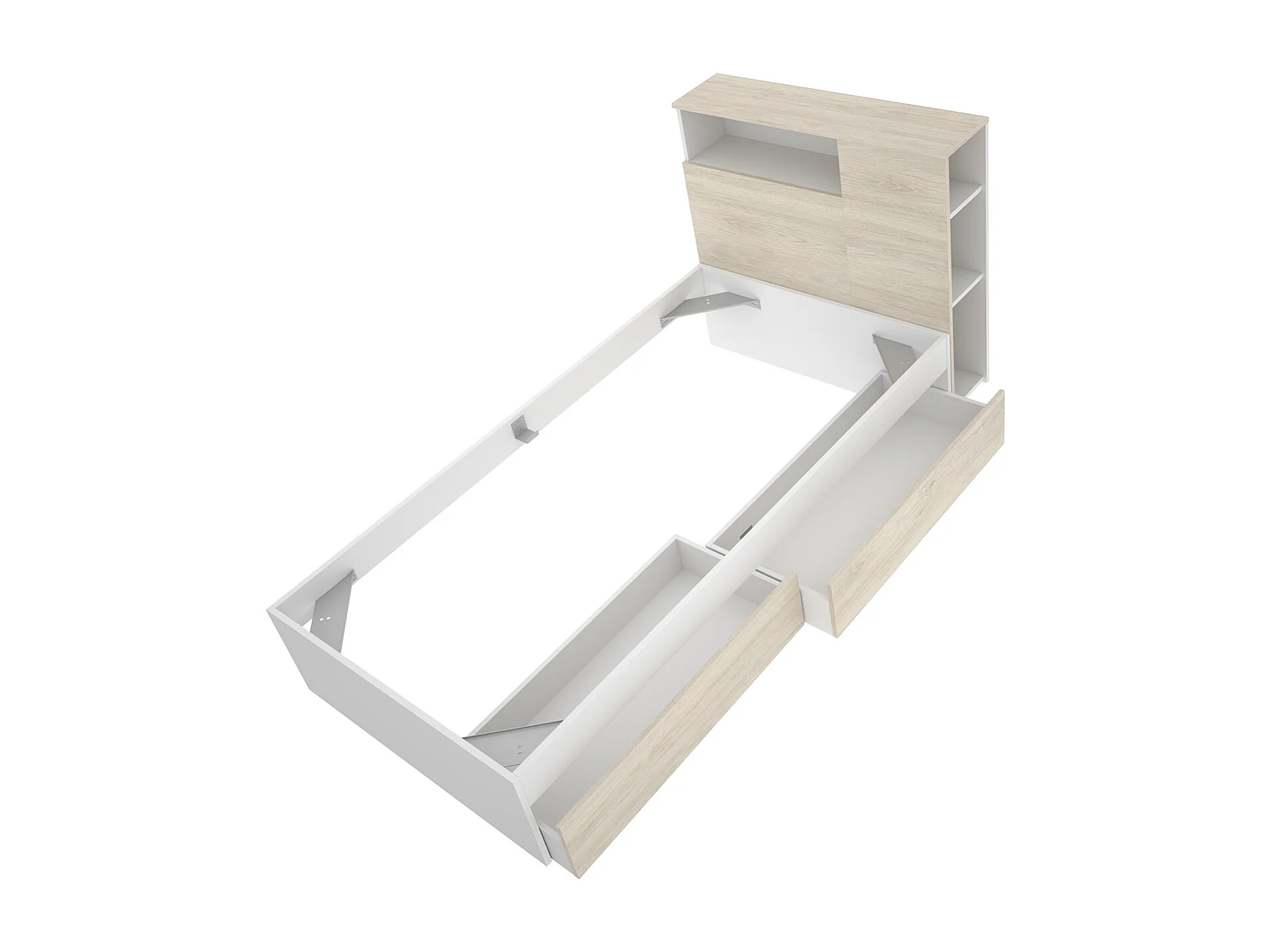 Tête de lit + structure de lit avec 2 tiroirs pour enfant en bois coloris chêne naturel, blanc - Longueur 218 x Profondeur 97,50 x Hauteur 95 cm