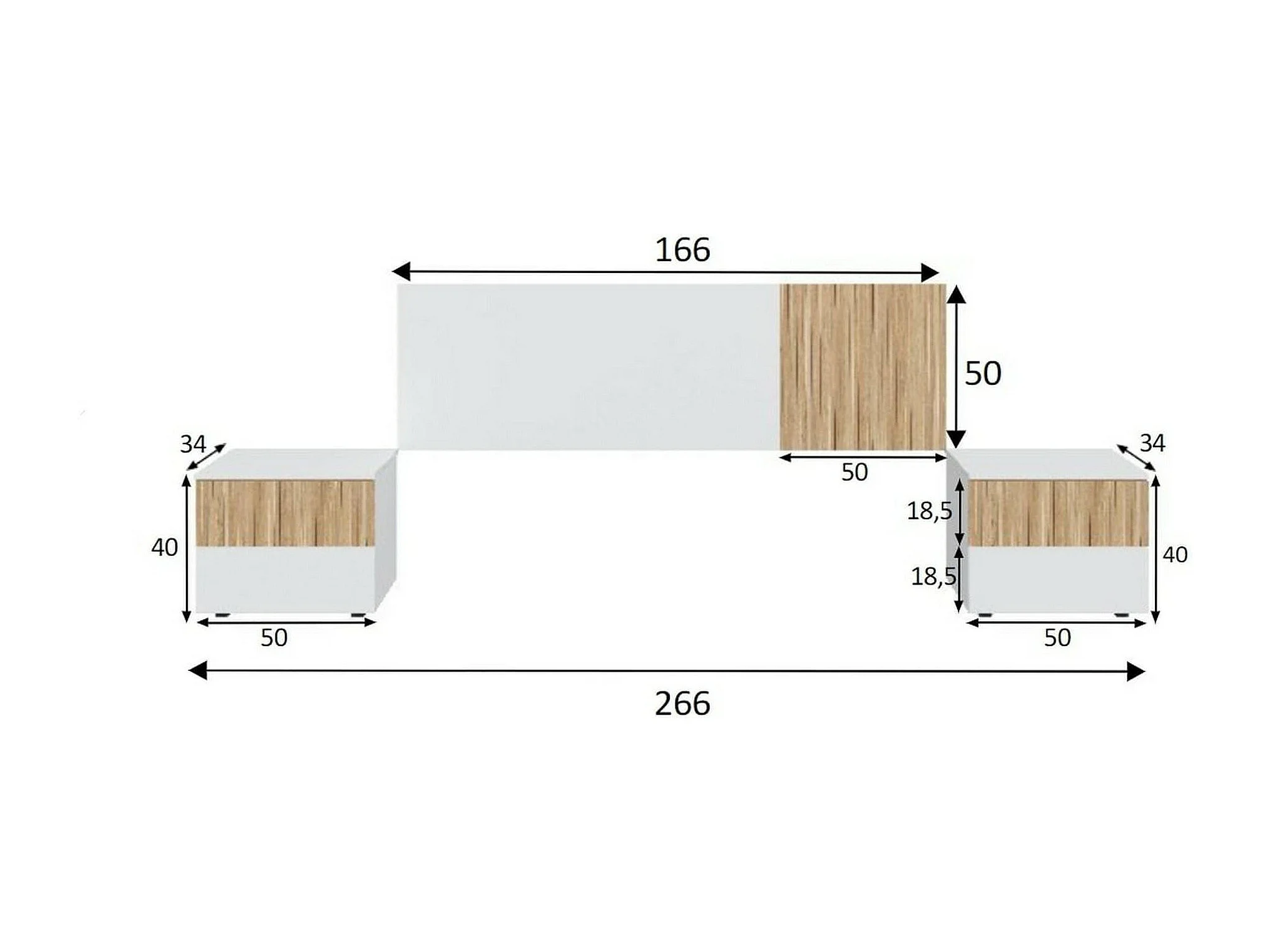 Tête de lit Yuma, Tête de lit avec 2 tables de chevet, Ensemble chambre à coucher, 266x34h89 cm, Blanc et Chêne