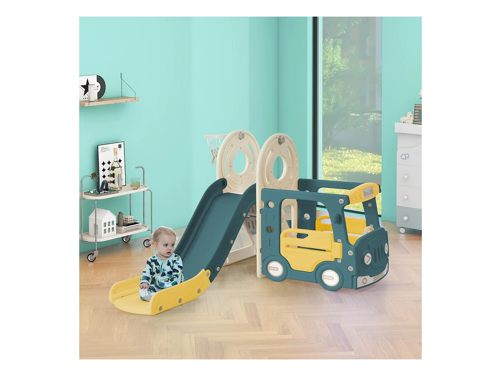 Toboggan 4 en 1 avec bus, panier de basket, échelle d’activités et ballon, en polyéthylène haute densité, pour enfants.