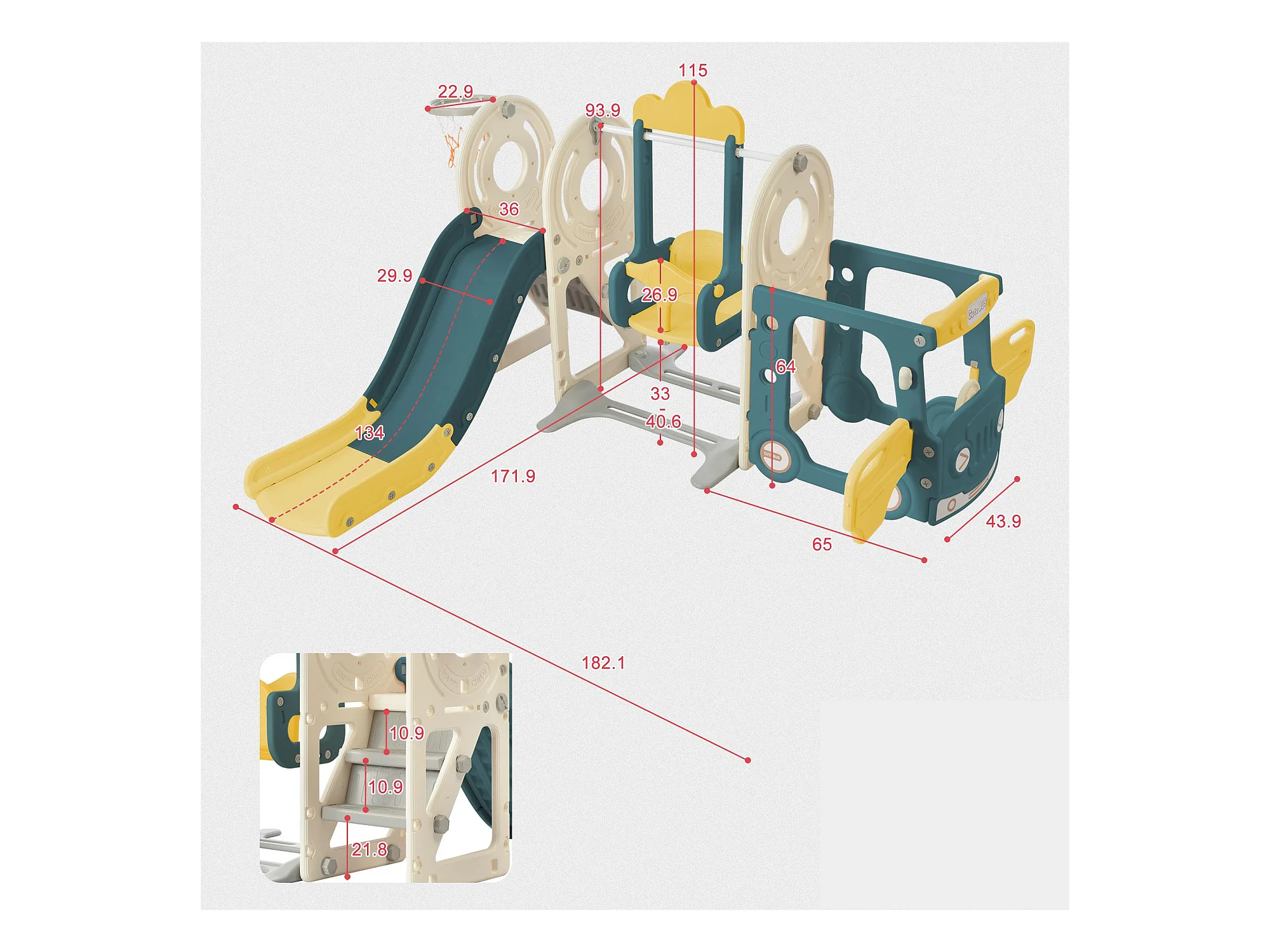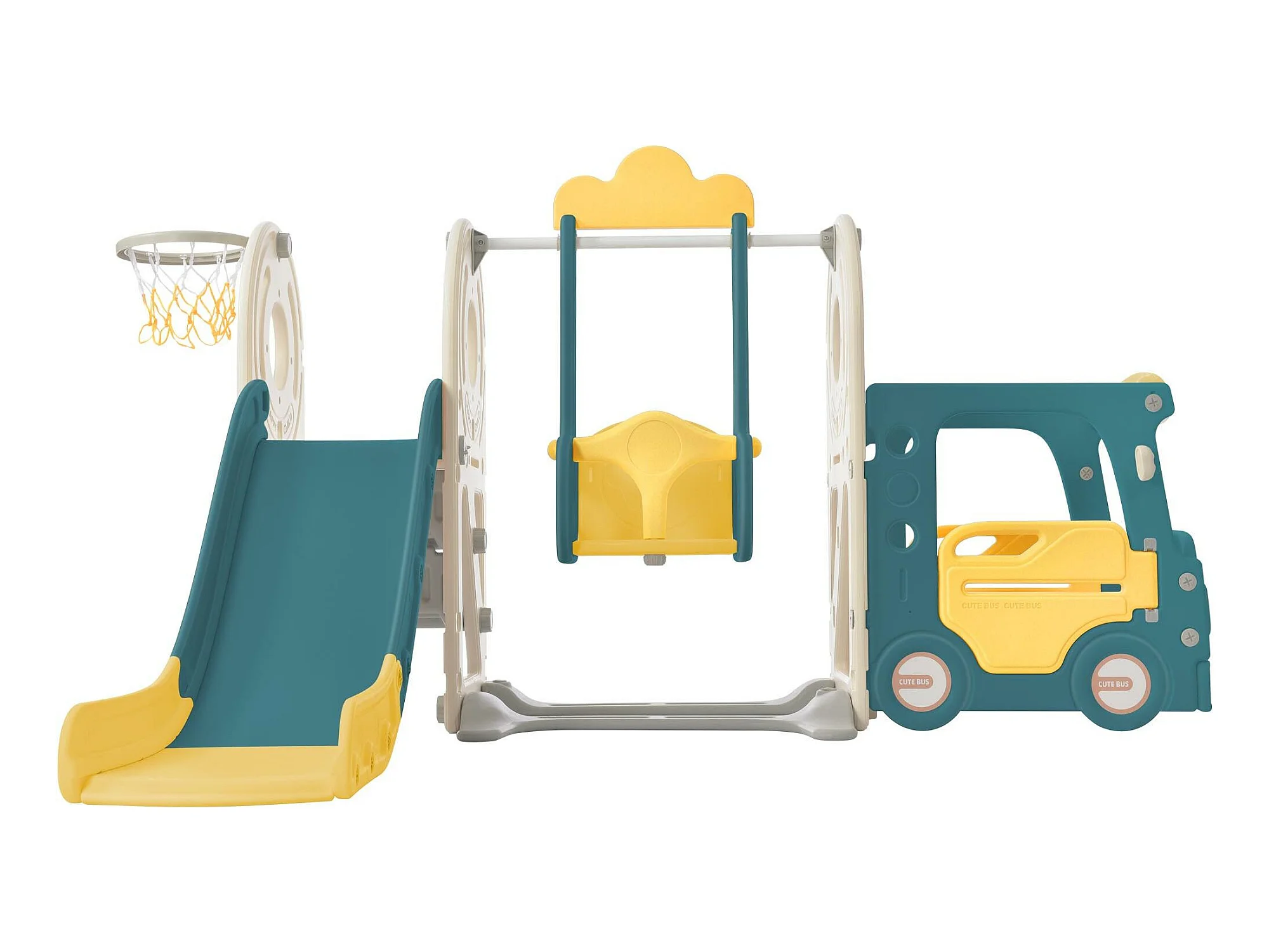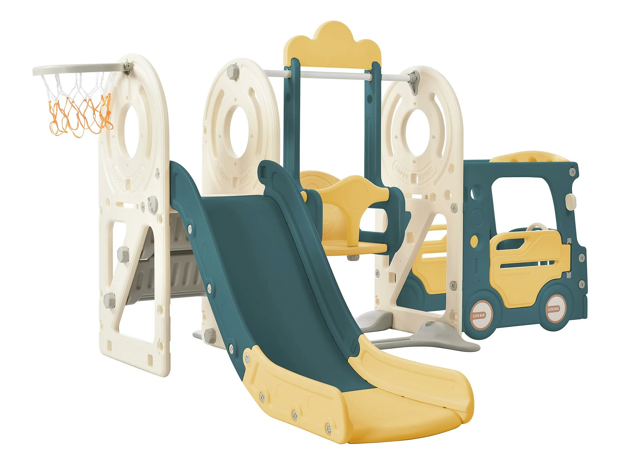 Ensemble de toboggan 182x172x115cm 5 en 1 Bus Balançoire Échelle Panier de basketball Ballon de basketball inclus en HDPE couleur Vert