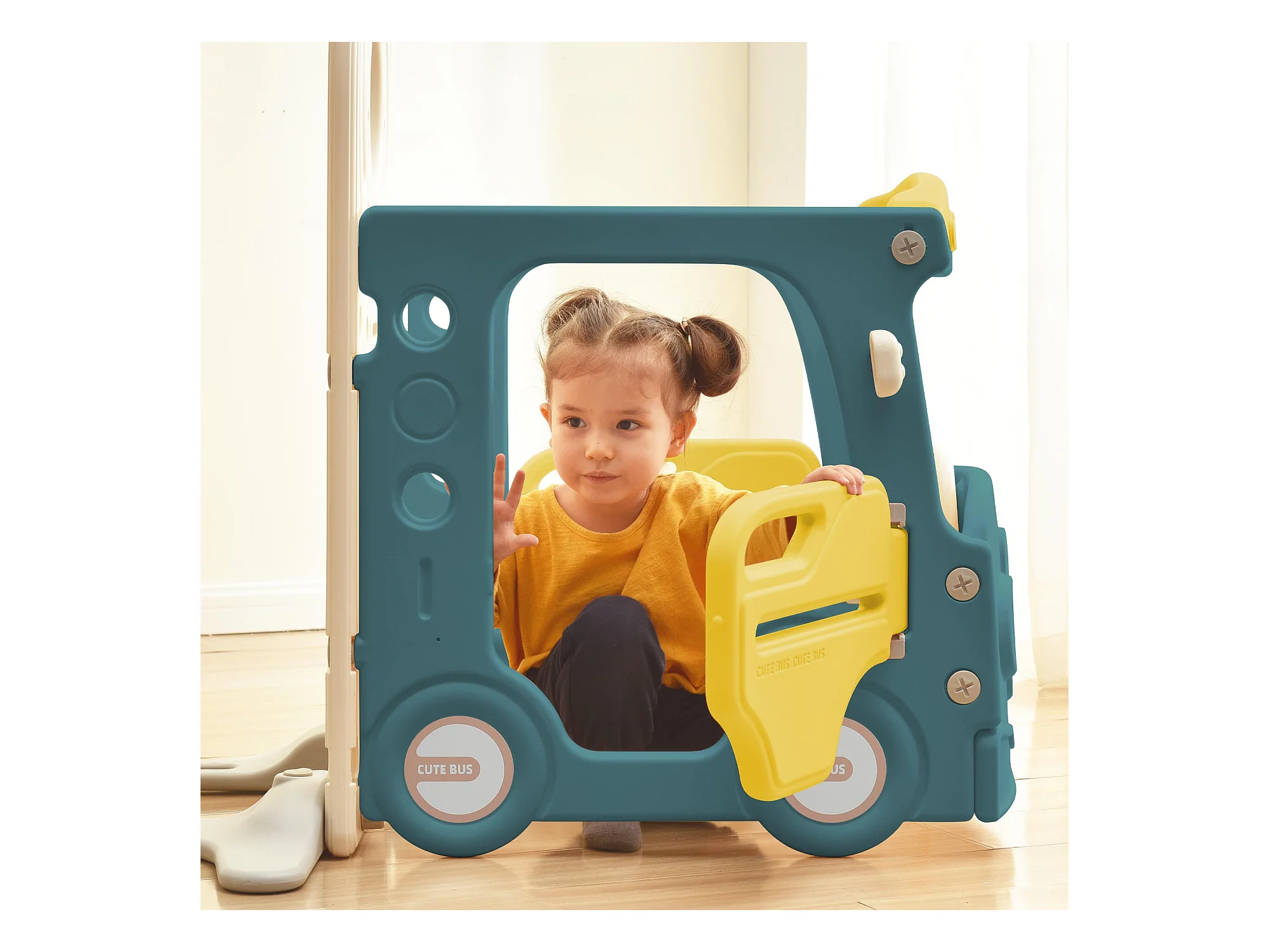 Ensemble de toboggan 171x109.9x100cm 4 en 1 Autobus Échelle mobile Panier de basketball Ballon de basketball inclus HDPE couleur Vert