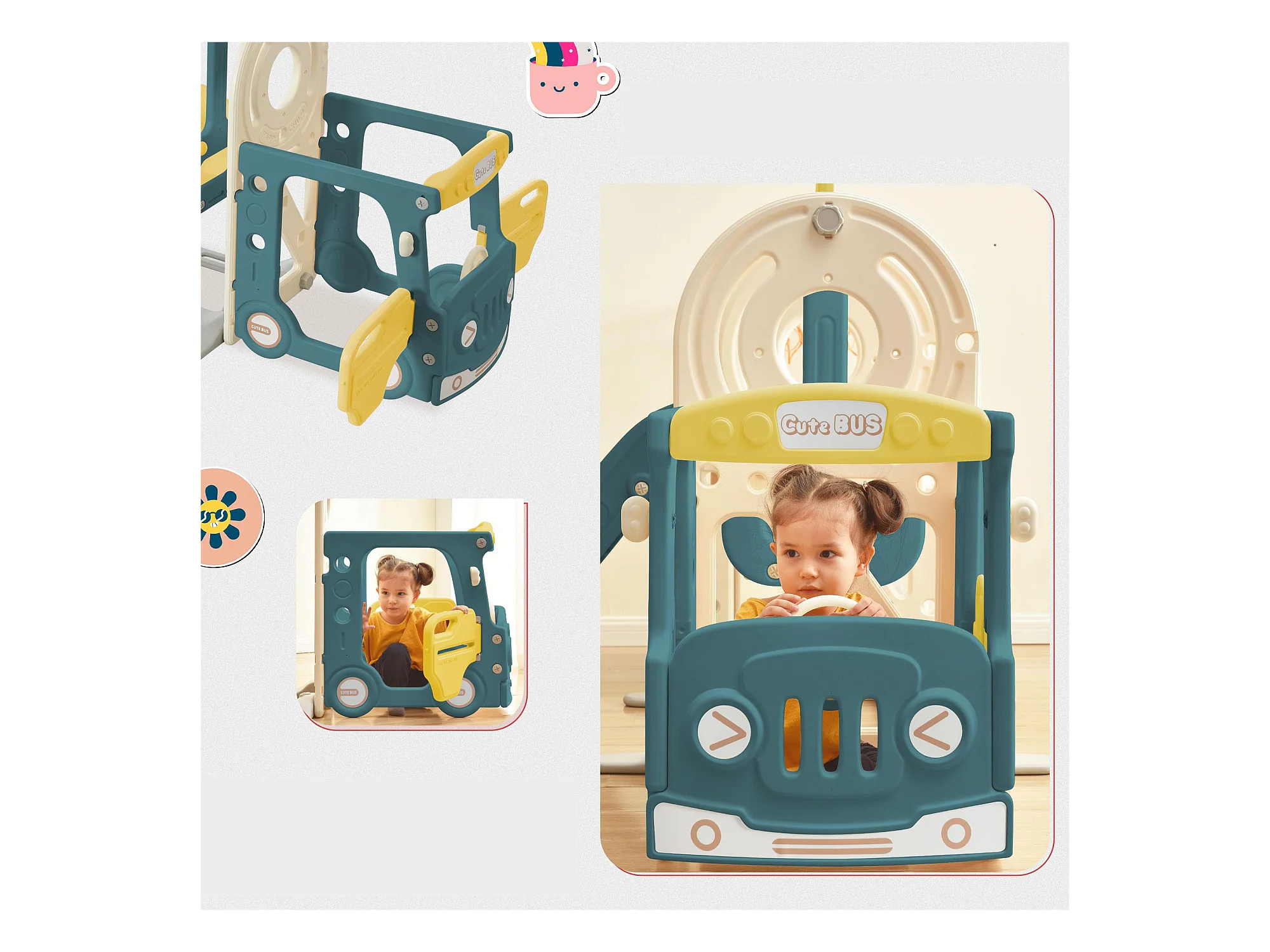 Ensemble de toboggans pour enfants 4 en 1 - 171 x 109 x 100cm - en HDPE - avec bus et panier de basket - vert