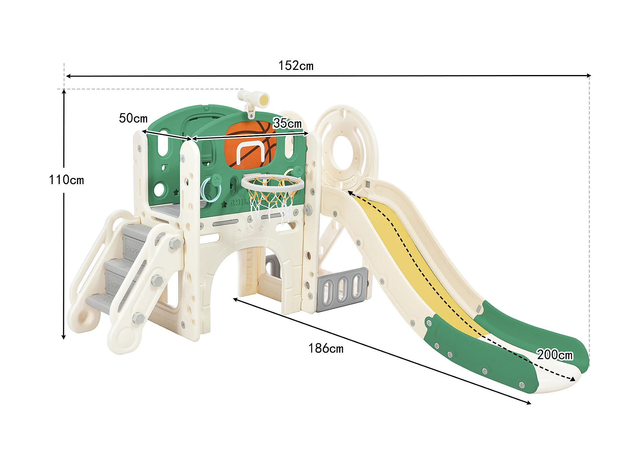 Ensemble de toboggan 186x152x110cm Boîte de rangement Tunnel Escalier Panier de basketball Zone de passage Matériel HDPE Vert