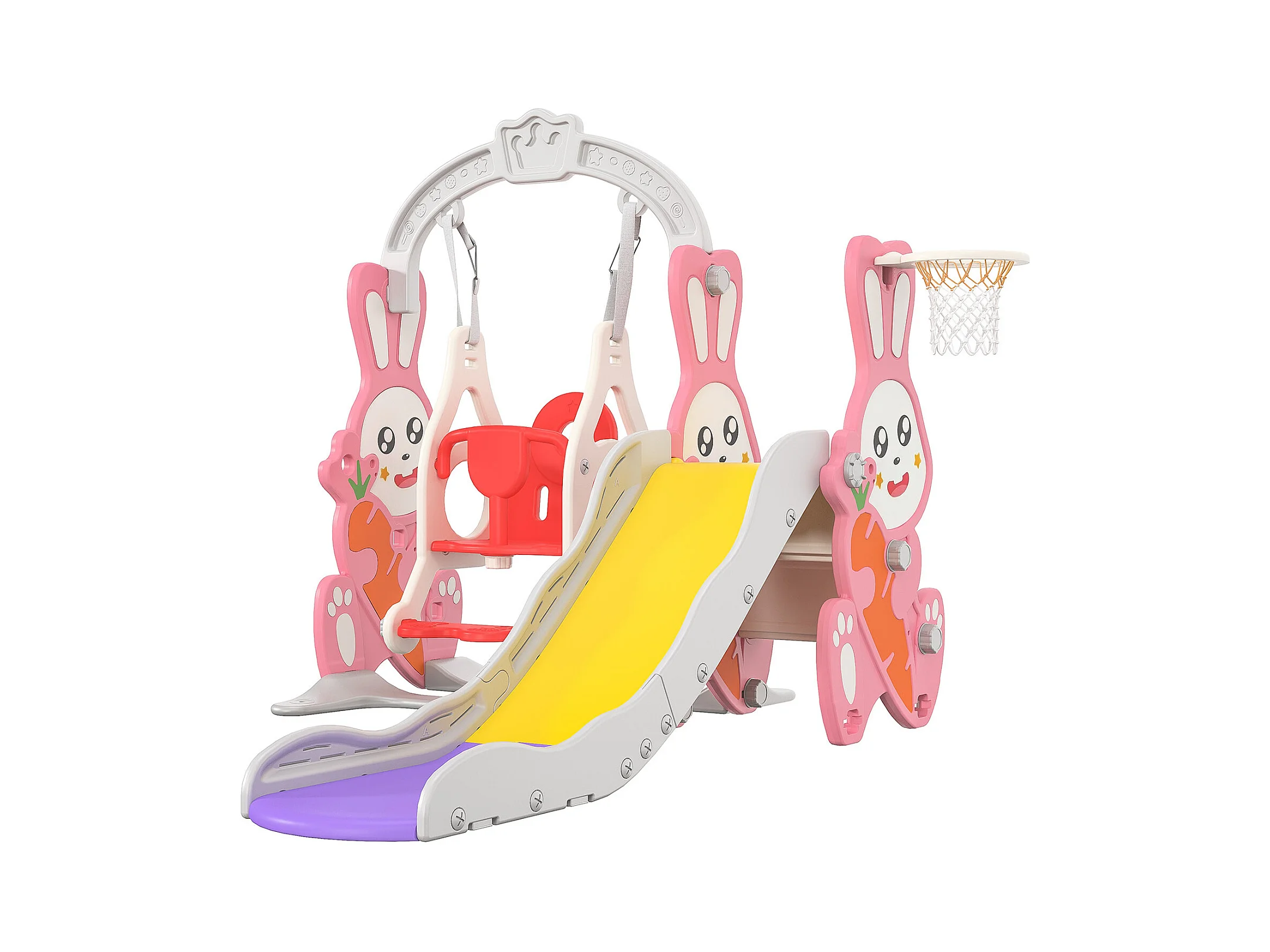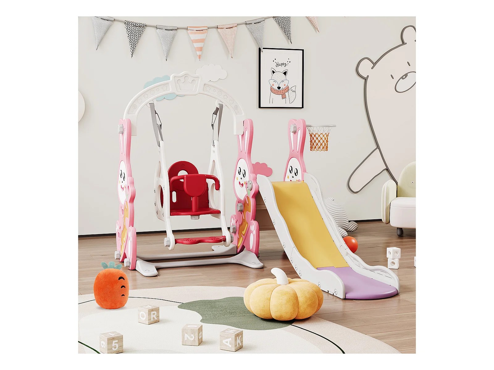Toboggan 4 en 1 pour enfants avec balançoire, escaliers,toboggan, Support de basket, Facile à assembler,Rose