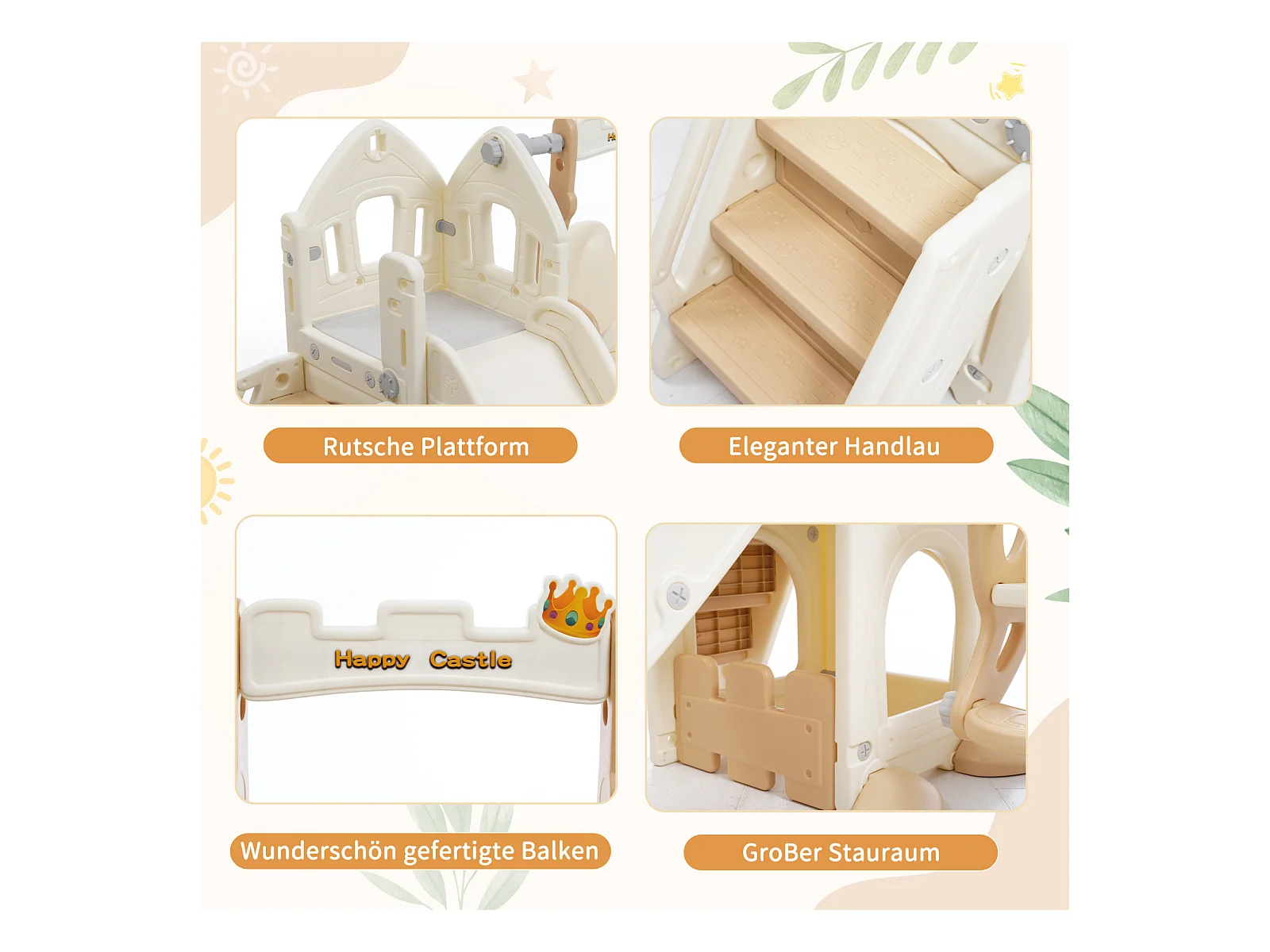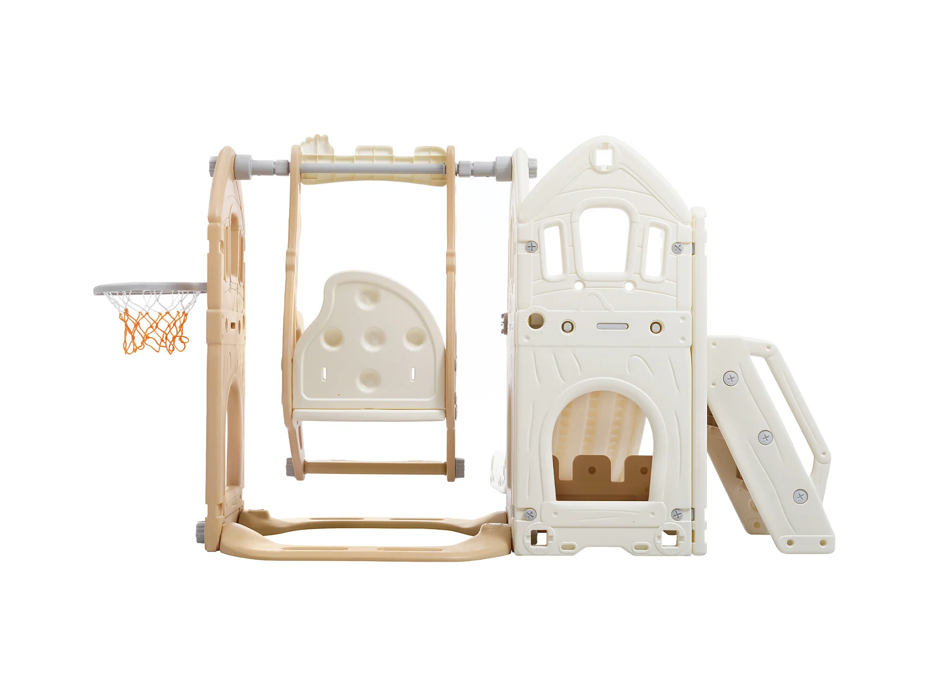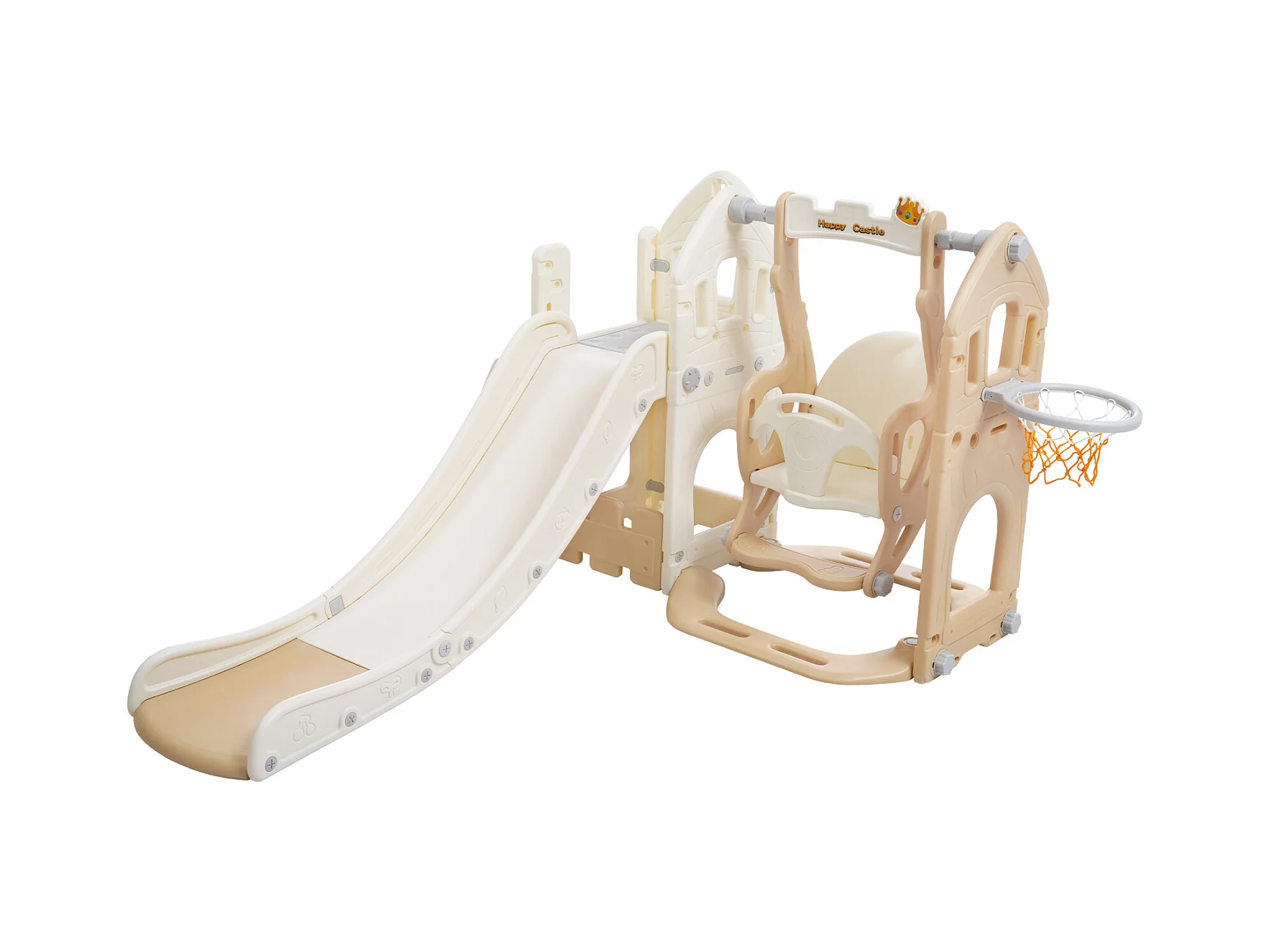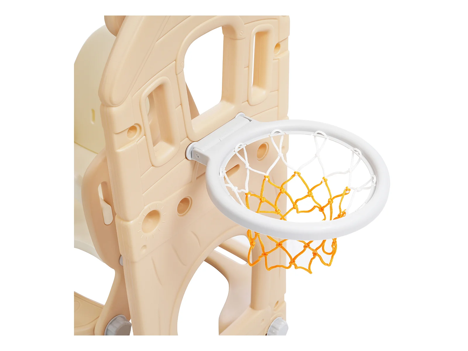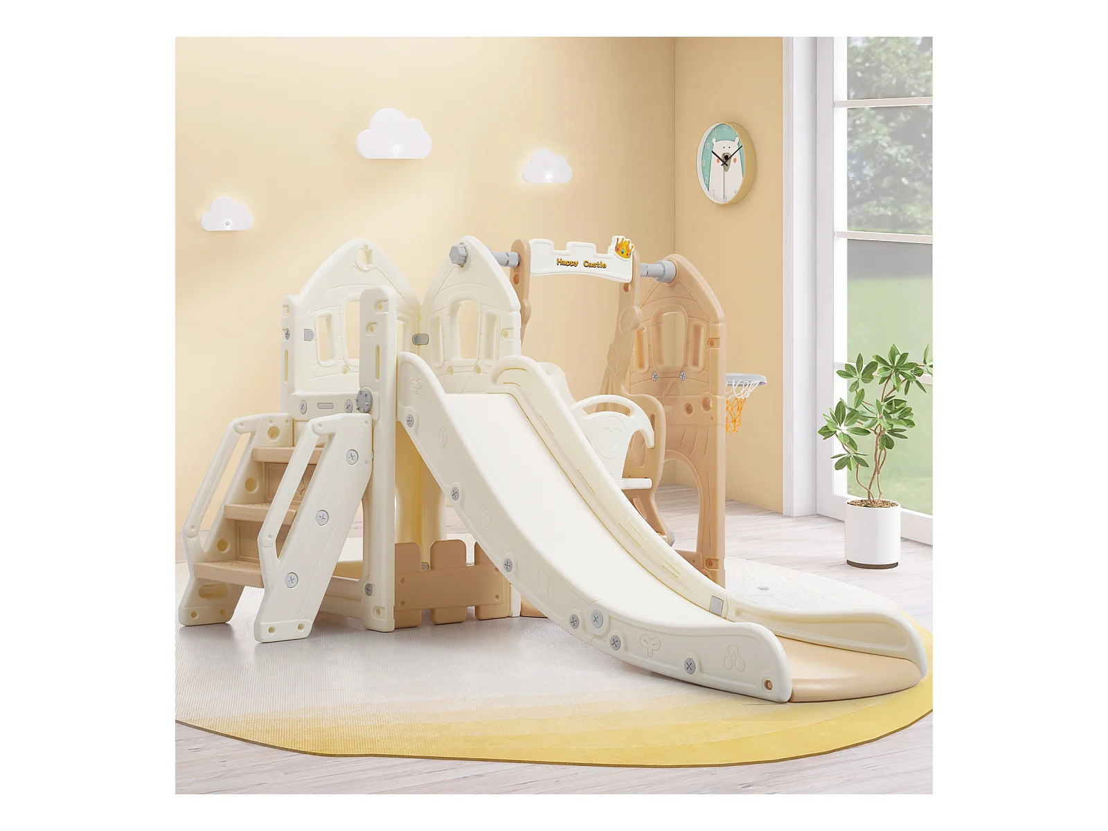 Toboggan en PP 5 en 1 pour enfant 3-8ans, balançoire, toboggan, escalade, espace de rangement, cadre de basket-ball, rose antique