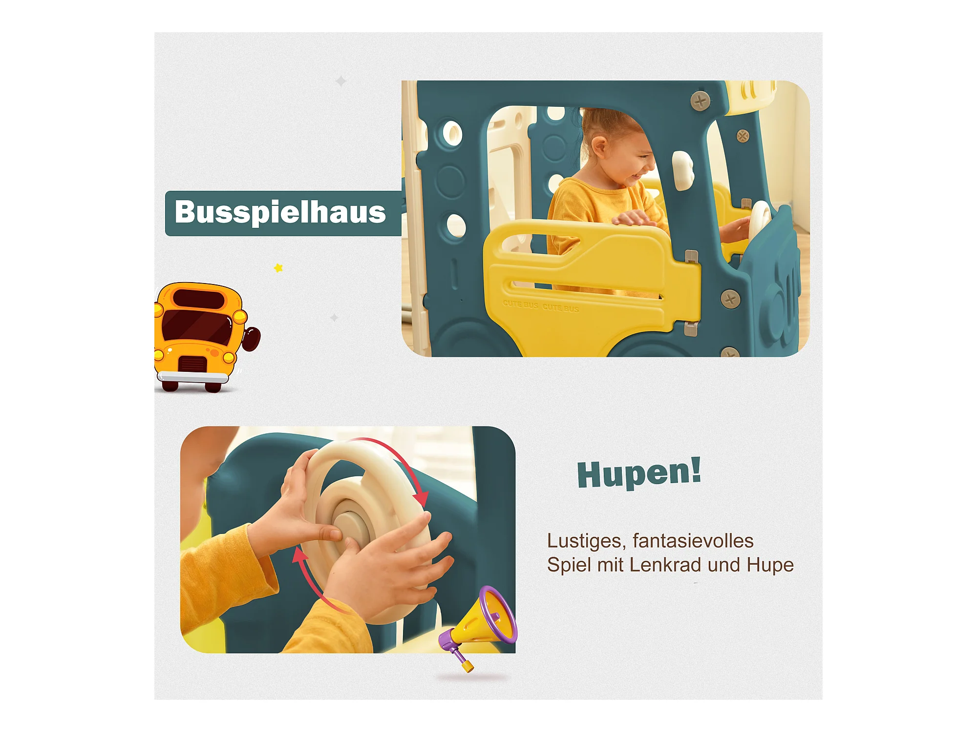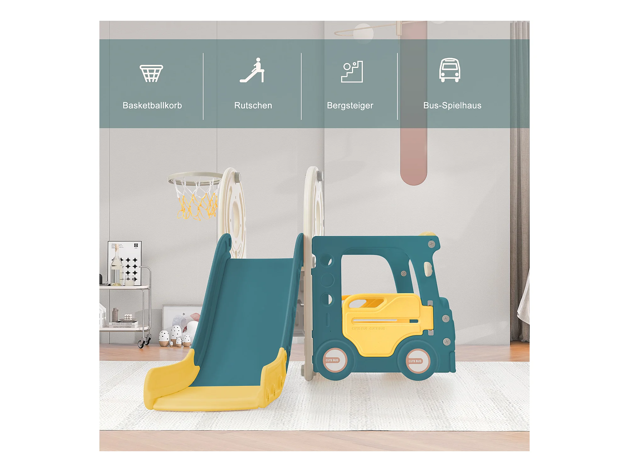 Toboggan 4 en 1 avec bus, panier de basket, échelle d’activités et ballon, en polyéthylène haute densité, pour enfants.
