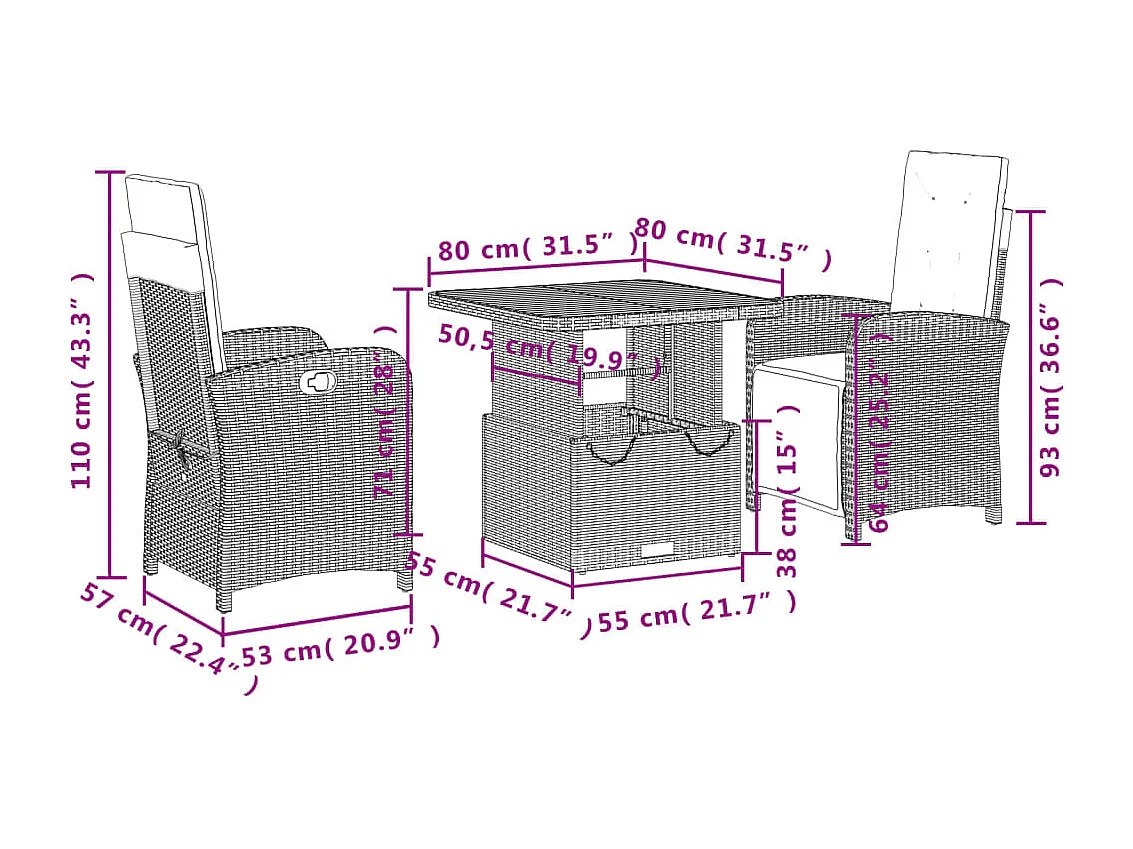 Toby Dean Ensemble à manger de jardin avec coussins 3 pcs Noir
