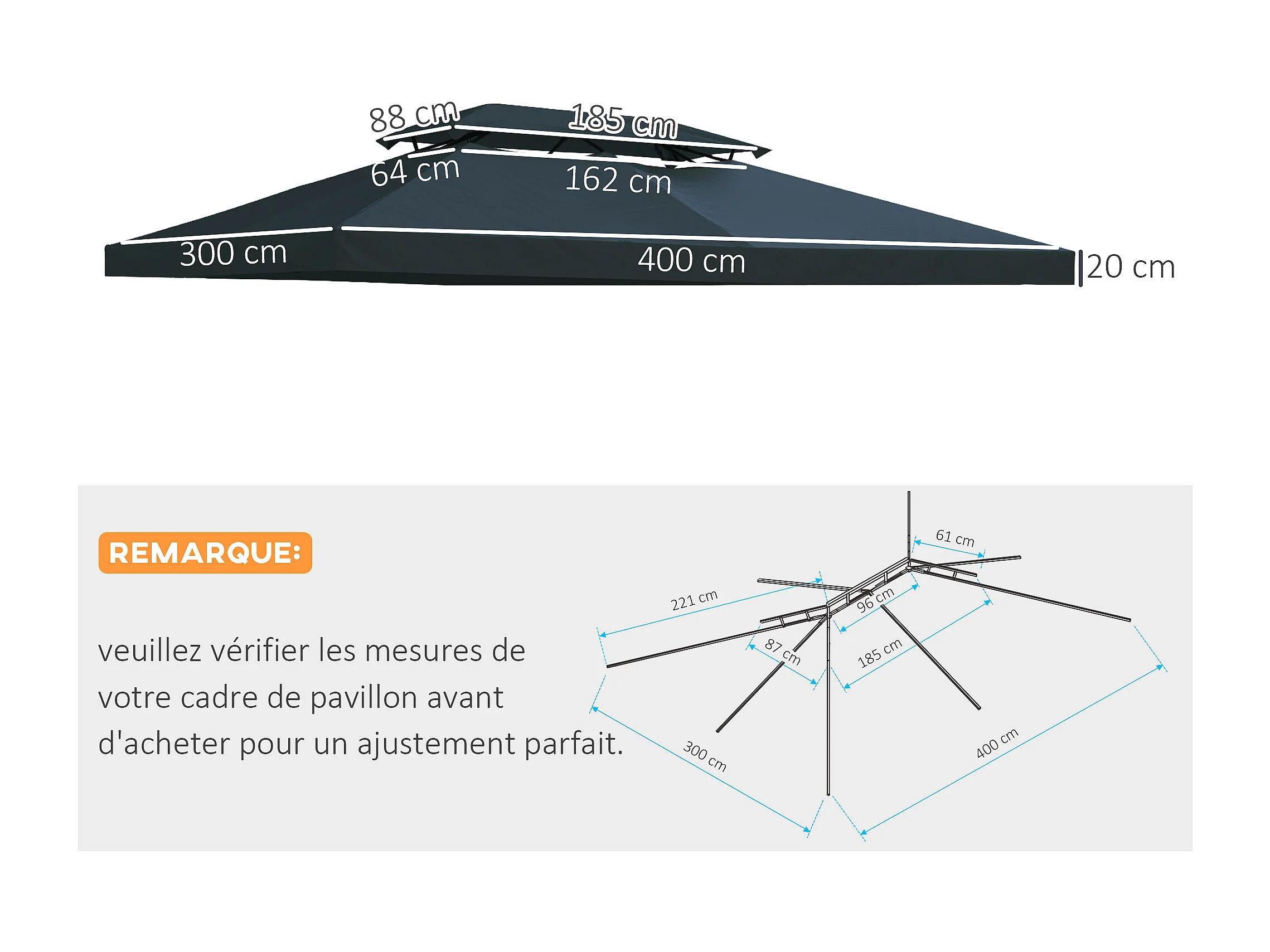 Toile de rechange pour pavillon tonnelle tente 3 x 4 m polyester haute densité 180 g/m² gris foncé