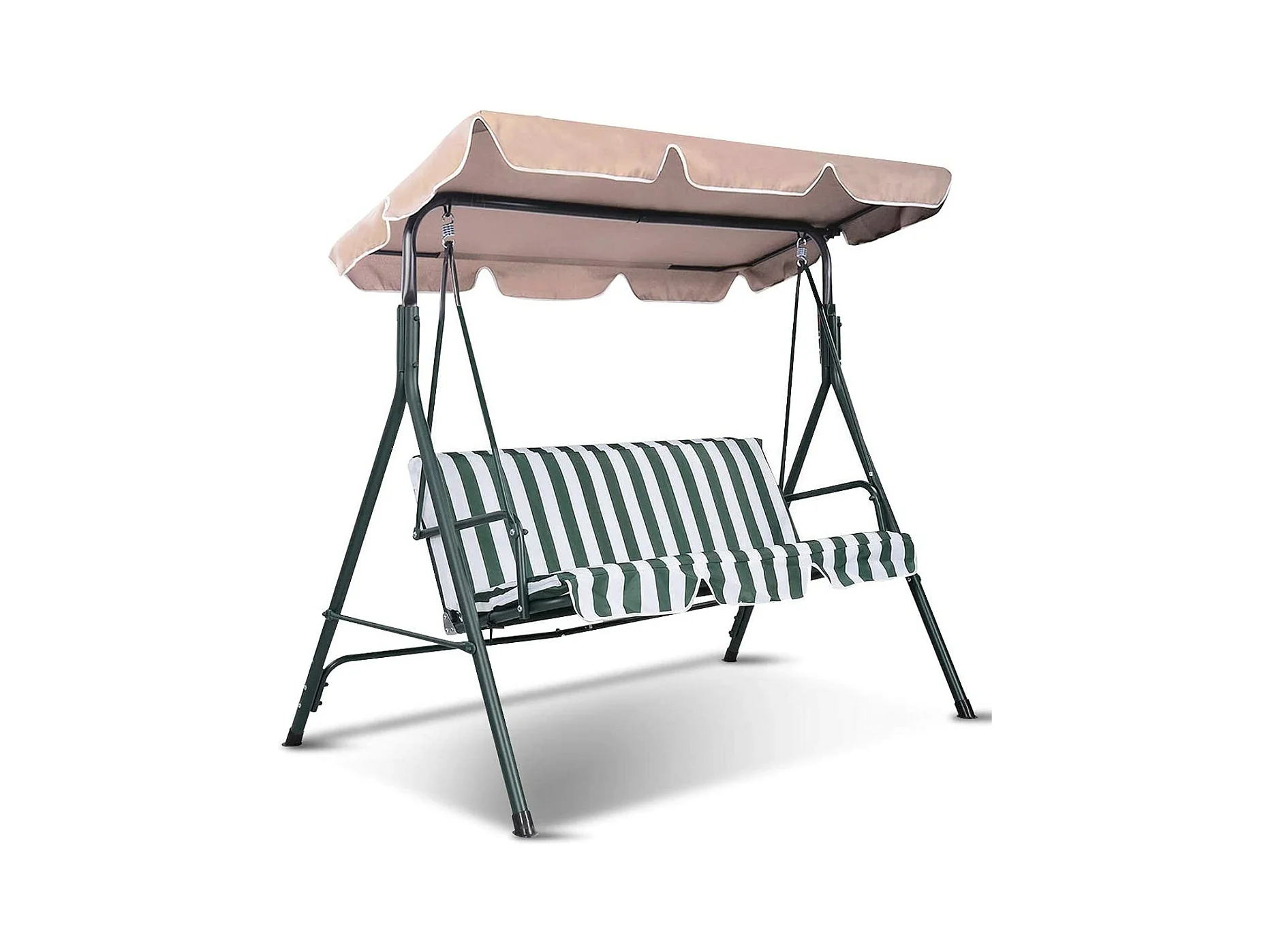 Balancelle 3 places 2 en 1 avec fonction lit, structure acier, toit réglable, beige (195x117x175cm)