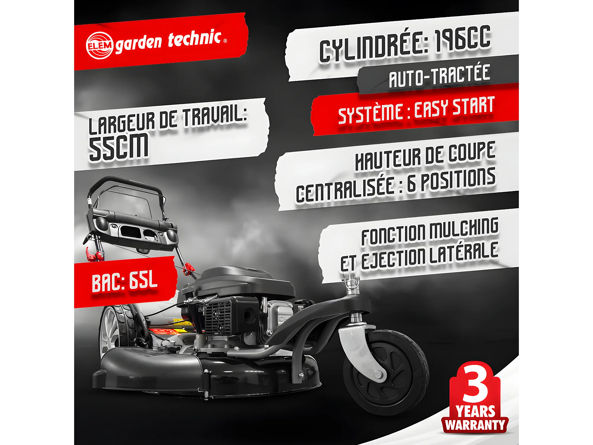 Tondeuse thermique tractée 3 roues 196cc - 55cm - 65L - Elem Garden