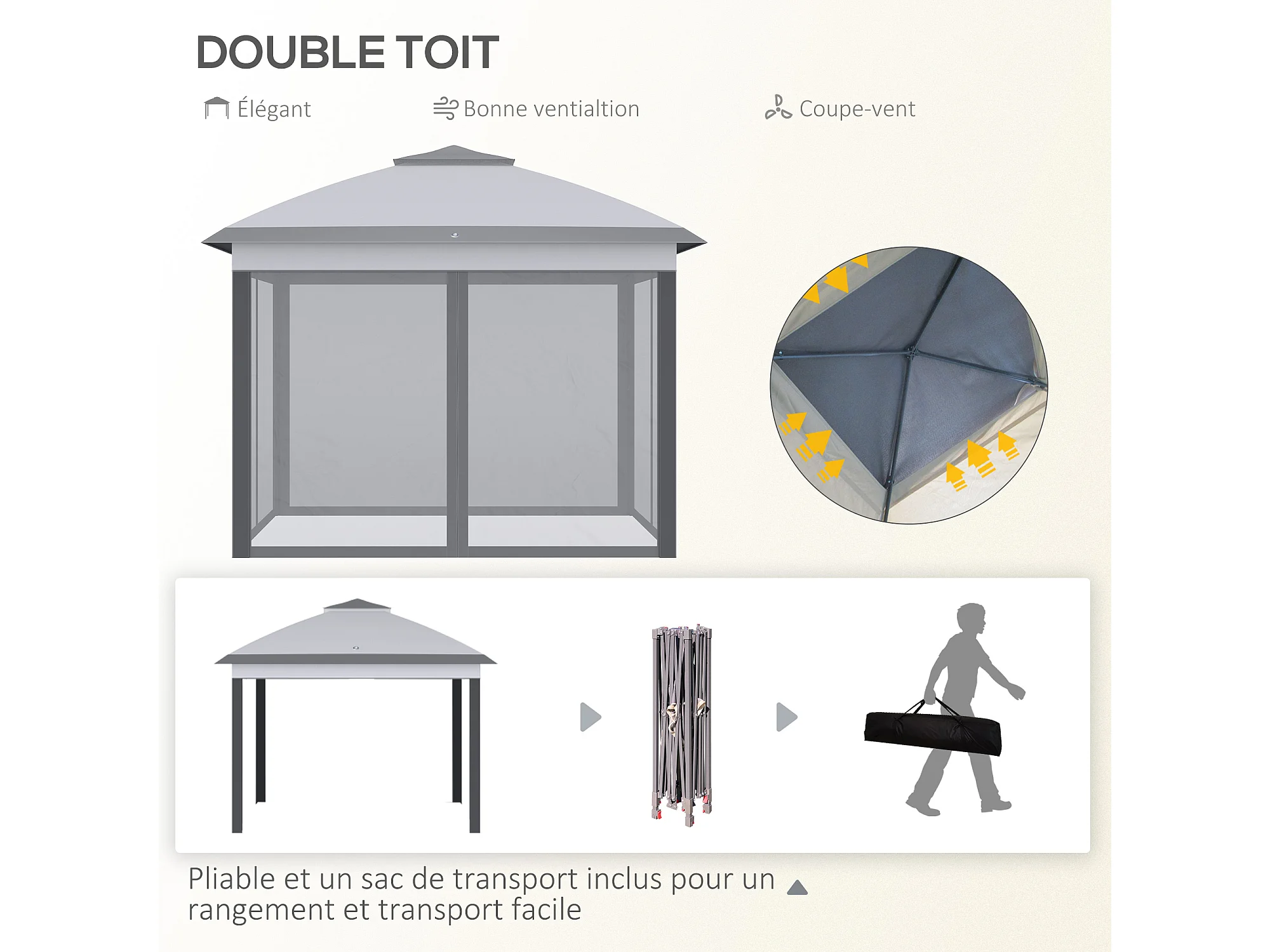 Tonnelle barnum automatique pop-up dim. 3,3L x 3,3l x 2,88H m moustiquaires sac transport métal oxford gris