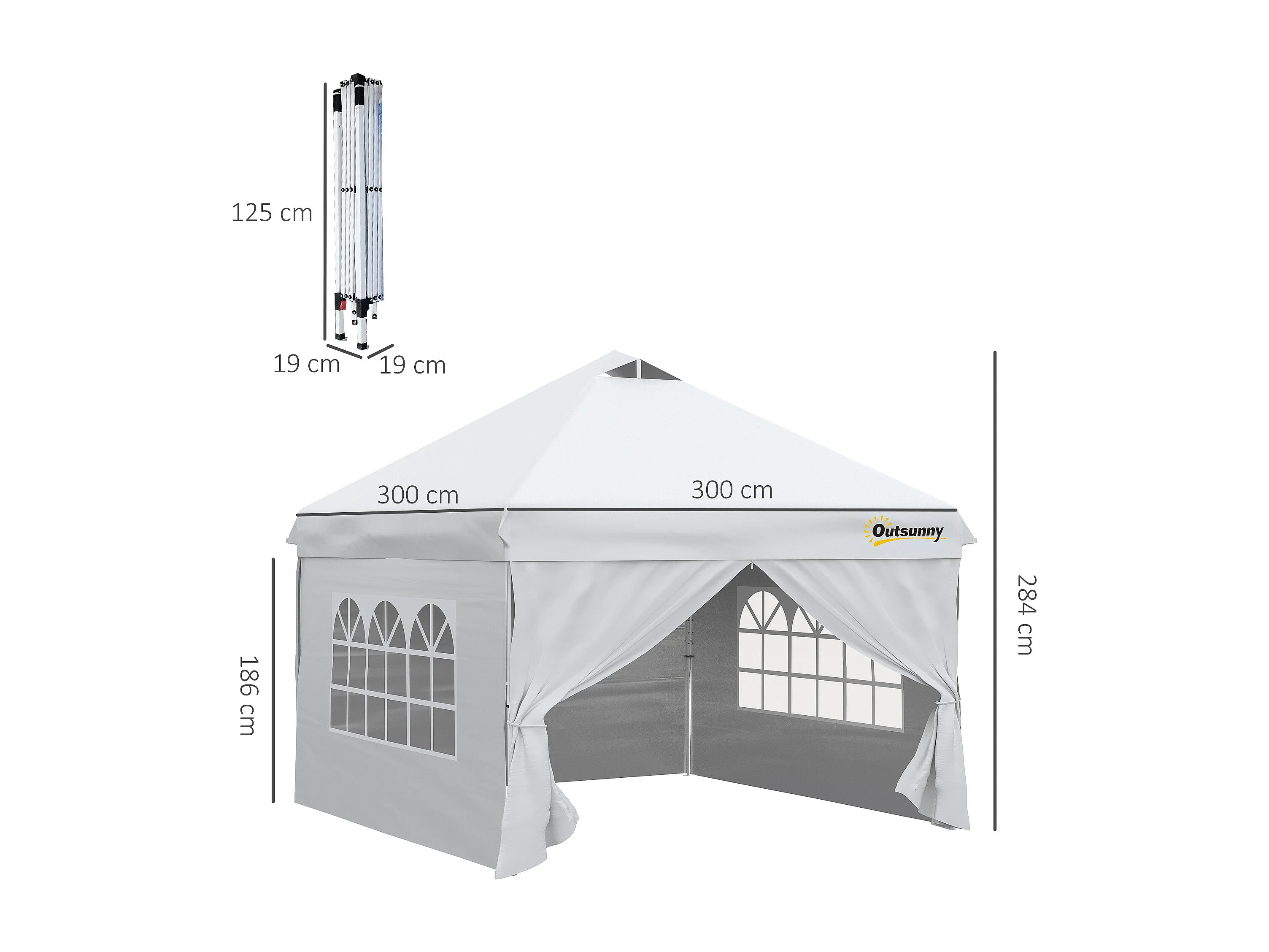 Tonnelle barnum pliant pop-up 3L x 3l x 2,84H m 4 parois latérales amovibles 2 fenêtres + sac de transport métal Oxford blanc