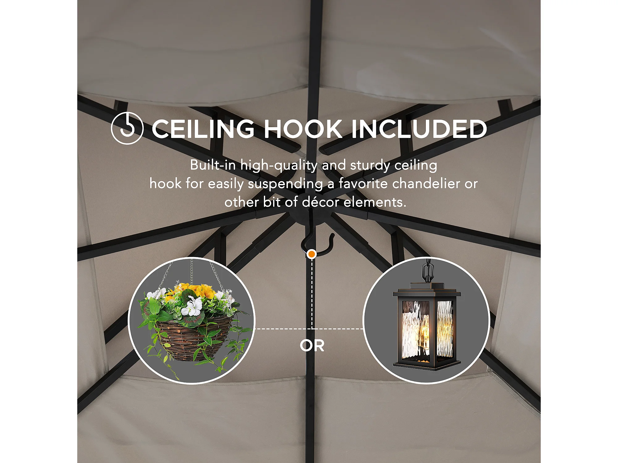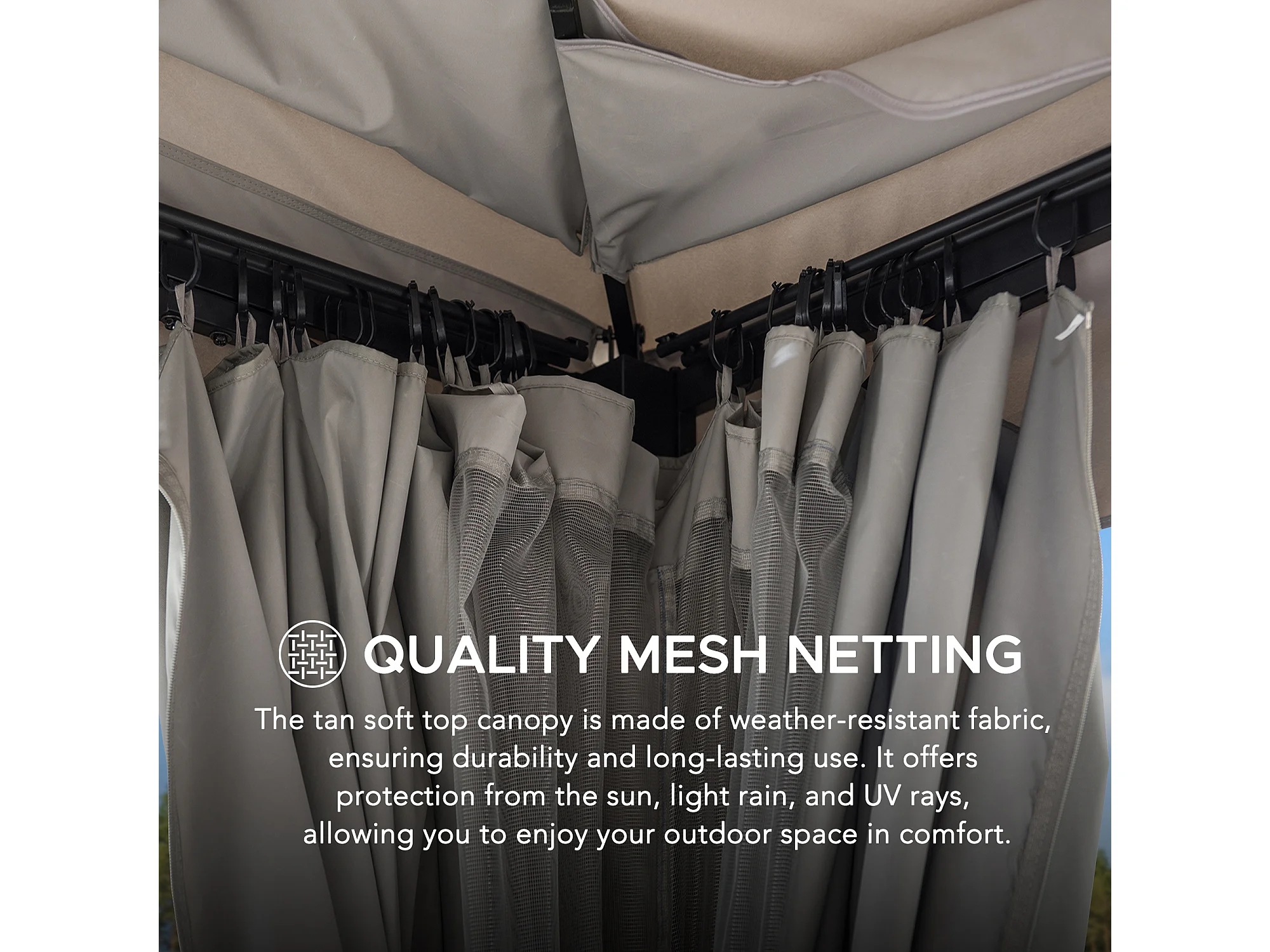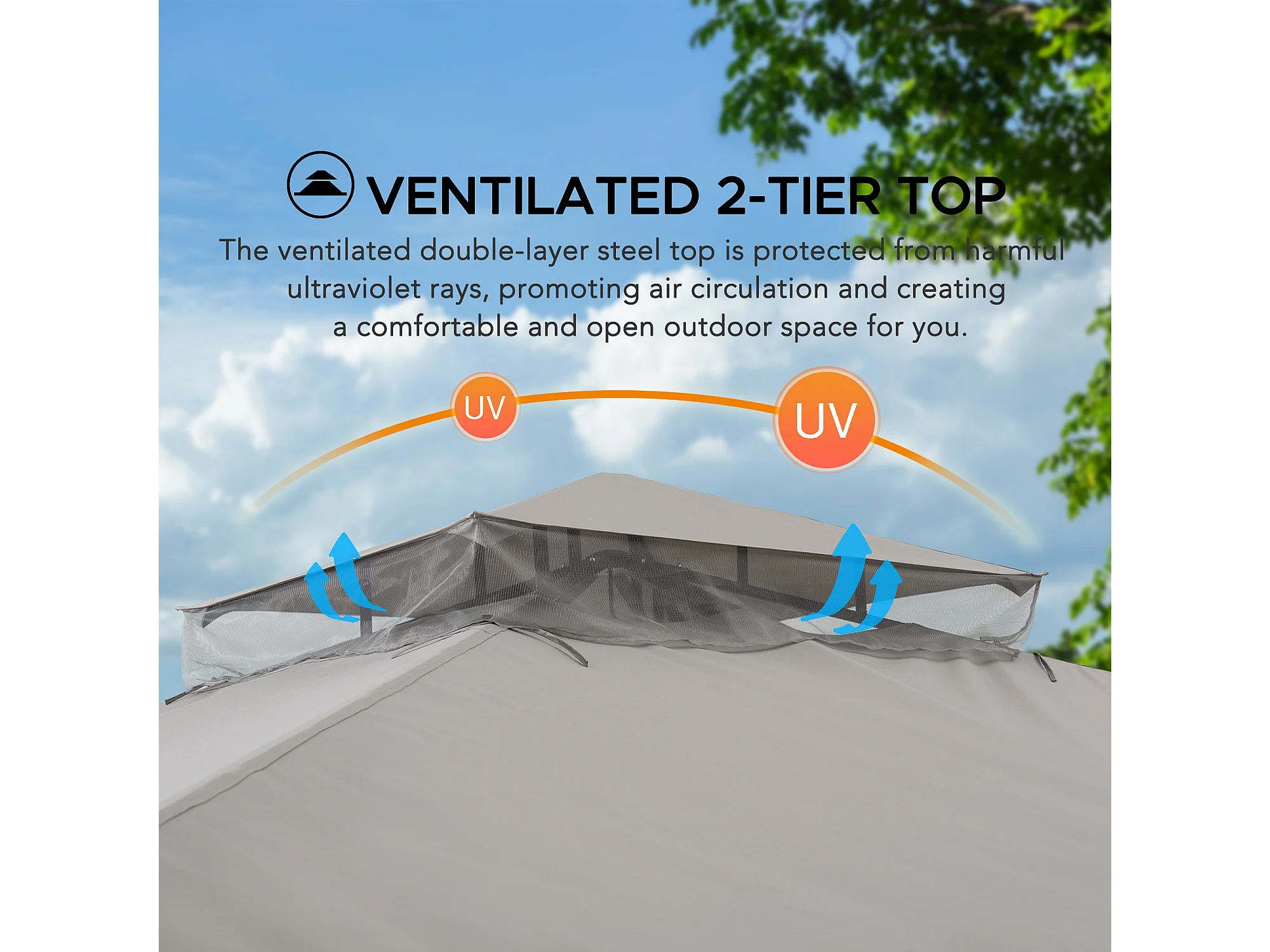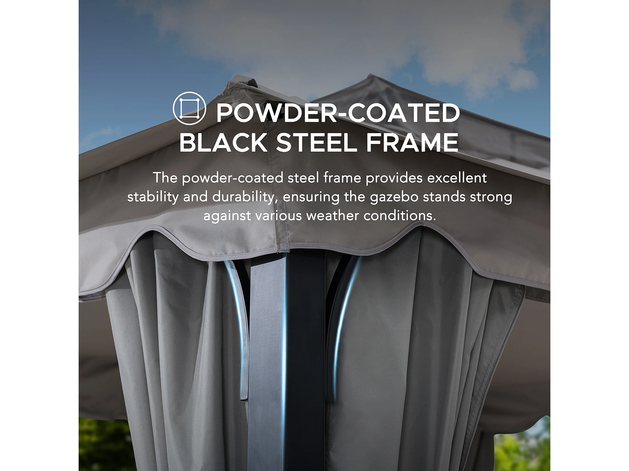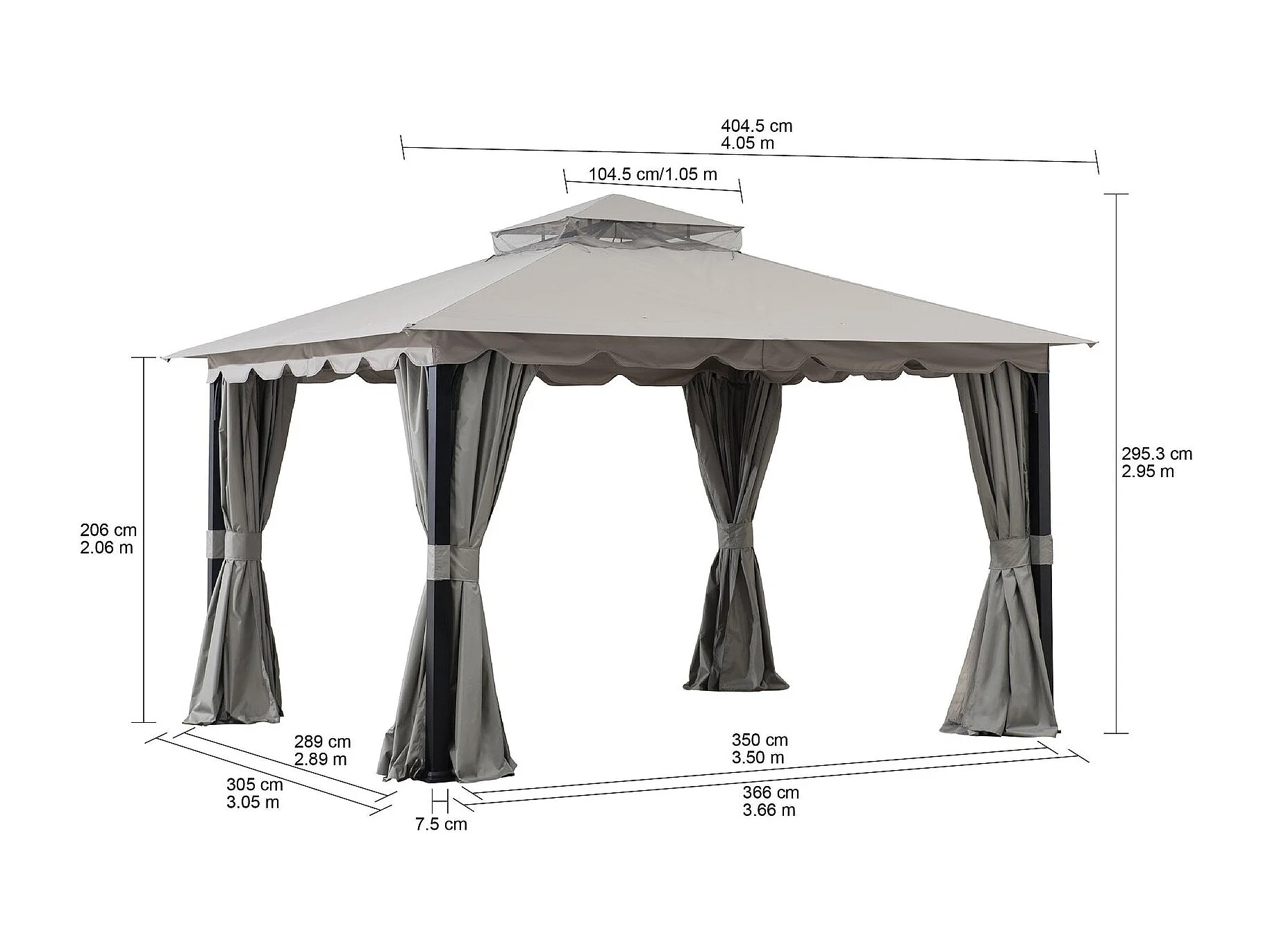 Tonnelle de jardin en acier STOJ 330cm x 396cm, toit à deux niveaux avec rideaux et moustiquaire, gris