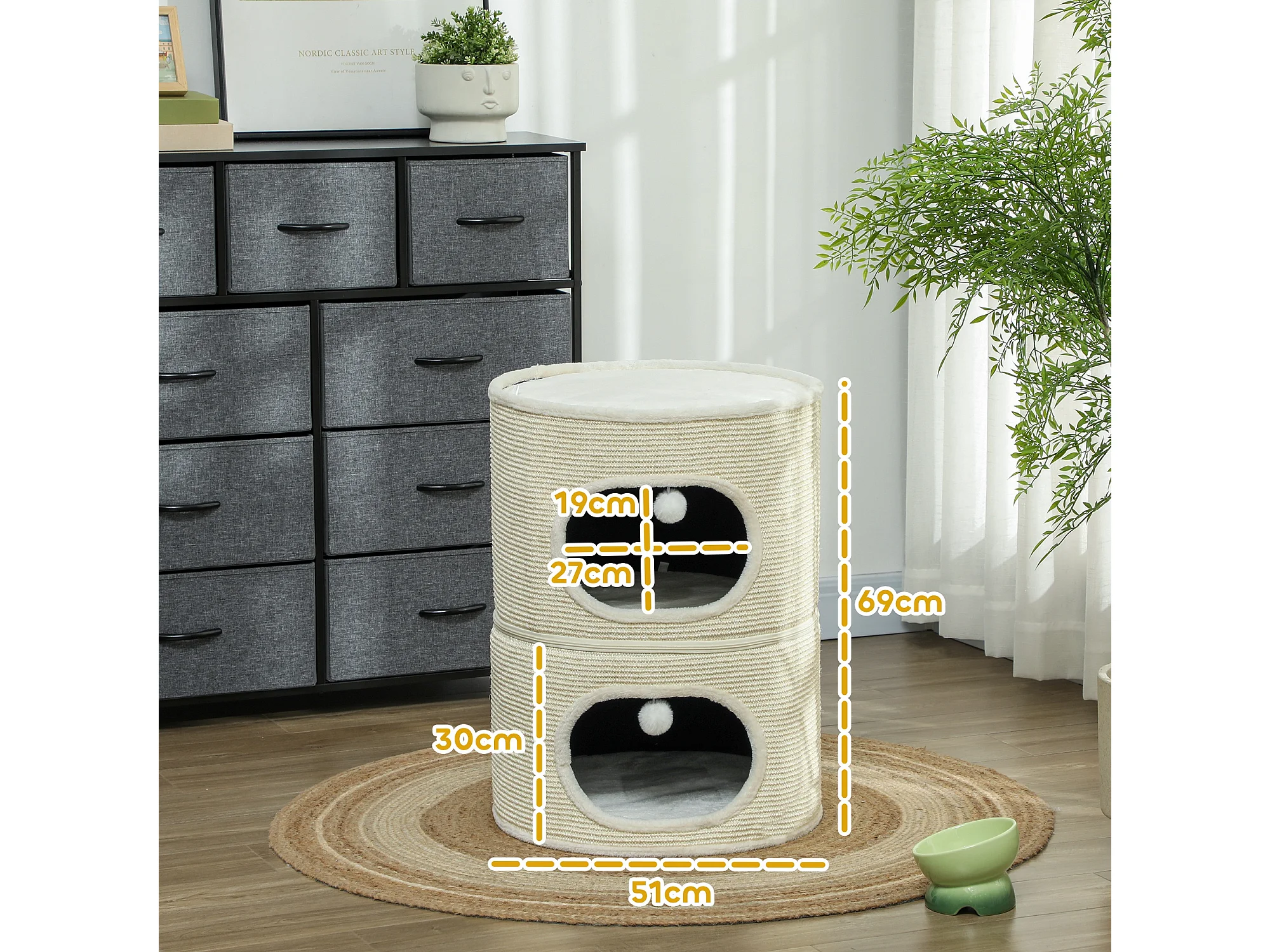 Arbre à chat cylindrique - tour à griffer pour chat - tonneau griffoir - 2 niches + plateforme - sisal peluche beige