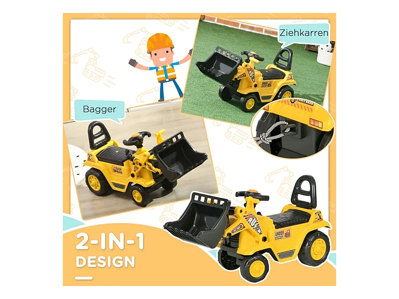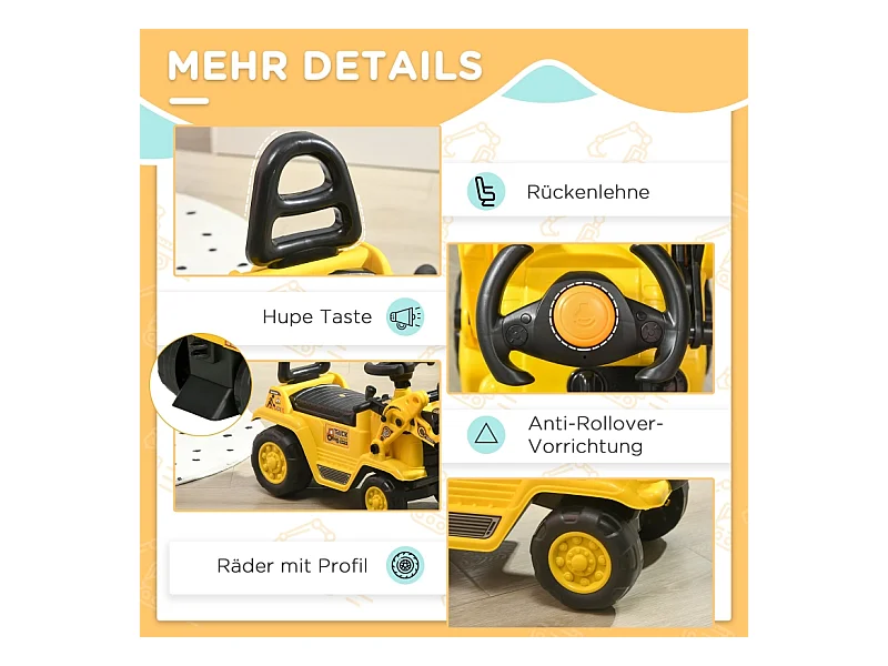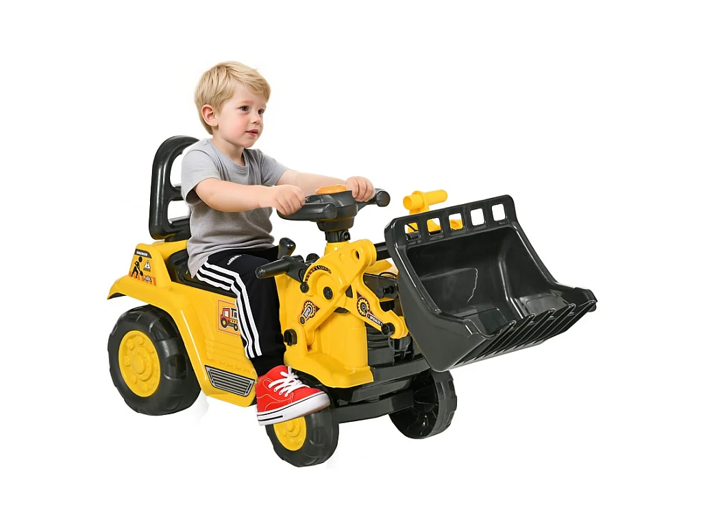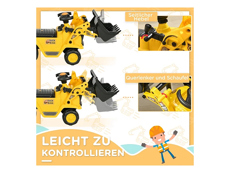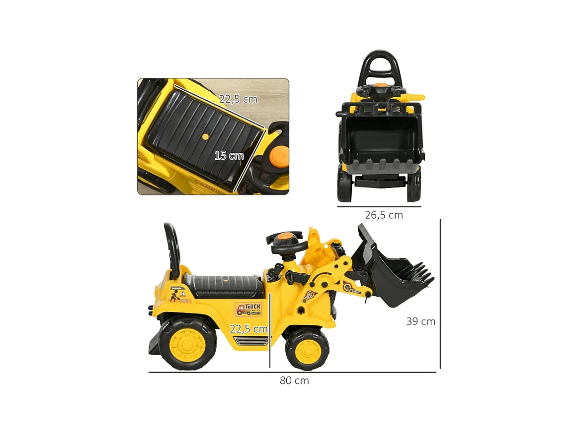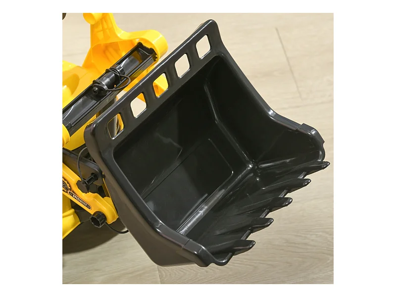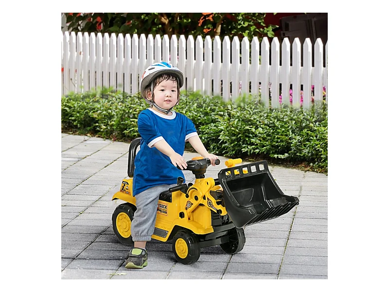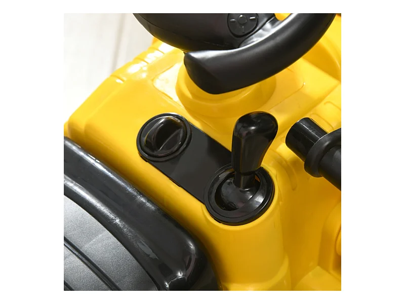 Tractopelle à chevaucher avec griffe, klaxon, effets sonores, espace de rangement, anti-basculement, plastique, jaune (83x27x39cm)