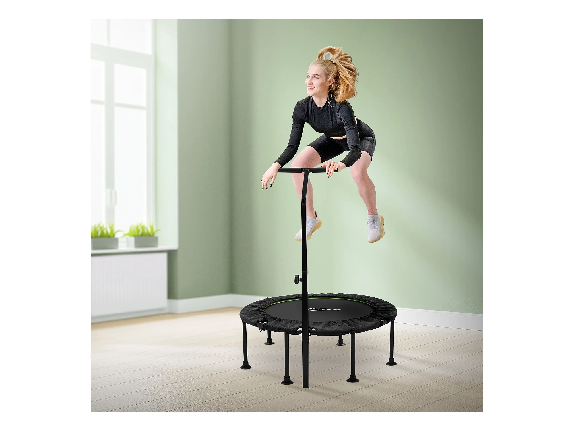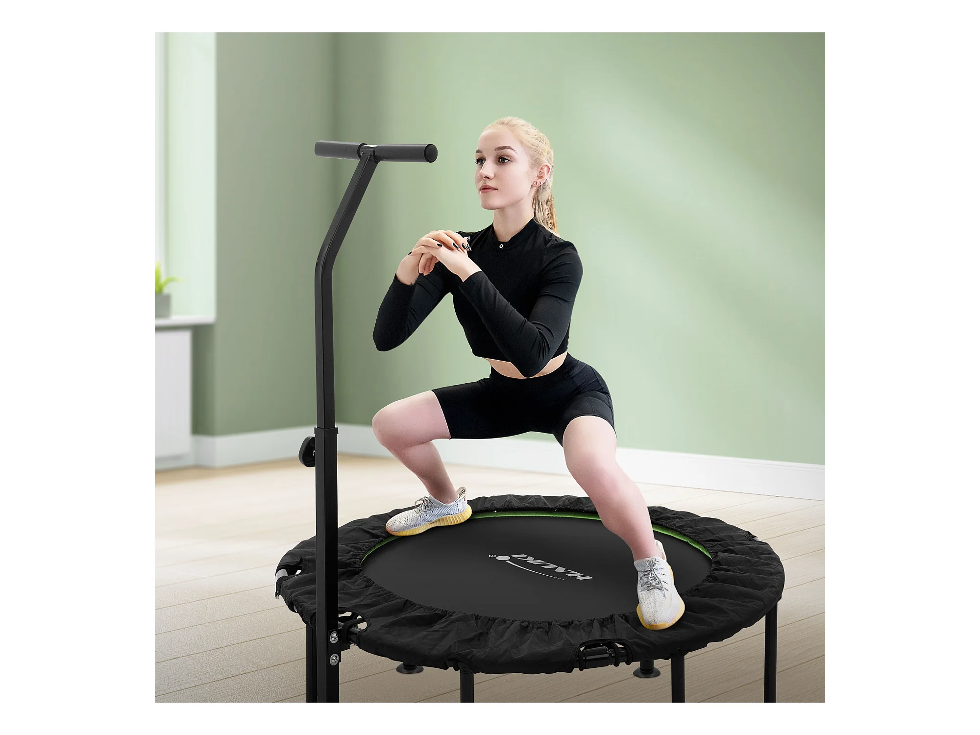 Trampoline de fitness Ø102cm vert pour intérieur barre de maintien réglable en hauteur structure acier capacité 150 kg plateforme de saut silencieuse