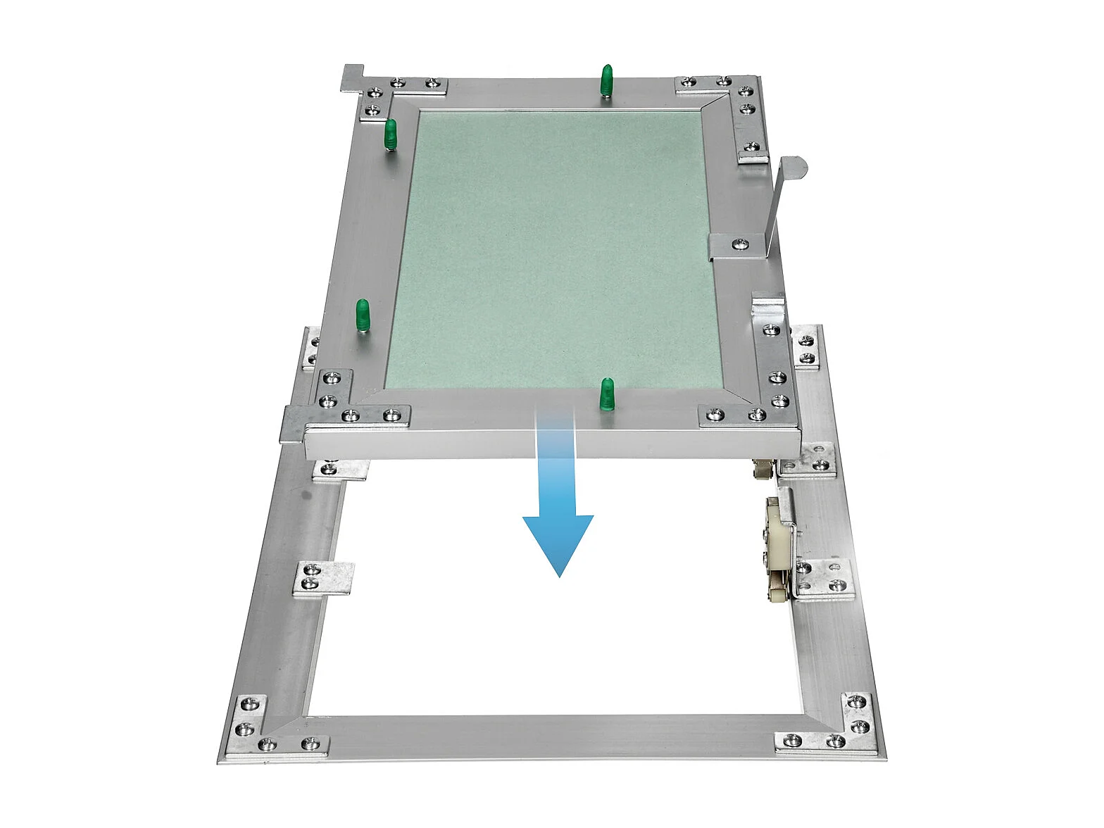 Trappe de visite 600x600 mm aluminium/vert plaque de plâtre imprégnée charnière de porte à droite/à gauche ouverture et fermeture par bouton-poussoir