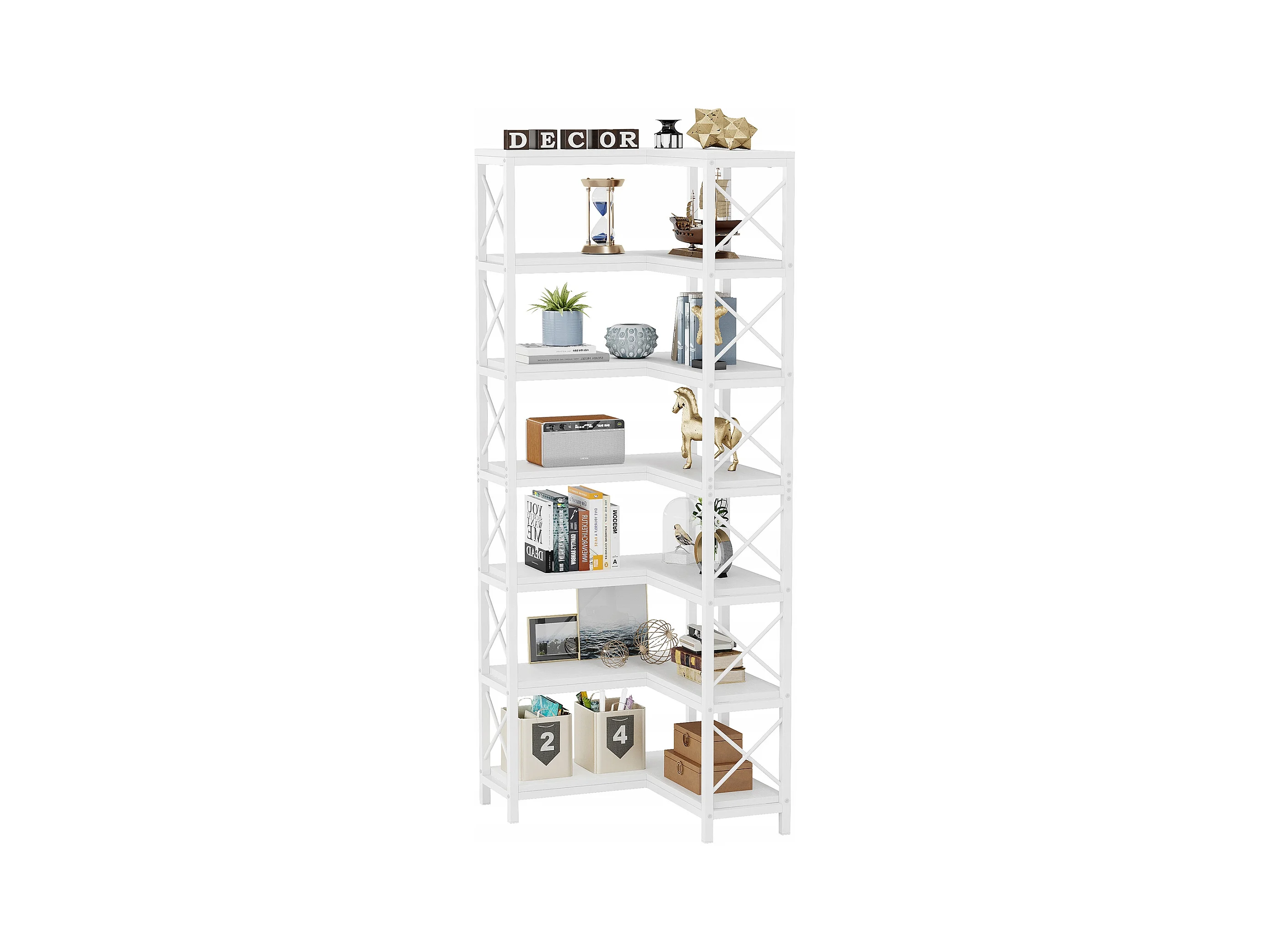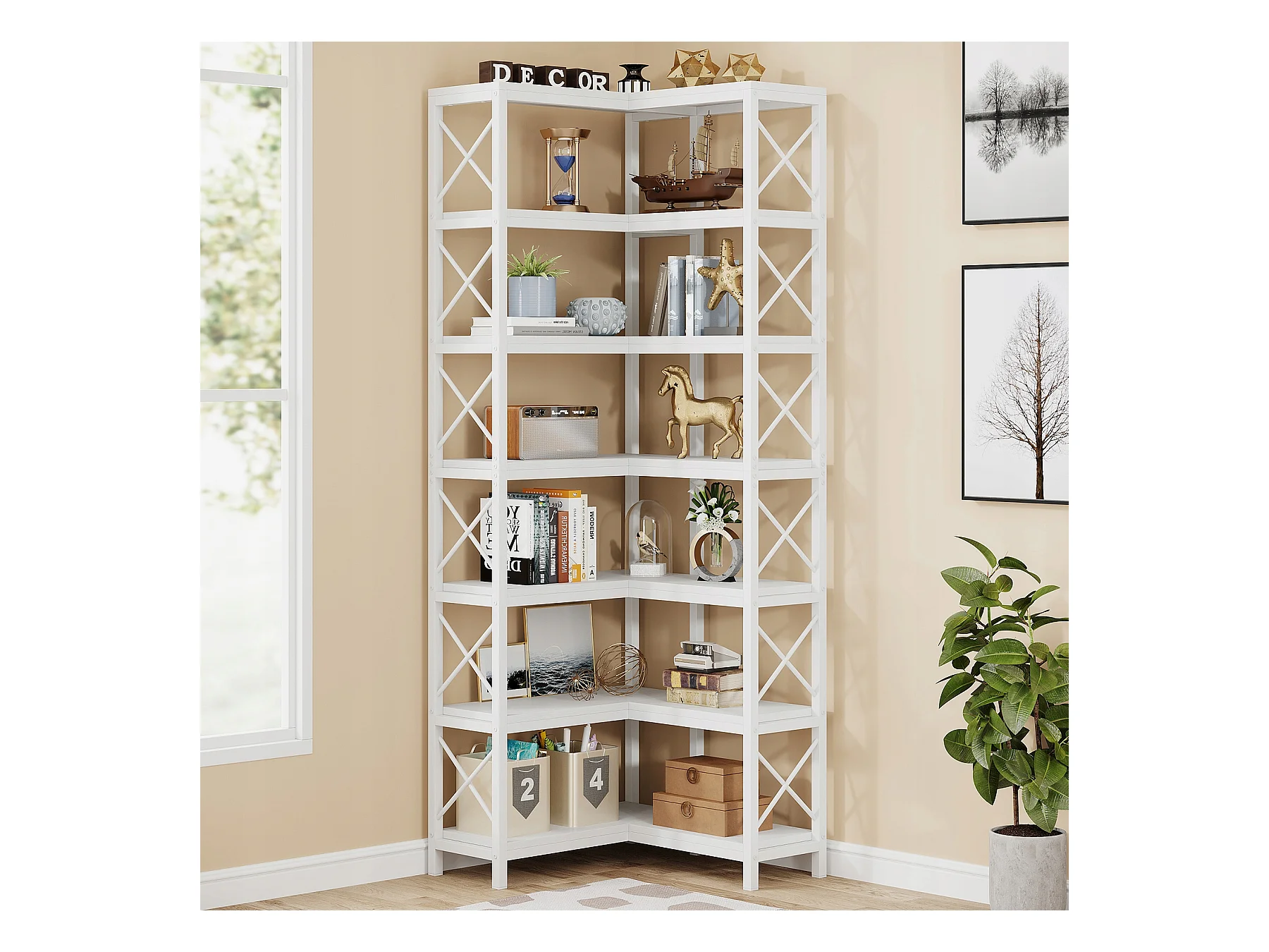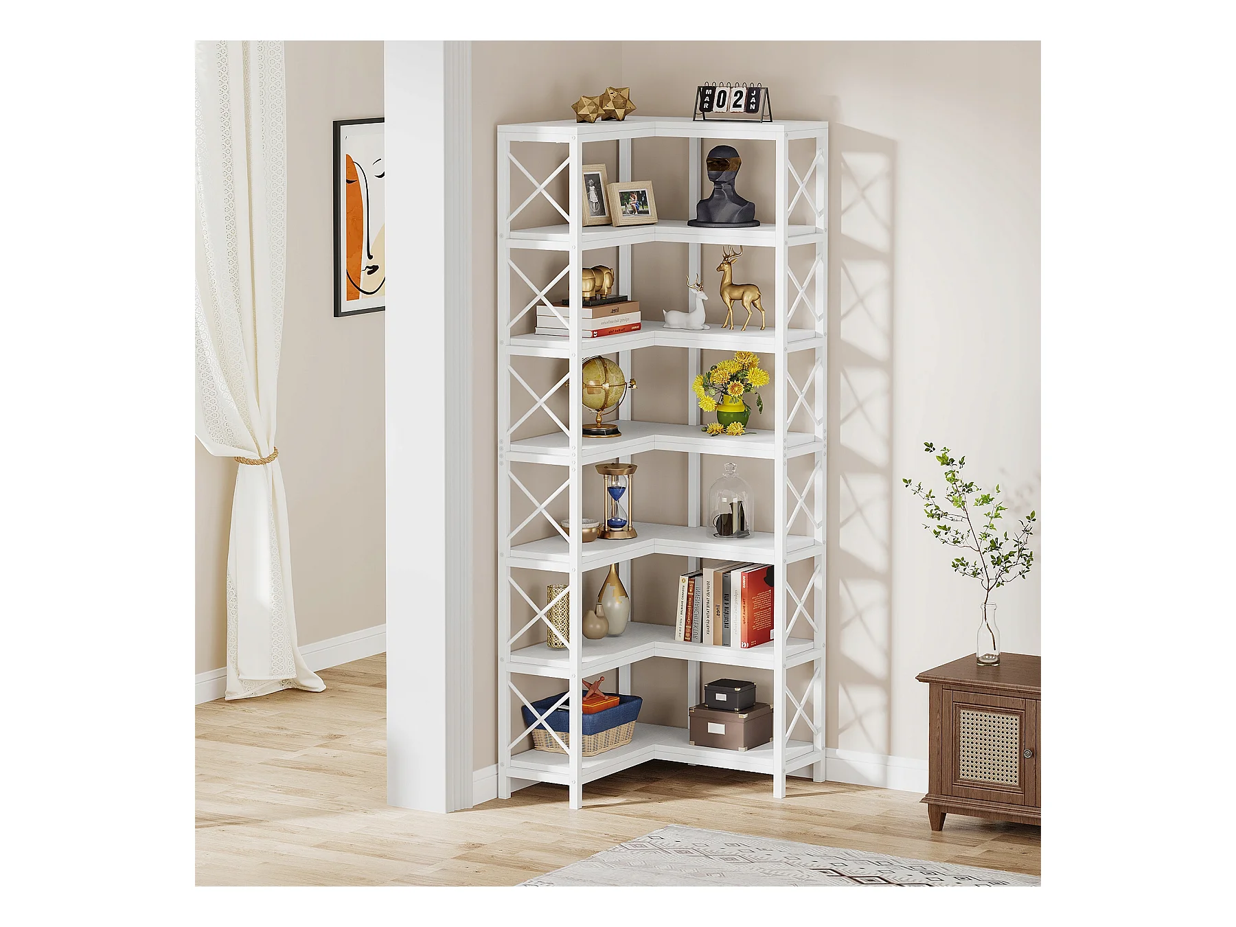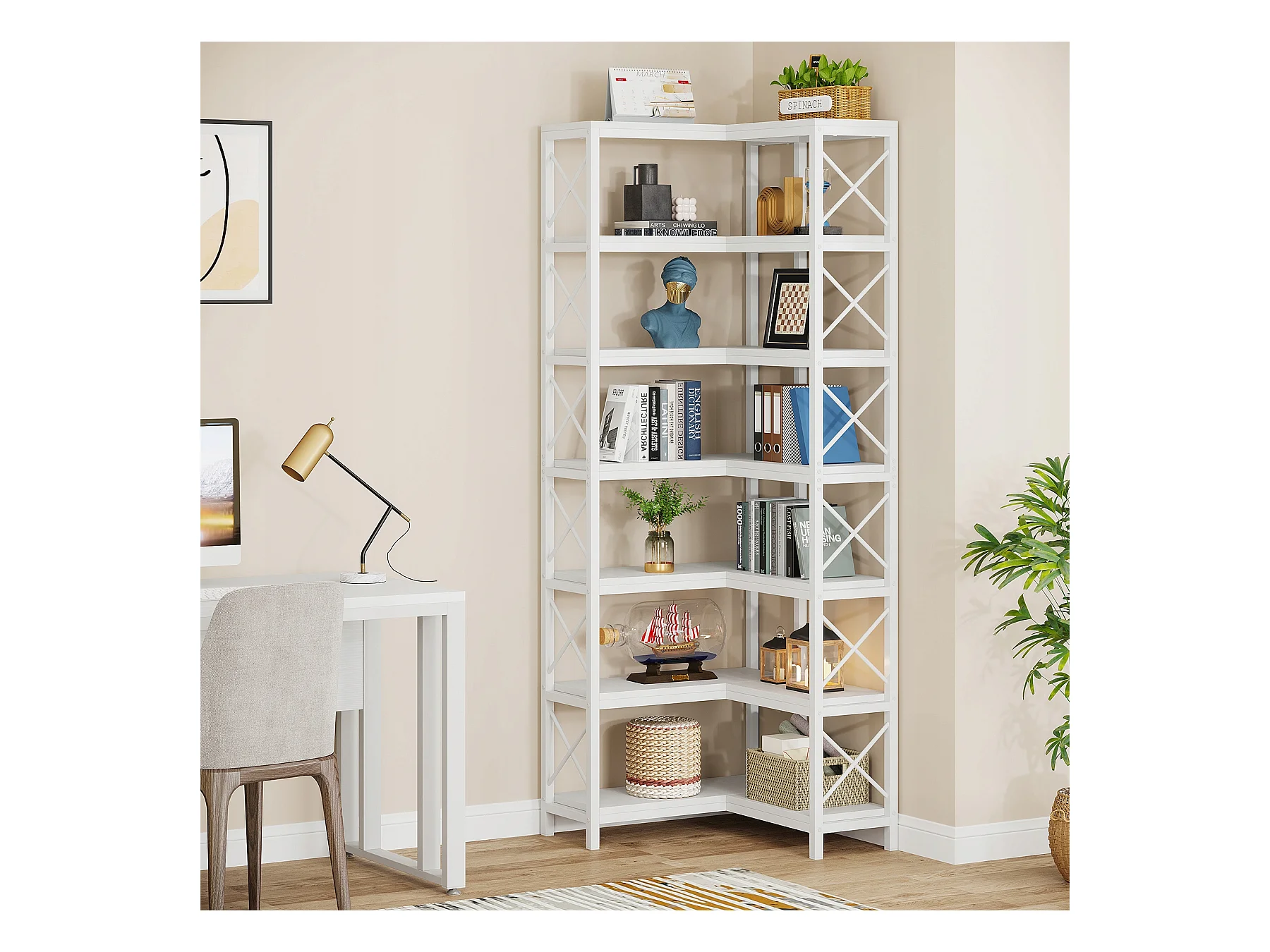 Grande bibliothèque d'angle moderne à 7 étagères avec cadre en métal pour salon, maison et bureau (blanc)