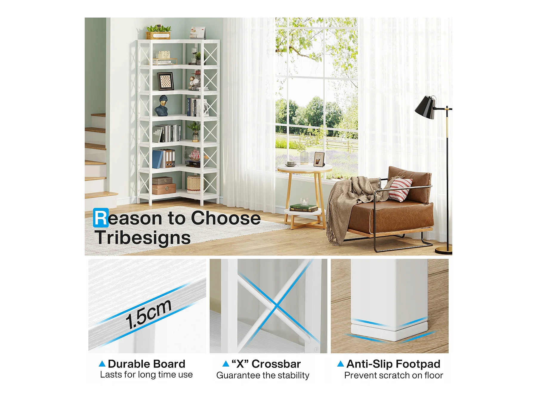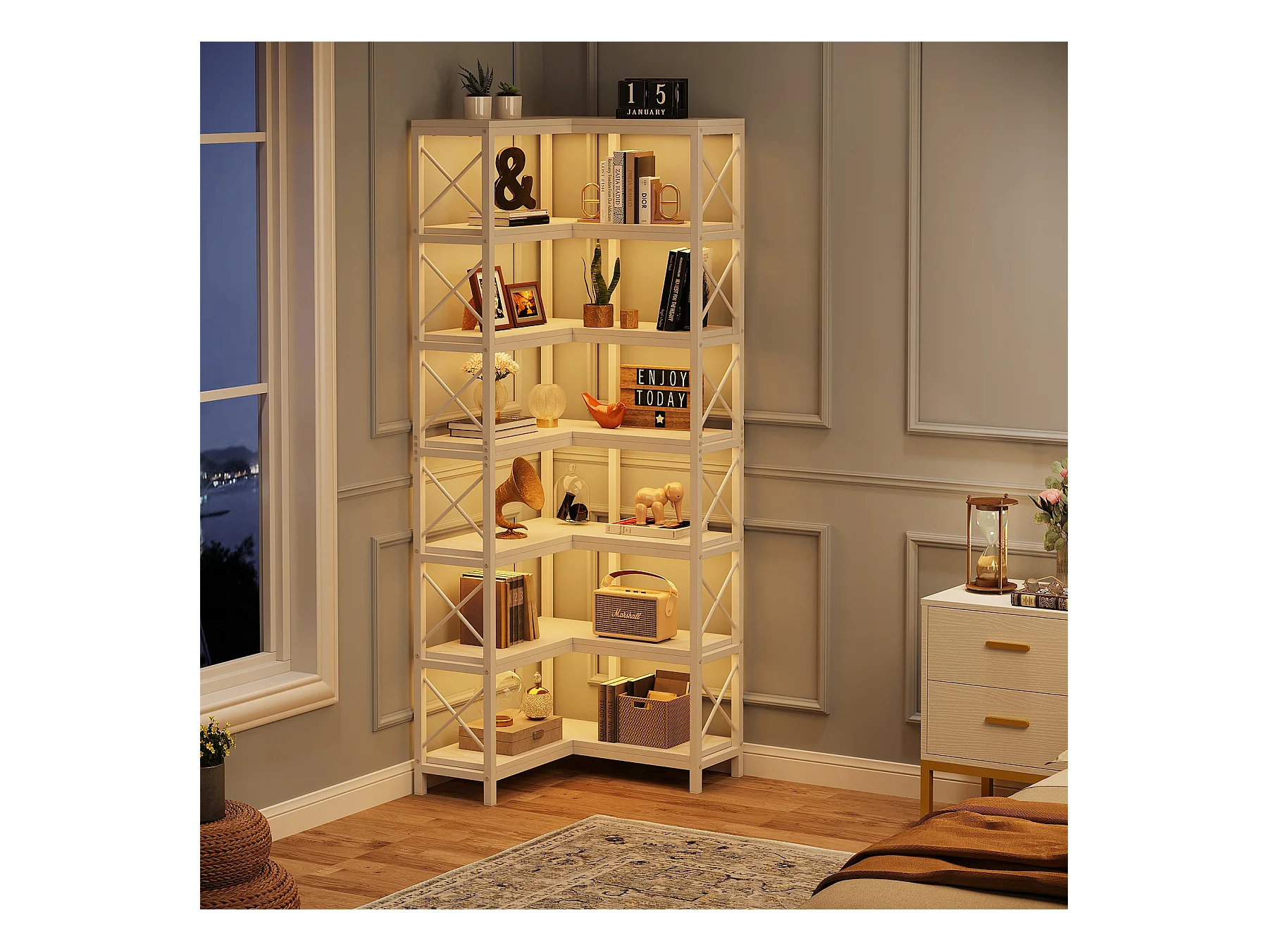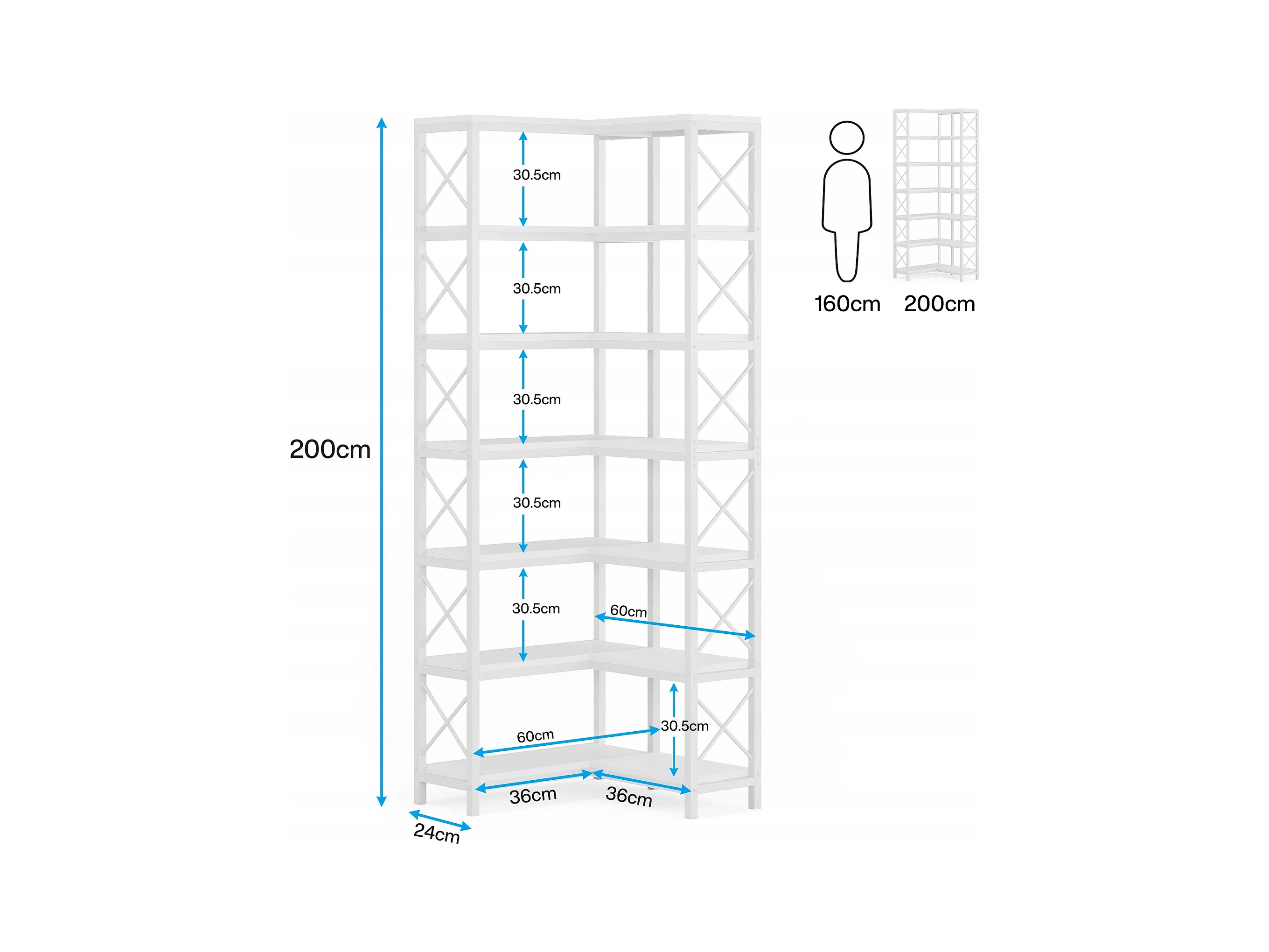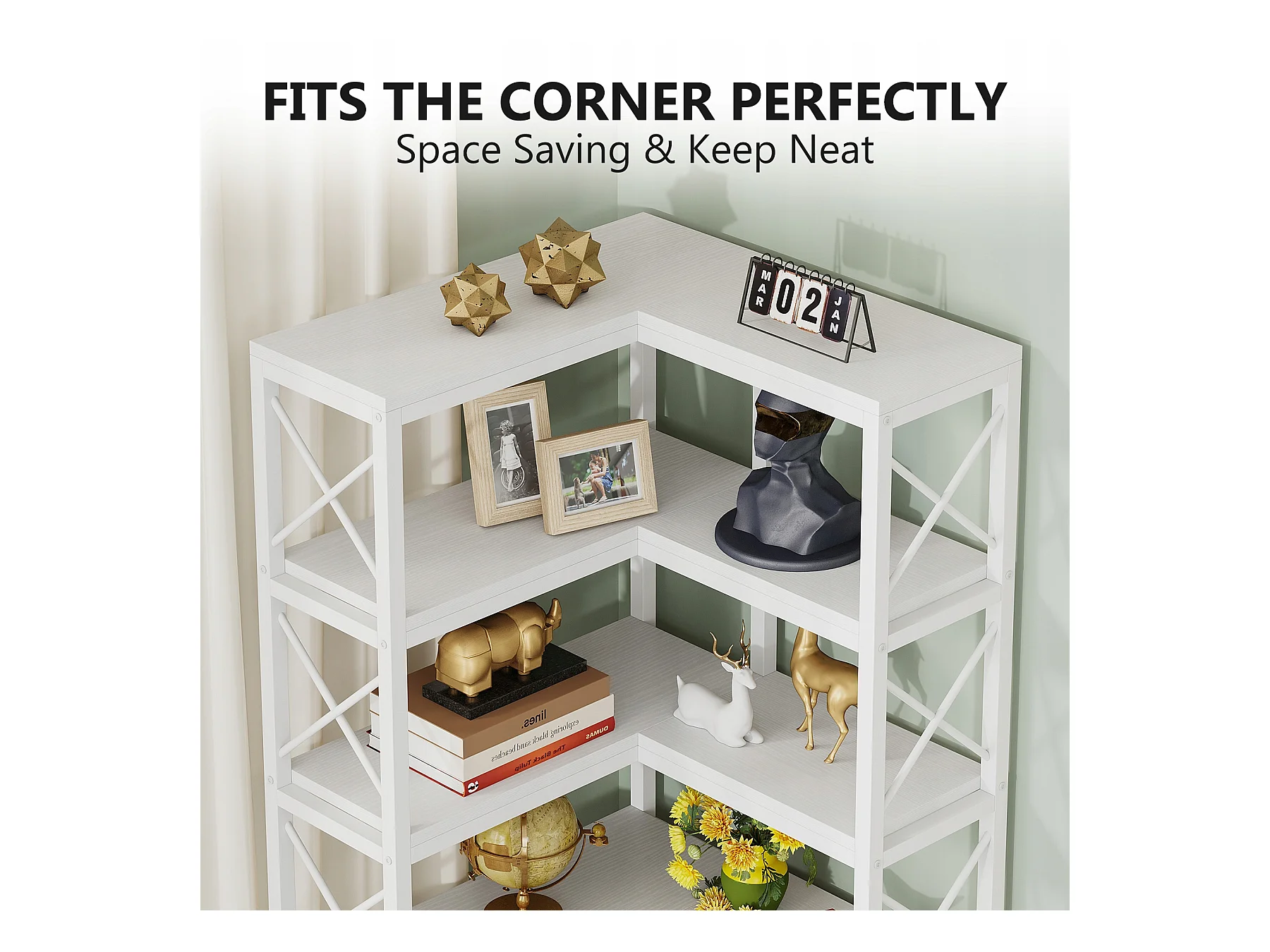 Grande bibliothèque d'angle moderne à 7 étagères avec cadre en métal pour salon, maison et bureau (blanc)
