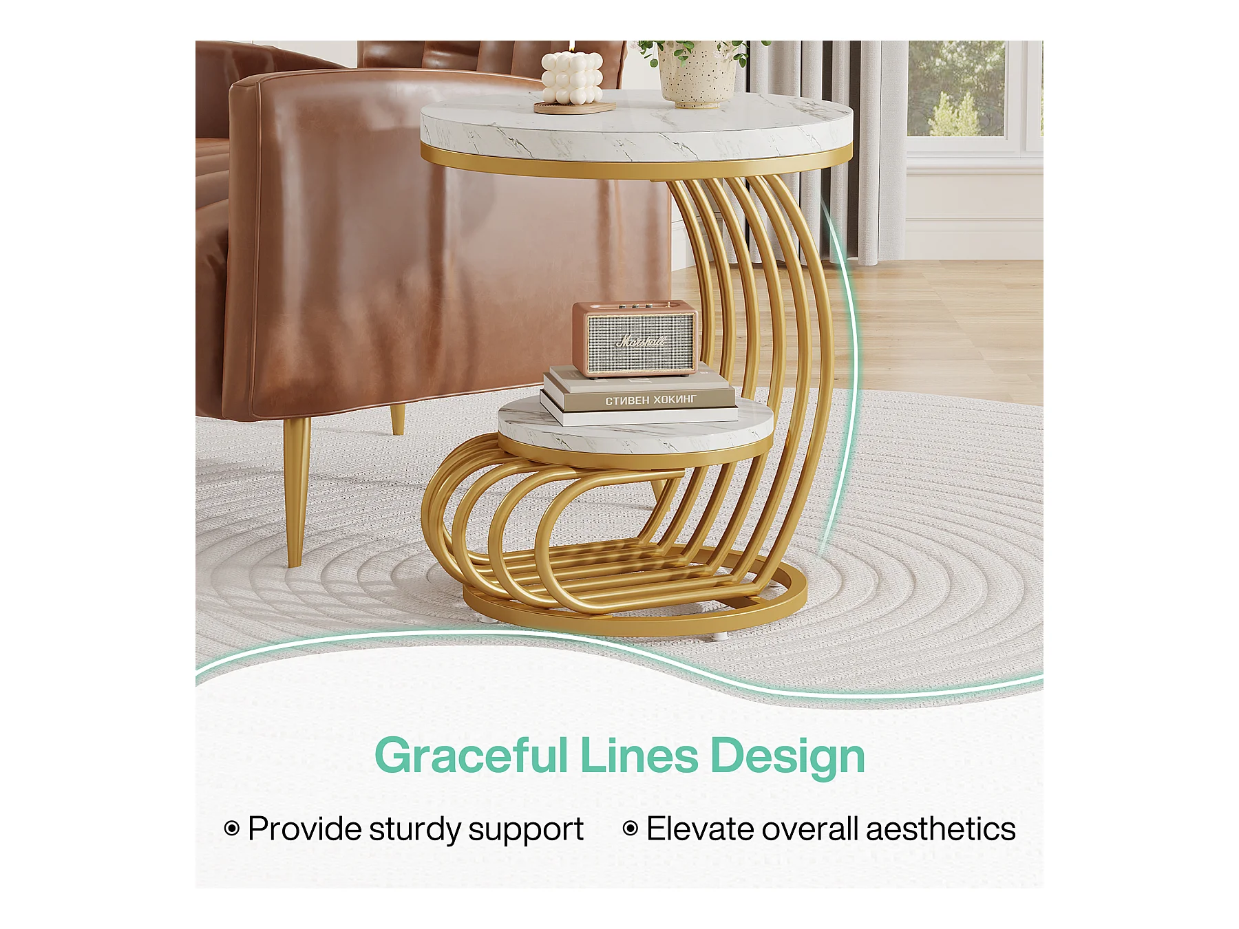 Table d'appoint Ronde Moderne à 2 Niveaux avec Cadre en Forme de C, Petite Table d'appoint Basse, Blanc/doré (1)