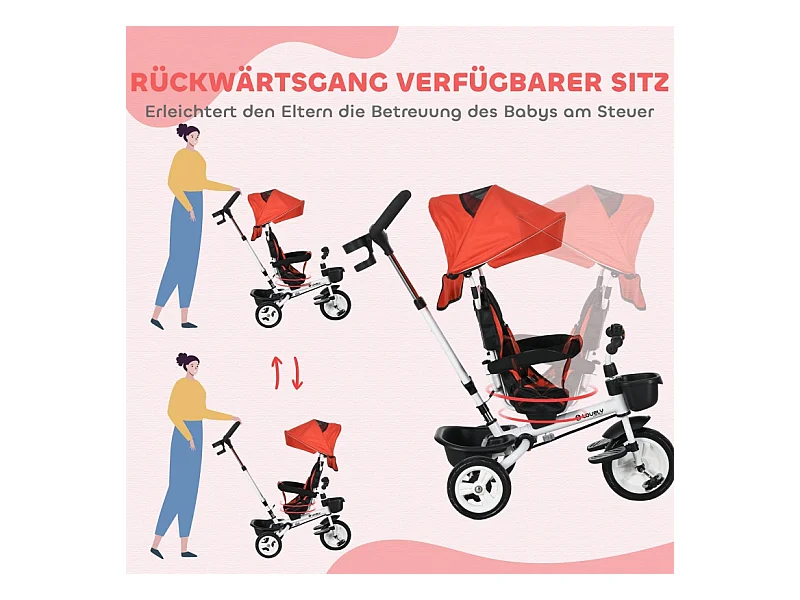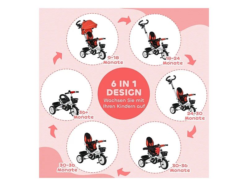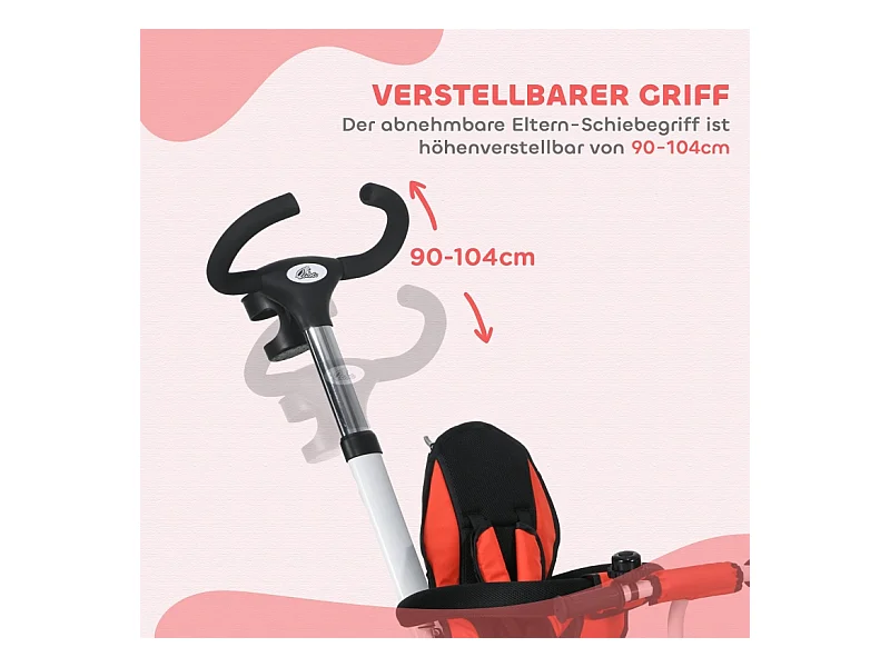Tricycle enfant 6-en-1 avec canne poussoir, siège réglable, harnais, toit amovible, panier, porte-gobelet, polyester rouge (112x50x104cm)