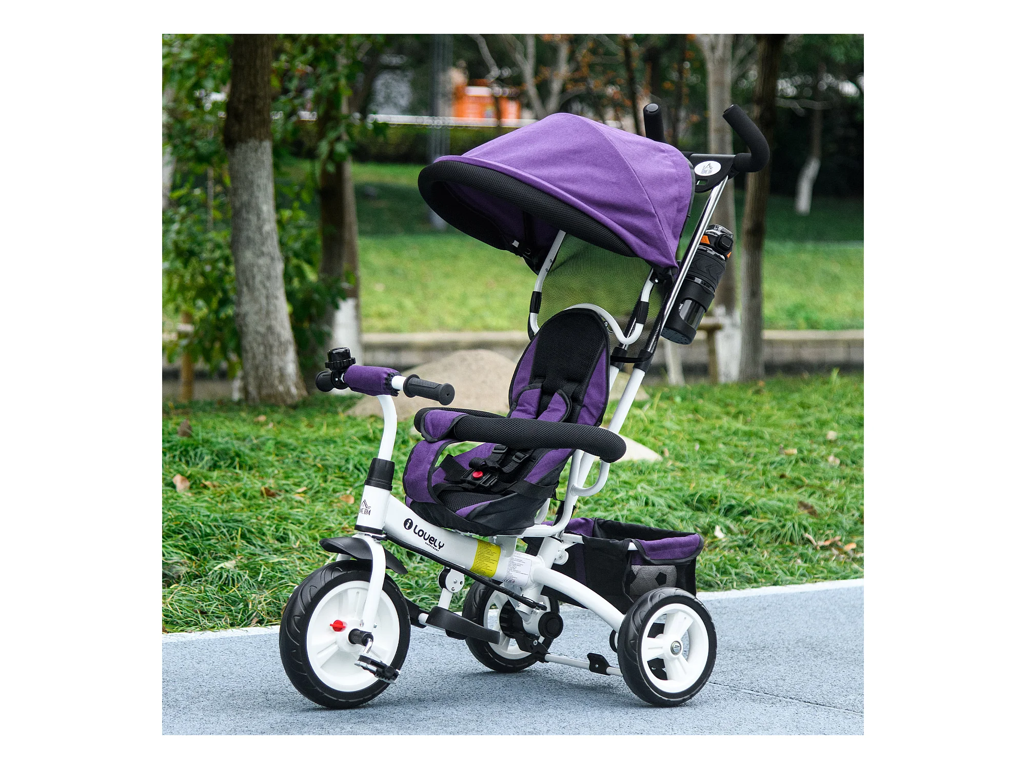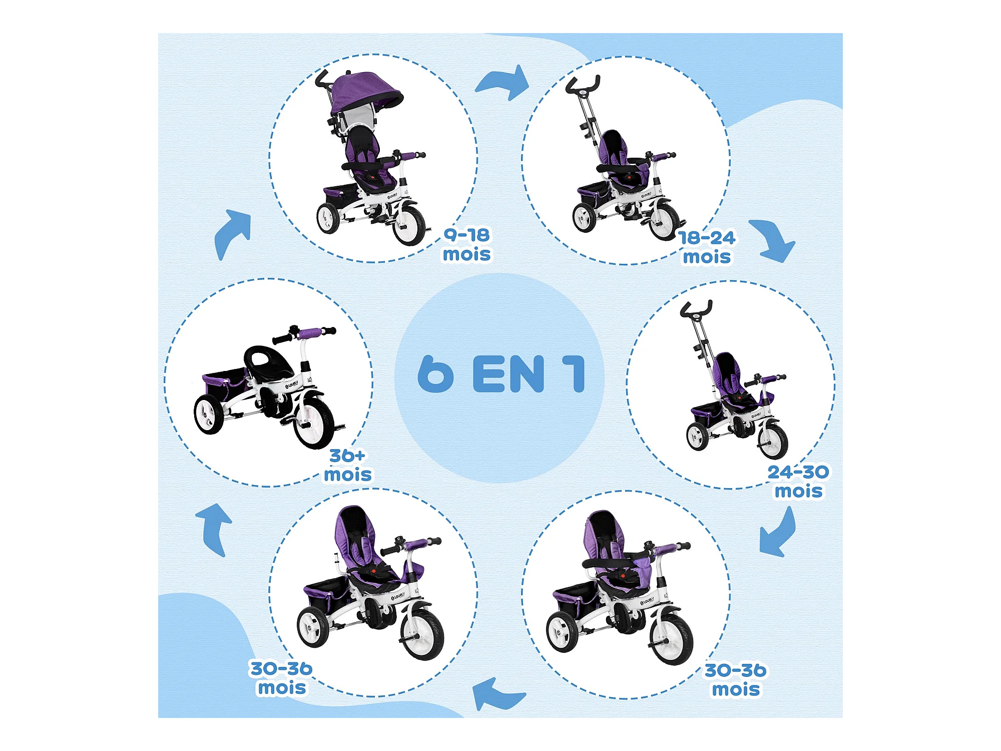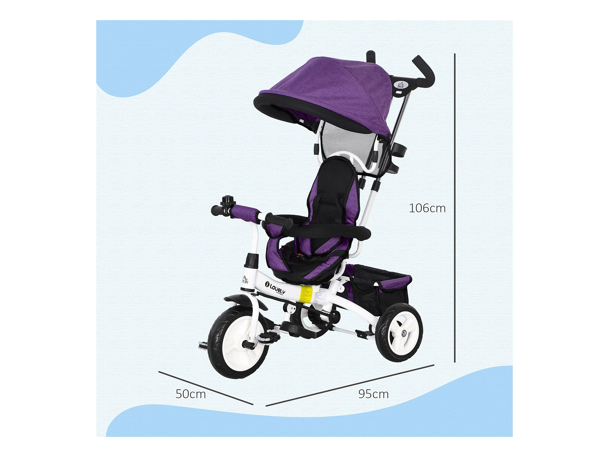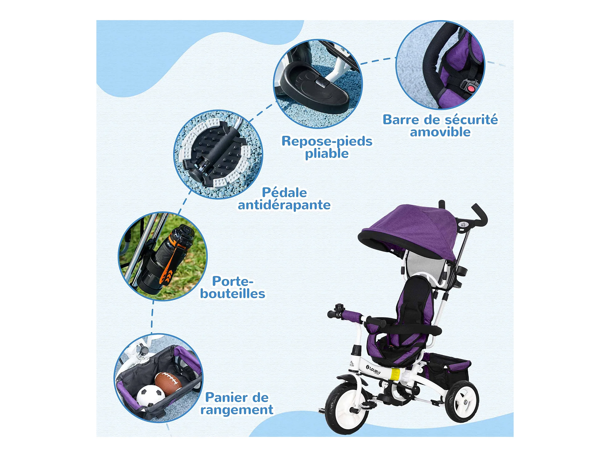 Tricycle enfant évolutif pare-soleil pliable canne télescopique amovible acier violet