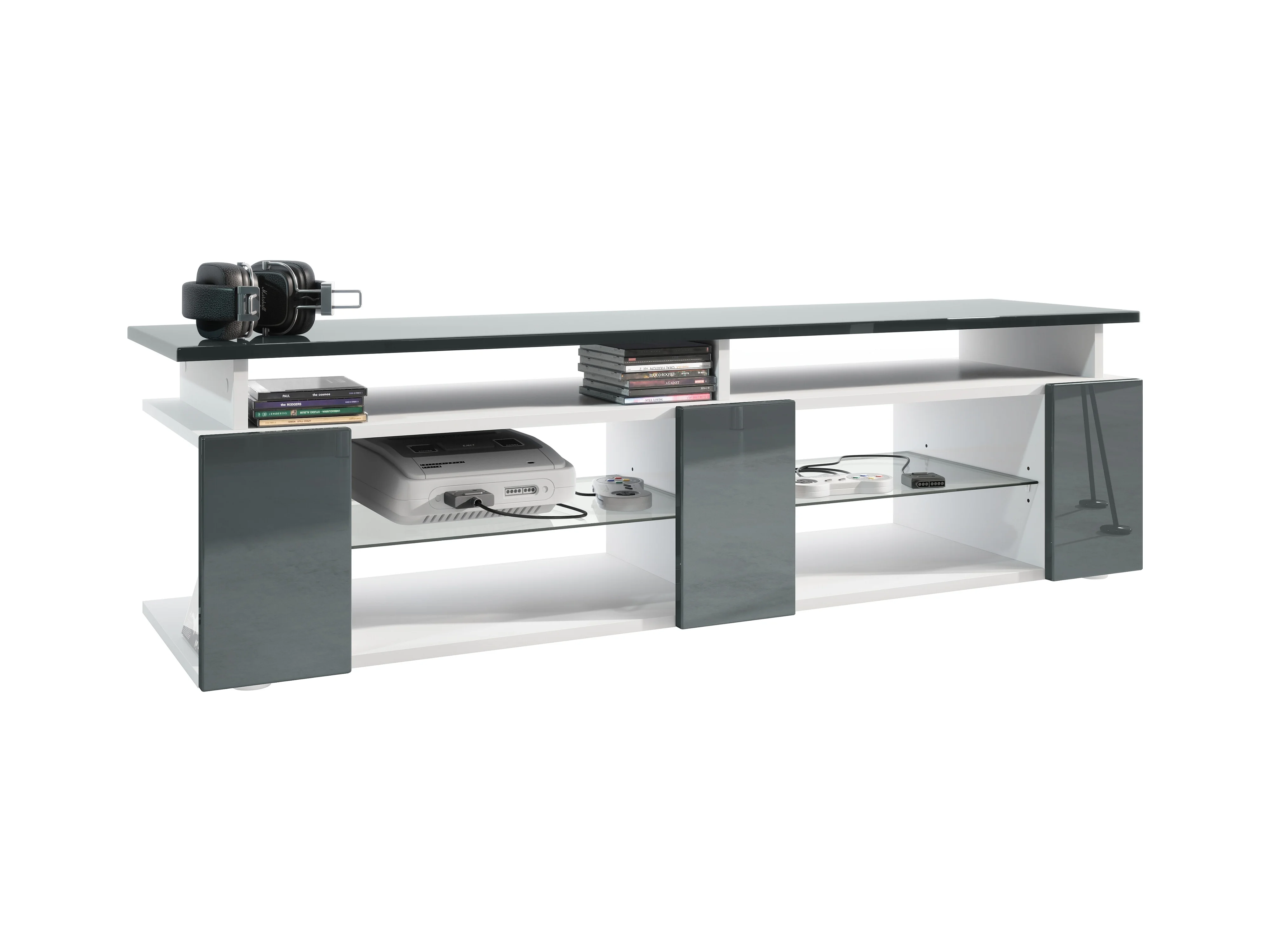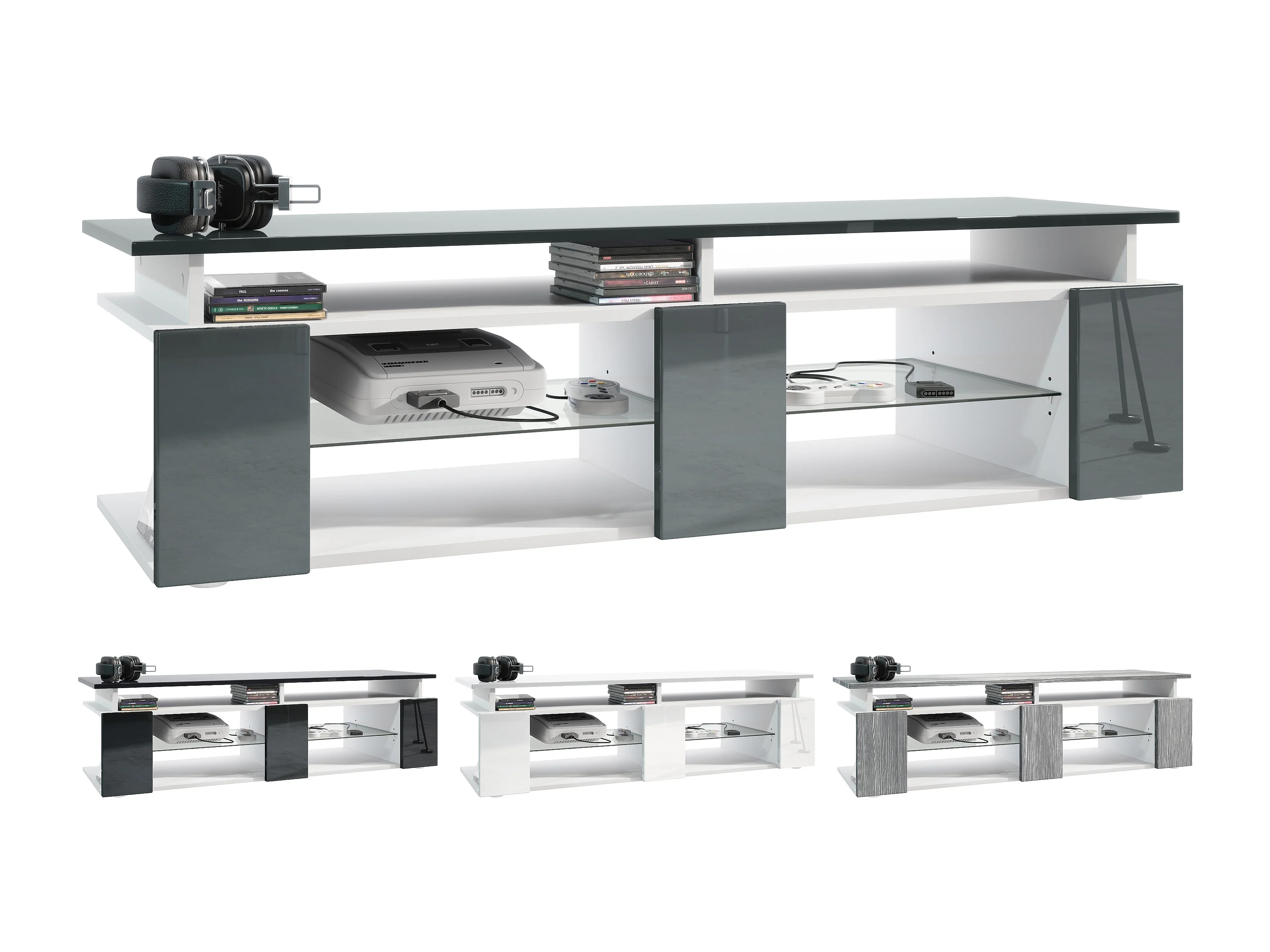 TV Board Movie V2 Game On Lowboard 138,5 x 39 x 39 cm , caisson en blanc mat, façades en gris haute brillance