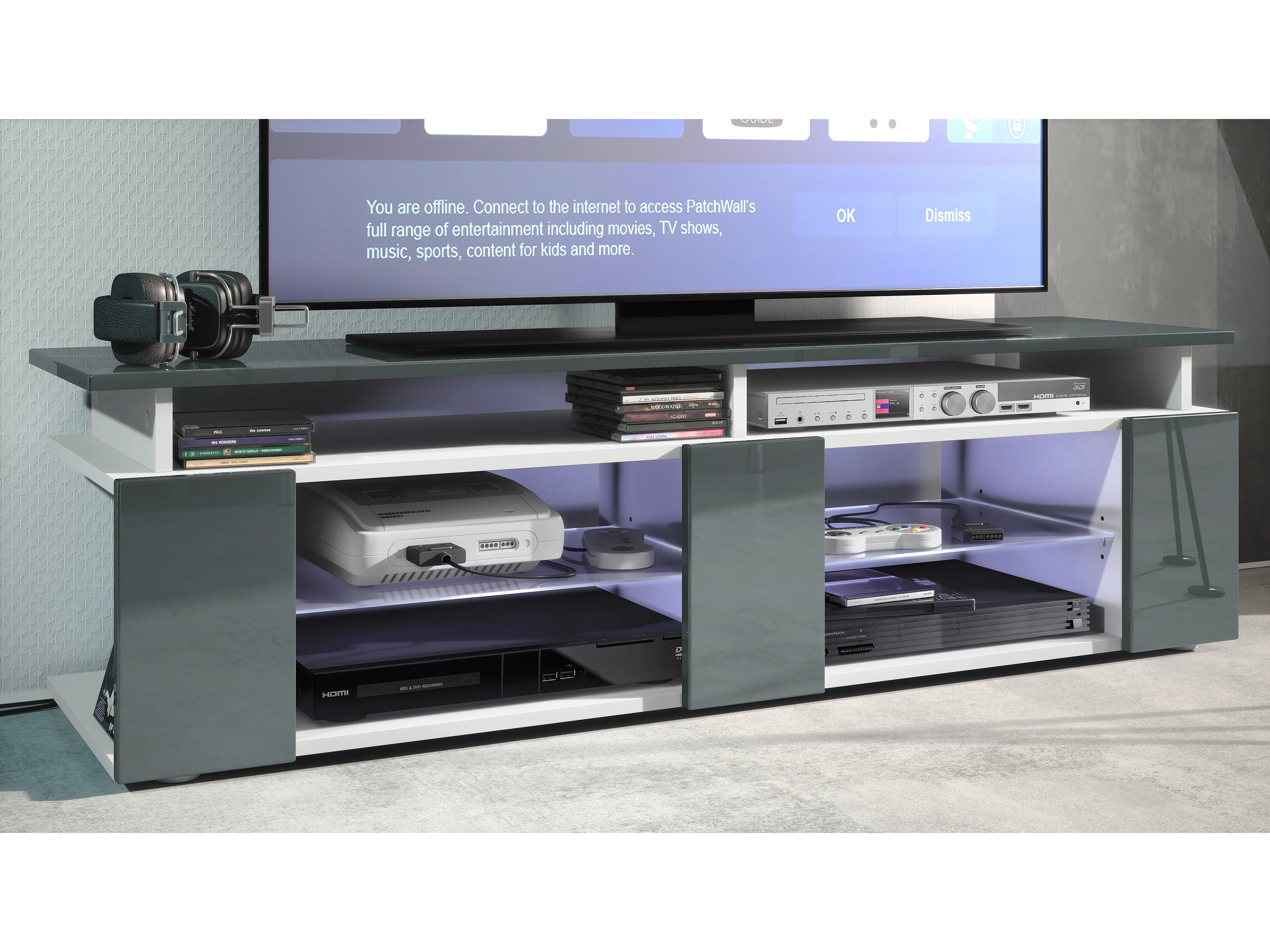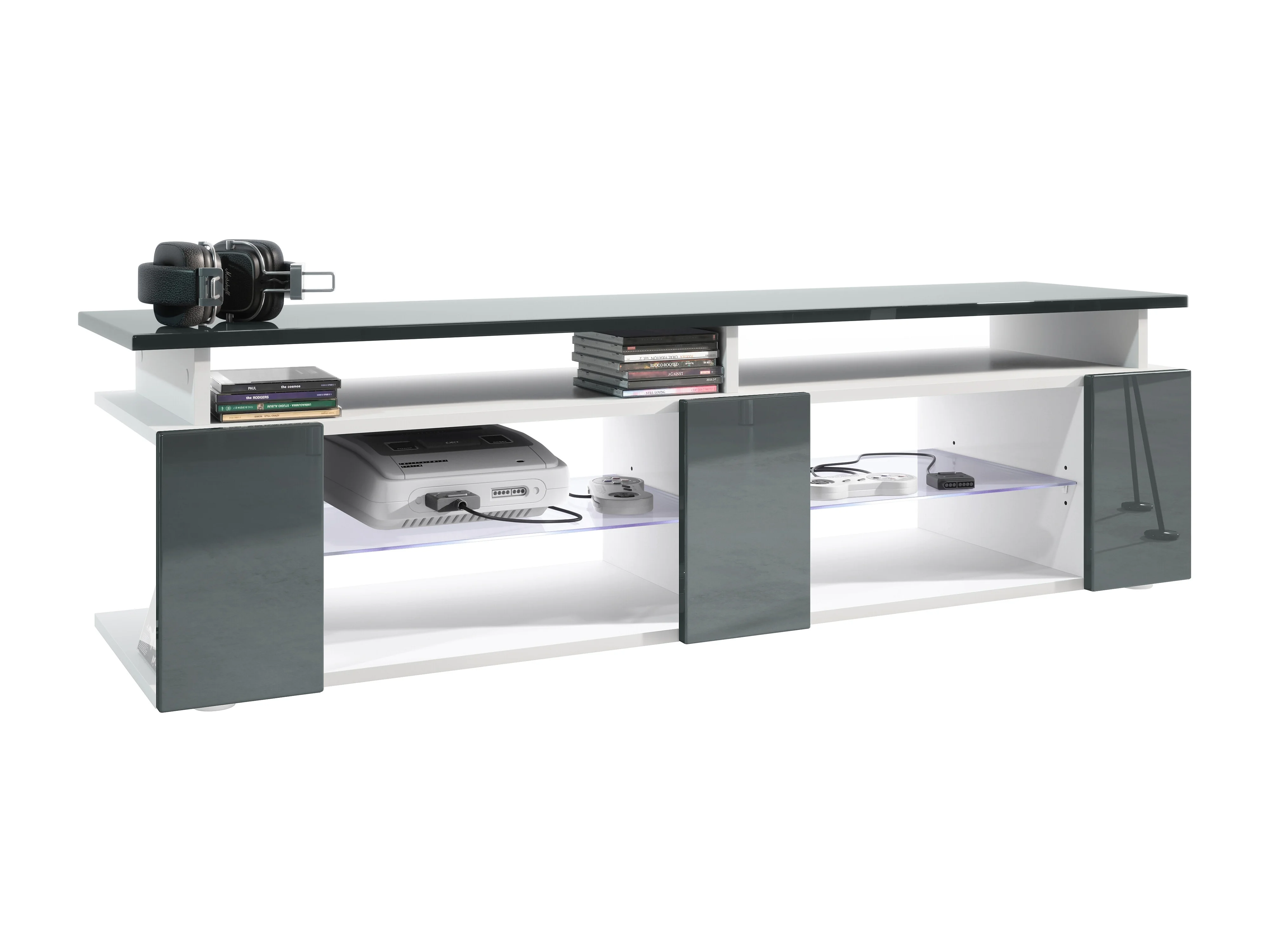 TV Board Movie V2 Game On Lowboard 138,5 x 39 x 39 cm éclairage LED inclus Blanc, caisson en blanc mat, façades en gris haute brillance