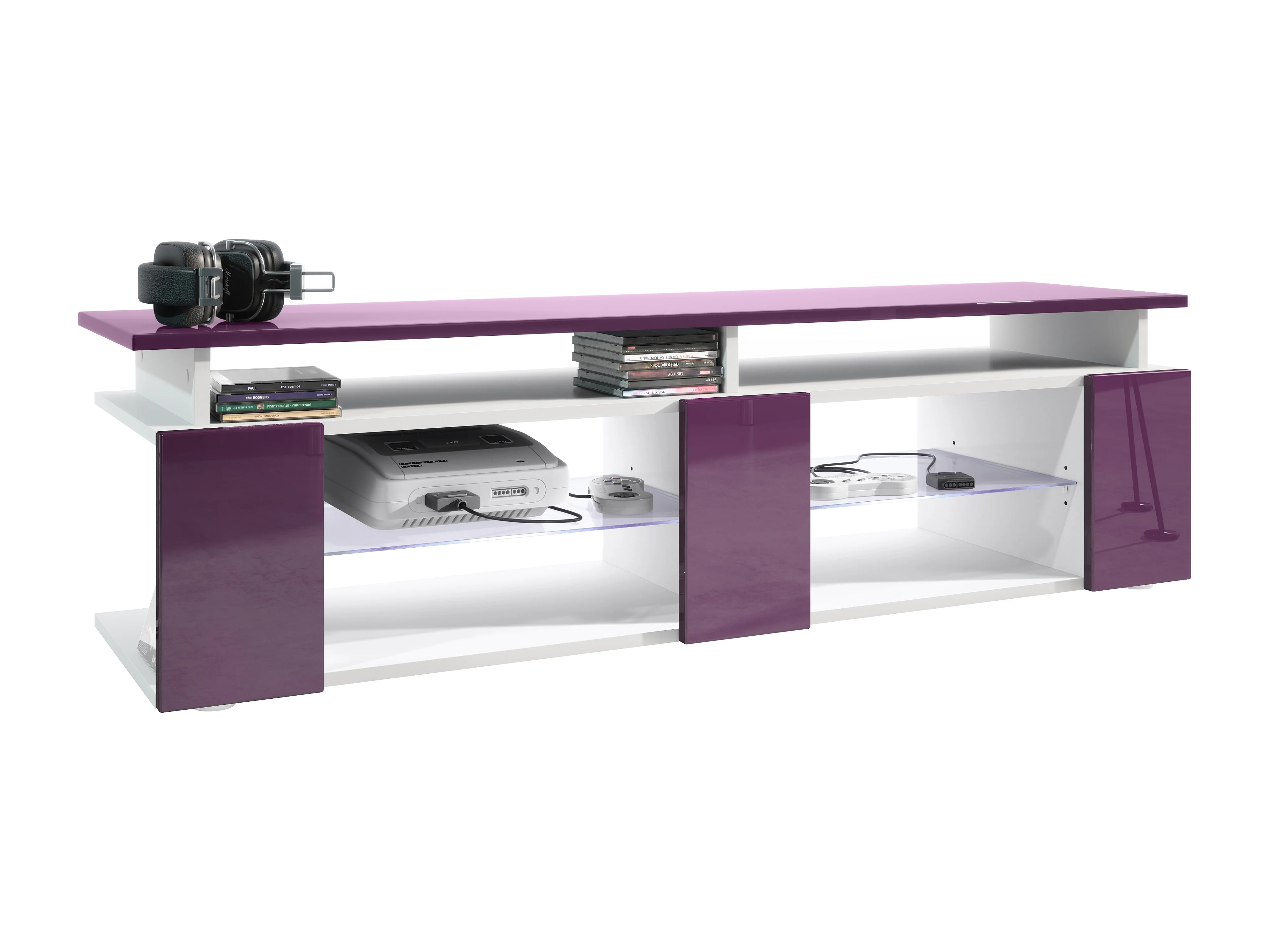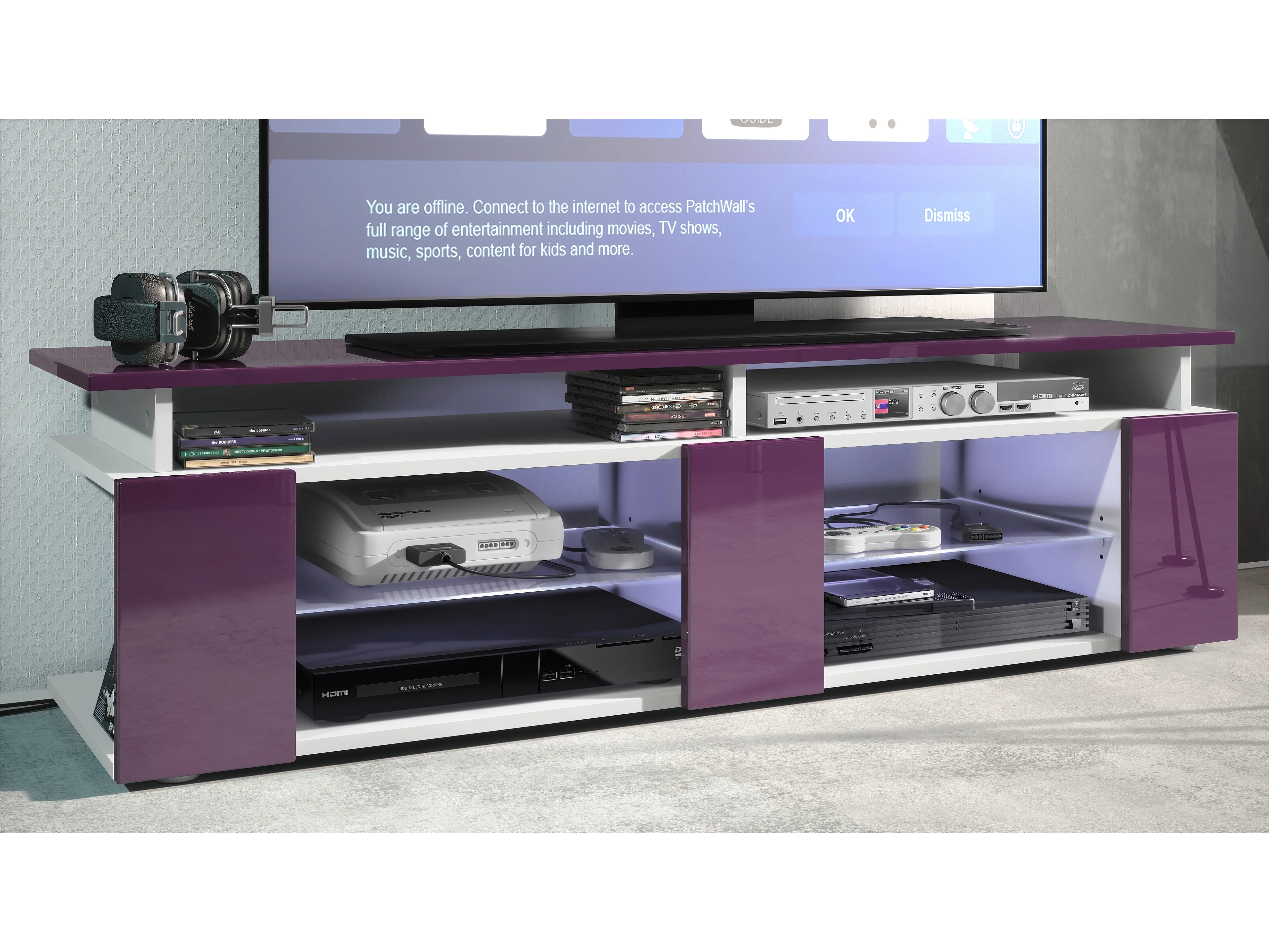 TV Board Movie V2 Game On Lowboard 138,5 x 39 x 39 cm éclairage LED inclus Blanc, caisson en blanc mat, façades en mûre haute brillance