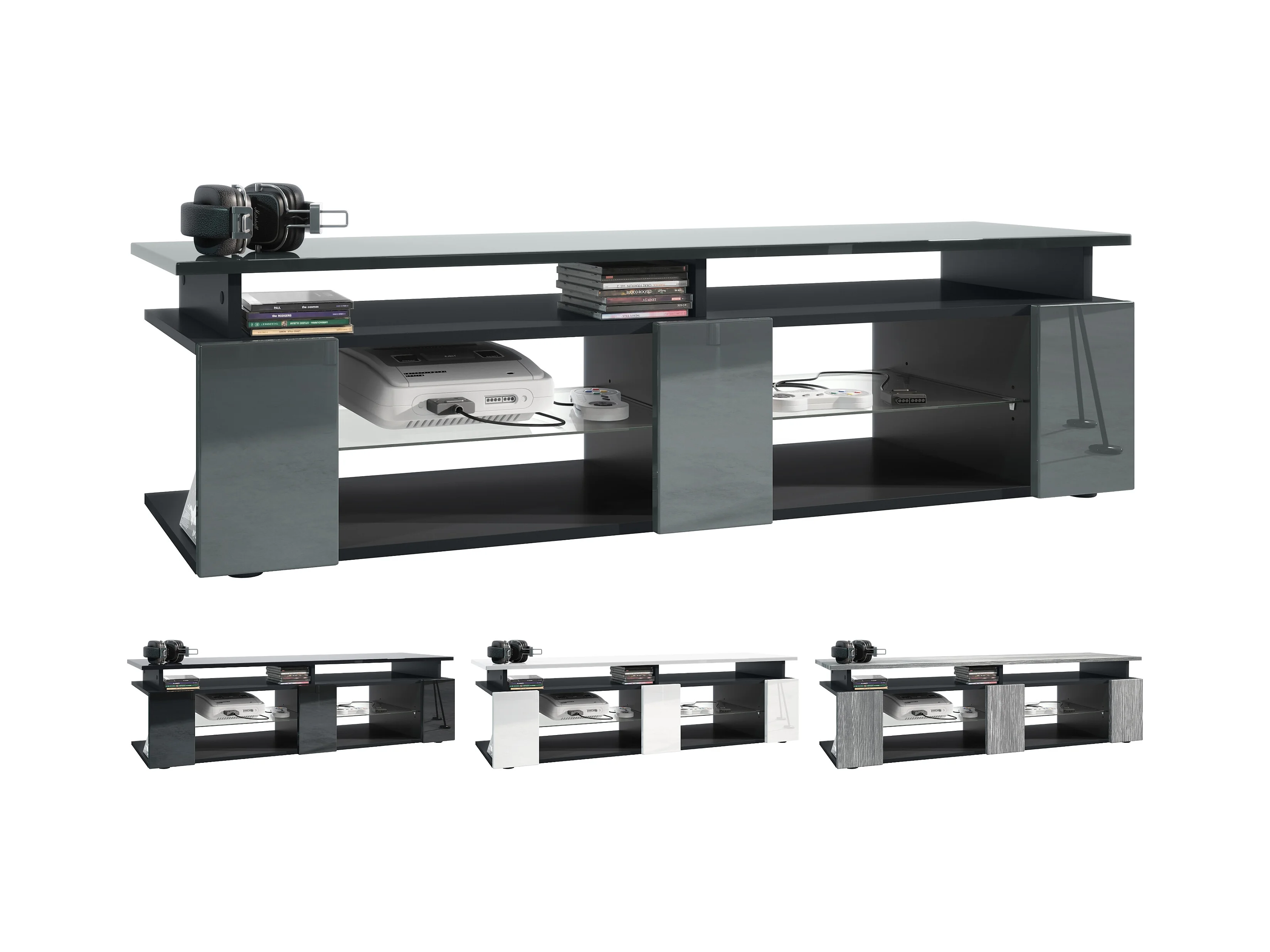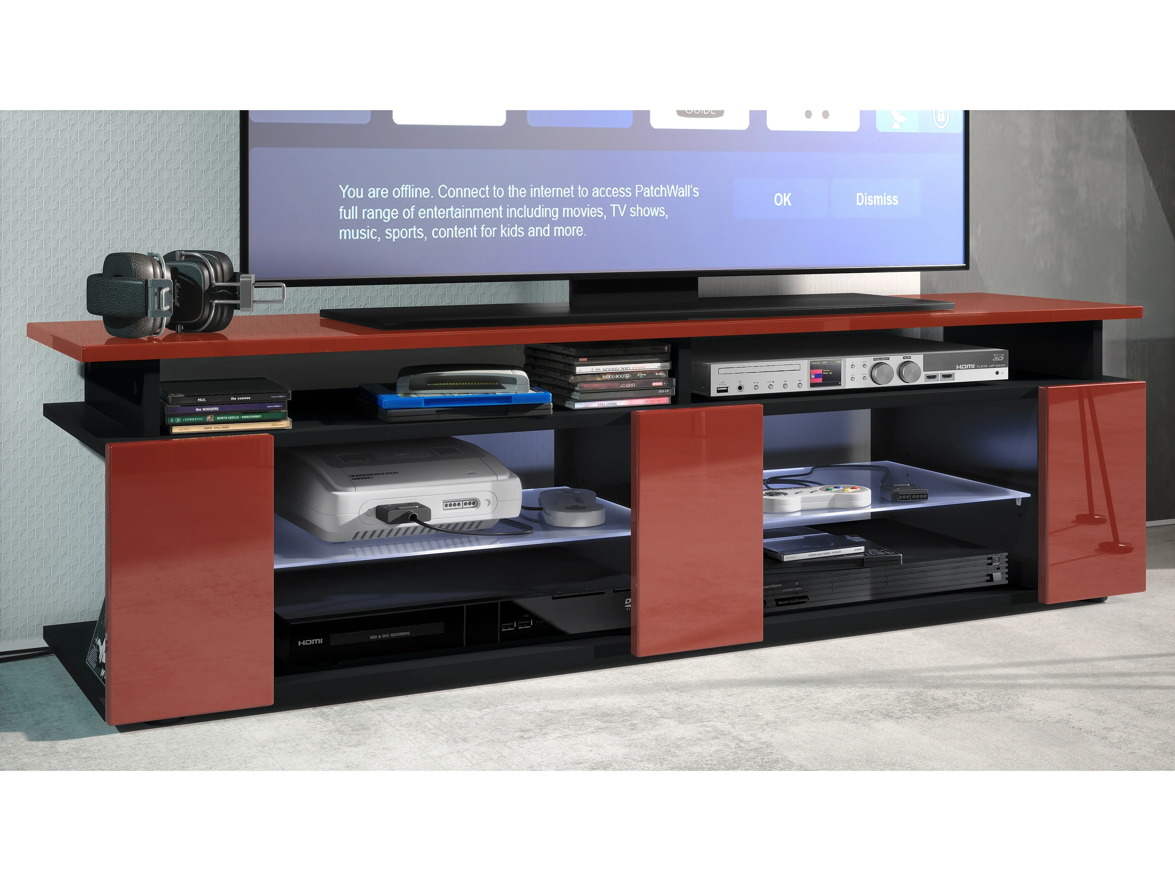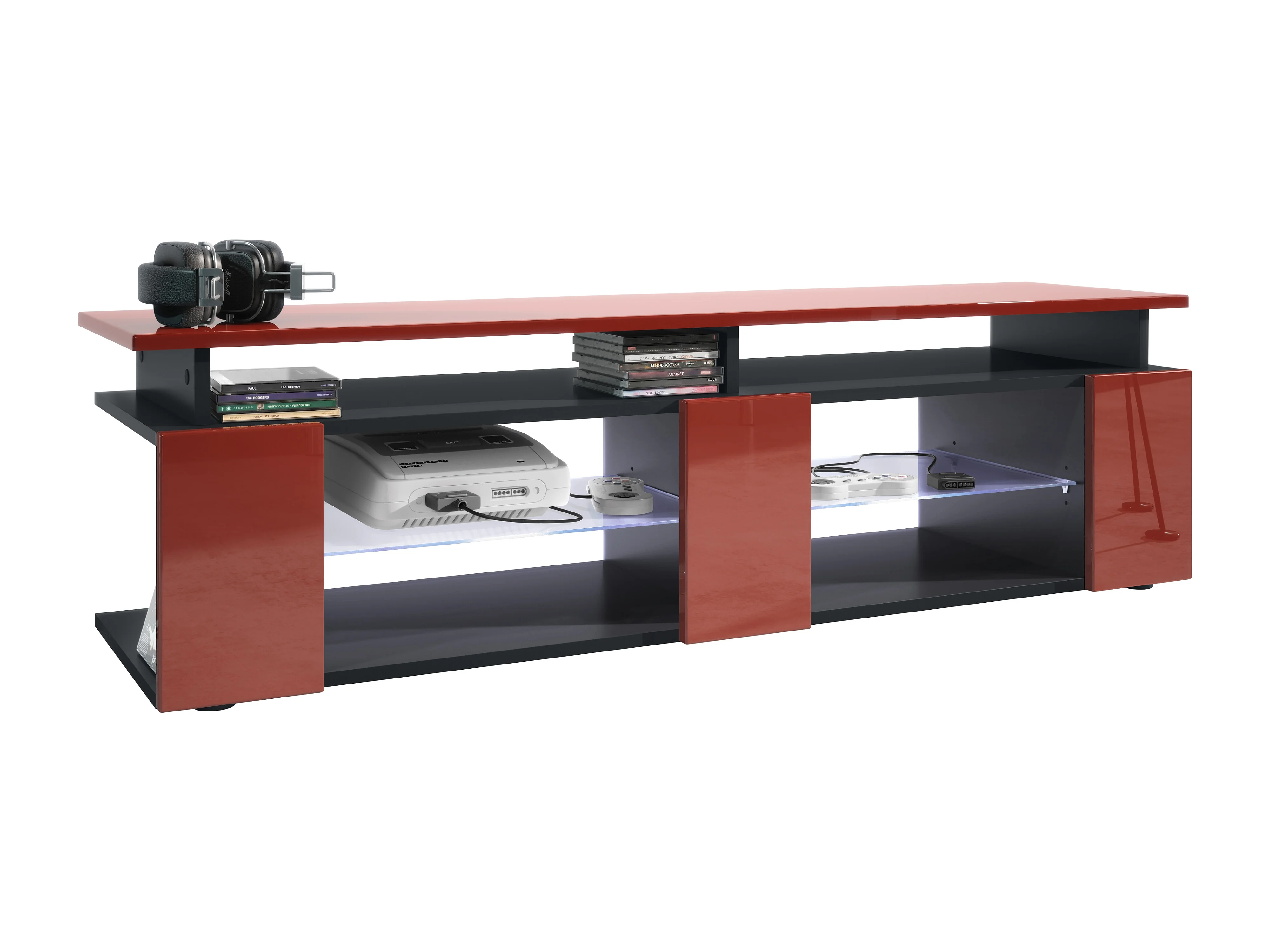 TV Board Movie V2 Game On Lowboard 138,5 x 39 x 39 cm éclairage LED inclus Blanc, caisson en noir mat, façades en bordeaux haute brillance