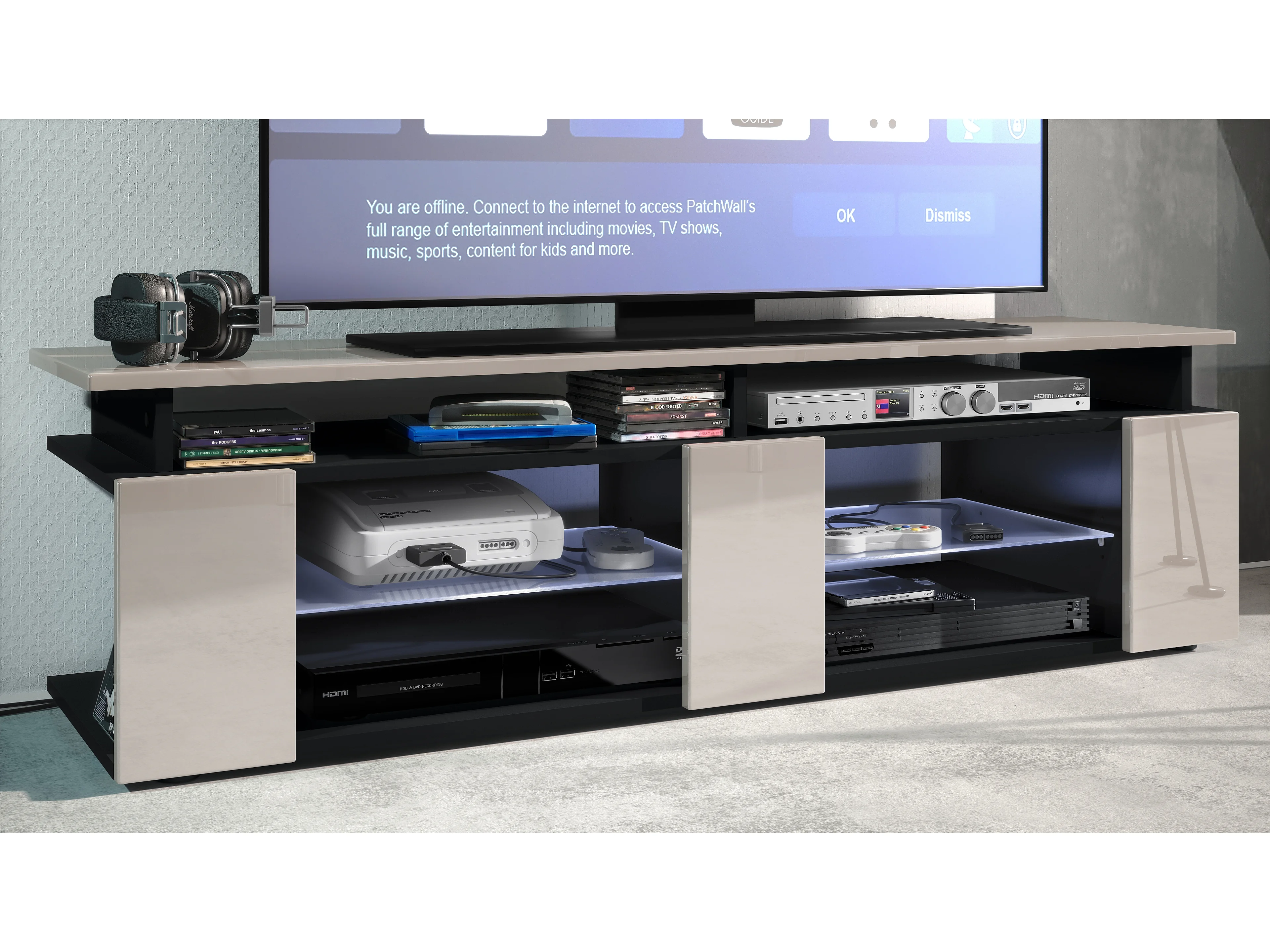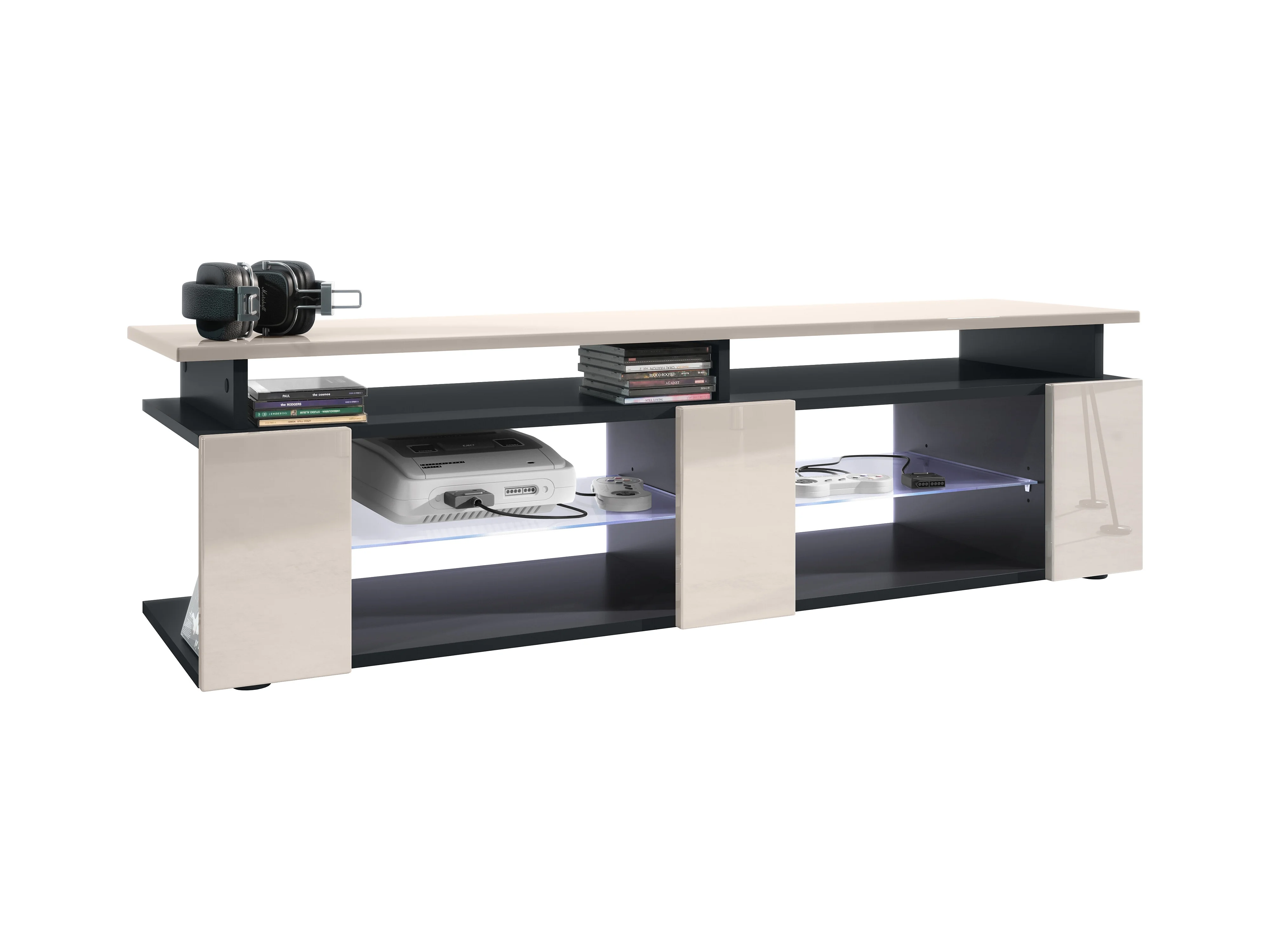 TV Board Movie V2 Game On Lowboard 138,5 x 39 x 39 cm éclairage LED inclus Blanc, caisson en noir mat, façades en gris sable haute brillance