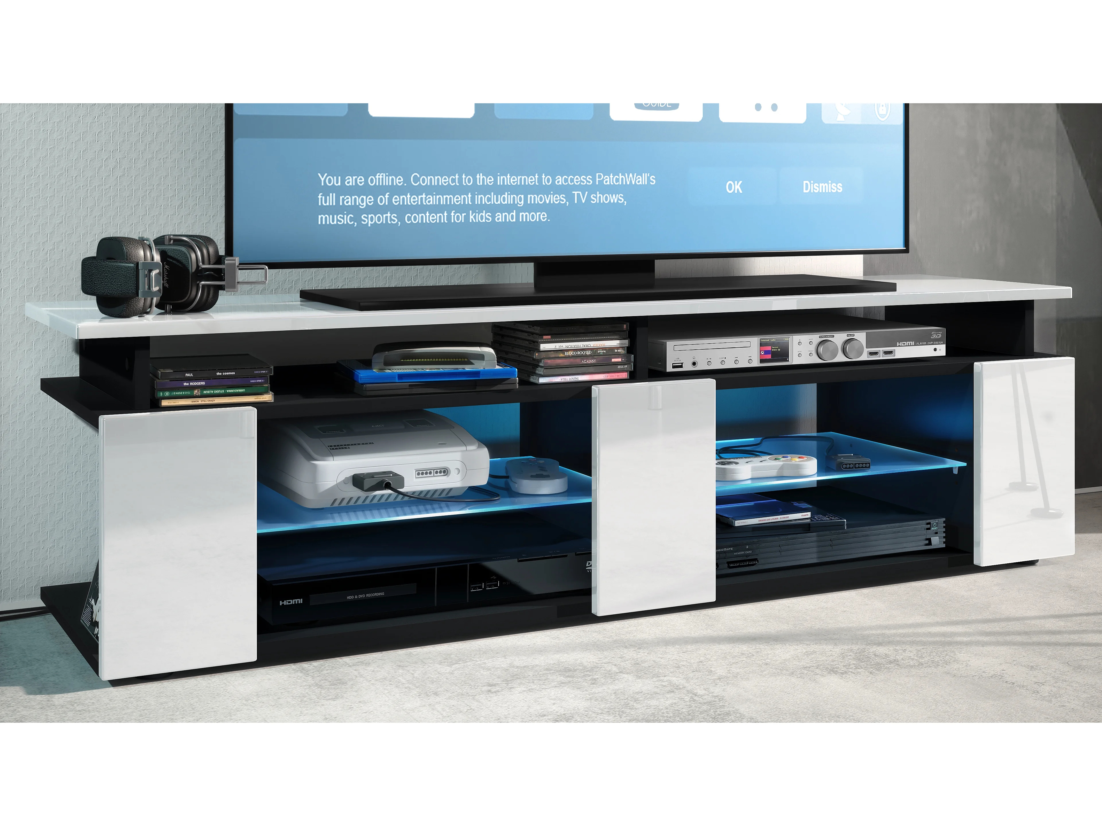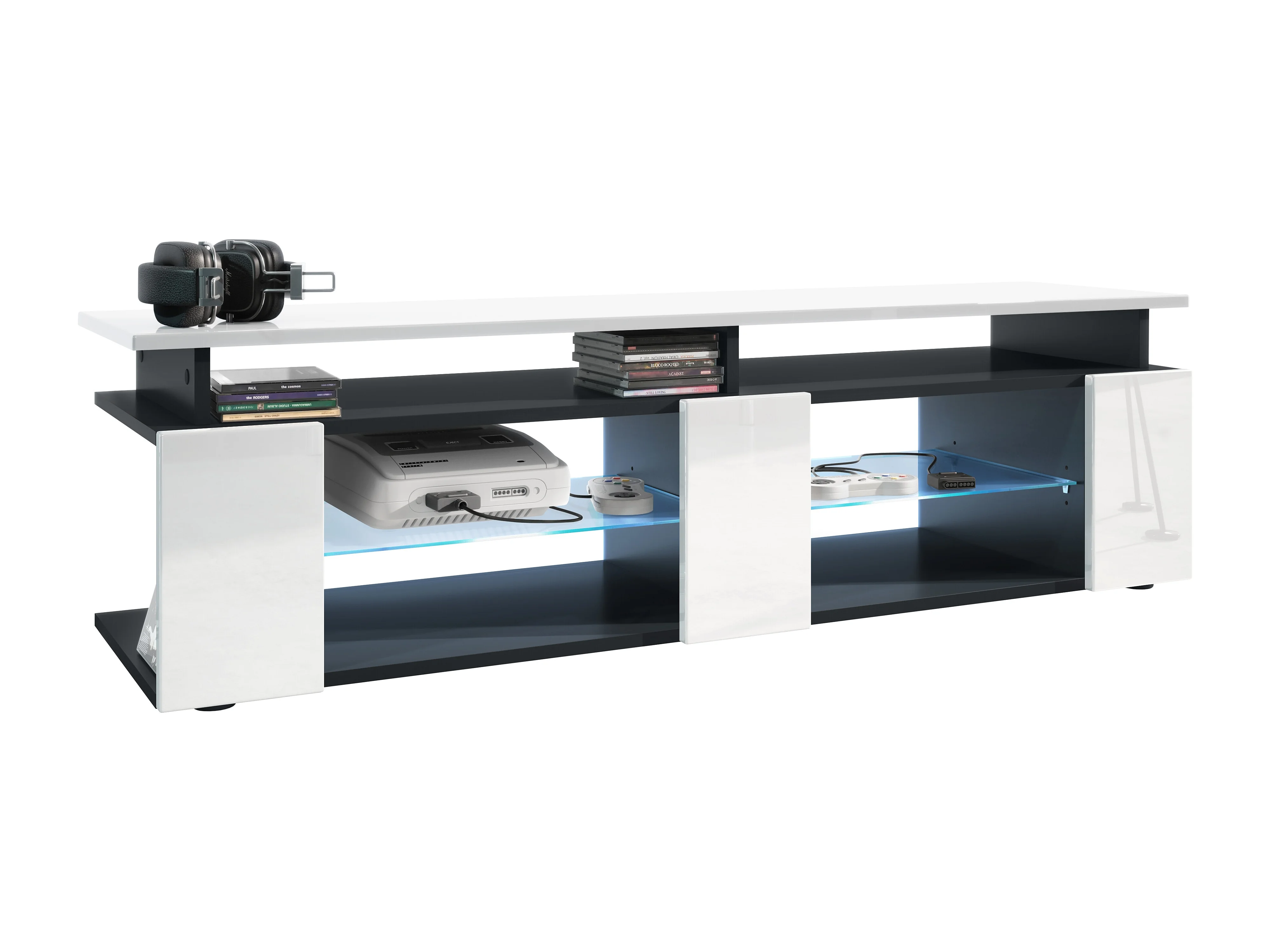 TV Board Movie V2 Game On Lowboard 138,5 x 39 x 39 cm éclairage LED inclus Bleu, caisson en noir mat, façades en blanc haute brillance