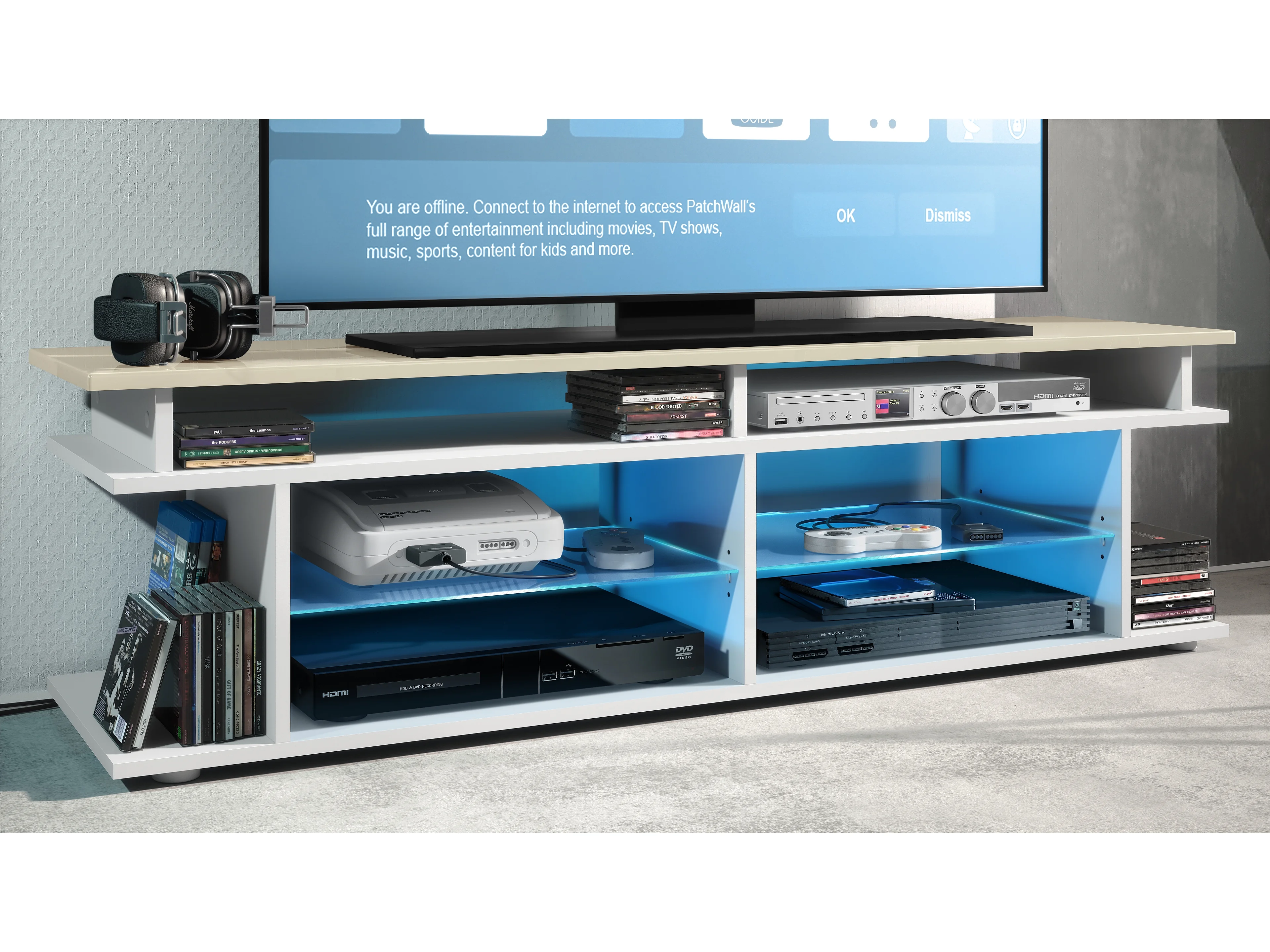 TV Board Movie V3 Game On 138,5 x 39 x 37,5 cm éclairage LED inclus Blanc, caisson en blanc mat, élément supérieur en crème haute brillance