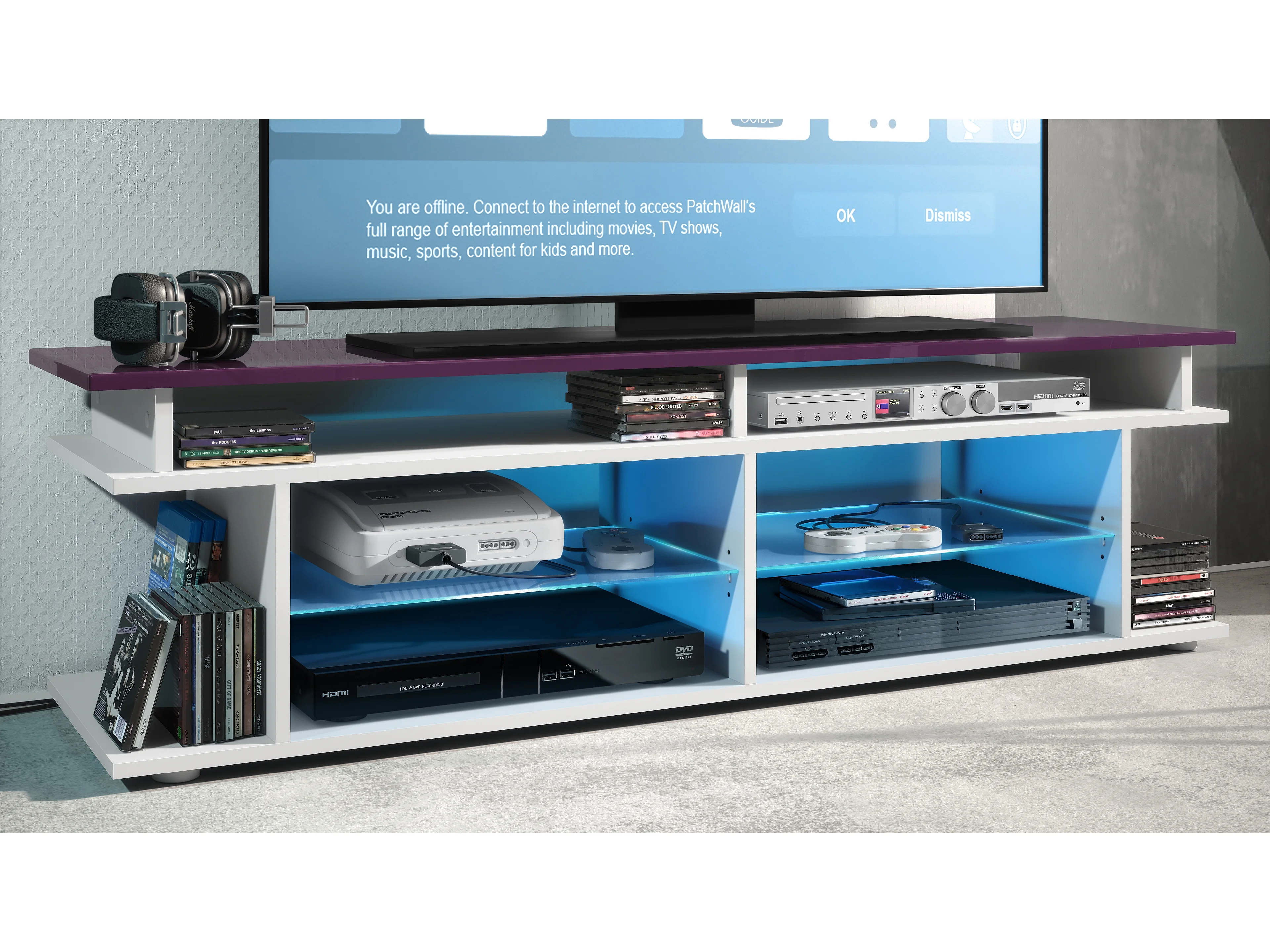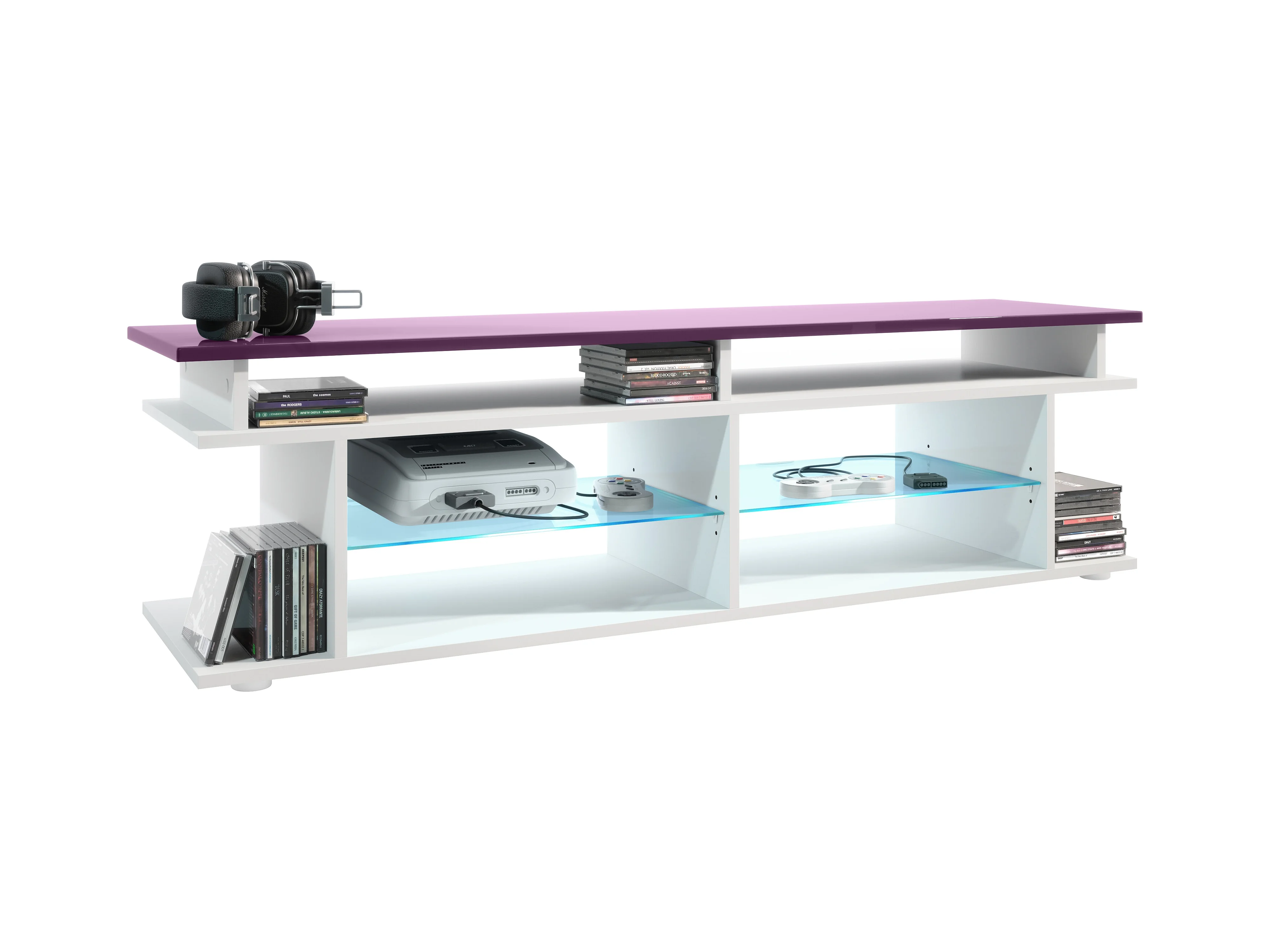 TV Board Movie V3 Game On 138,5 x 39 x 37,5 cm éclairage LED inclus Blanc, caisson en blanc mat, élément supérieur en mûre haute brillance