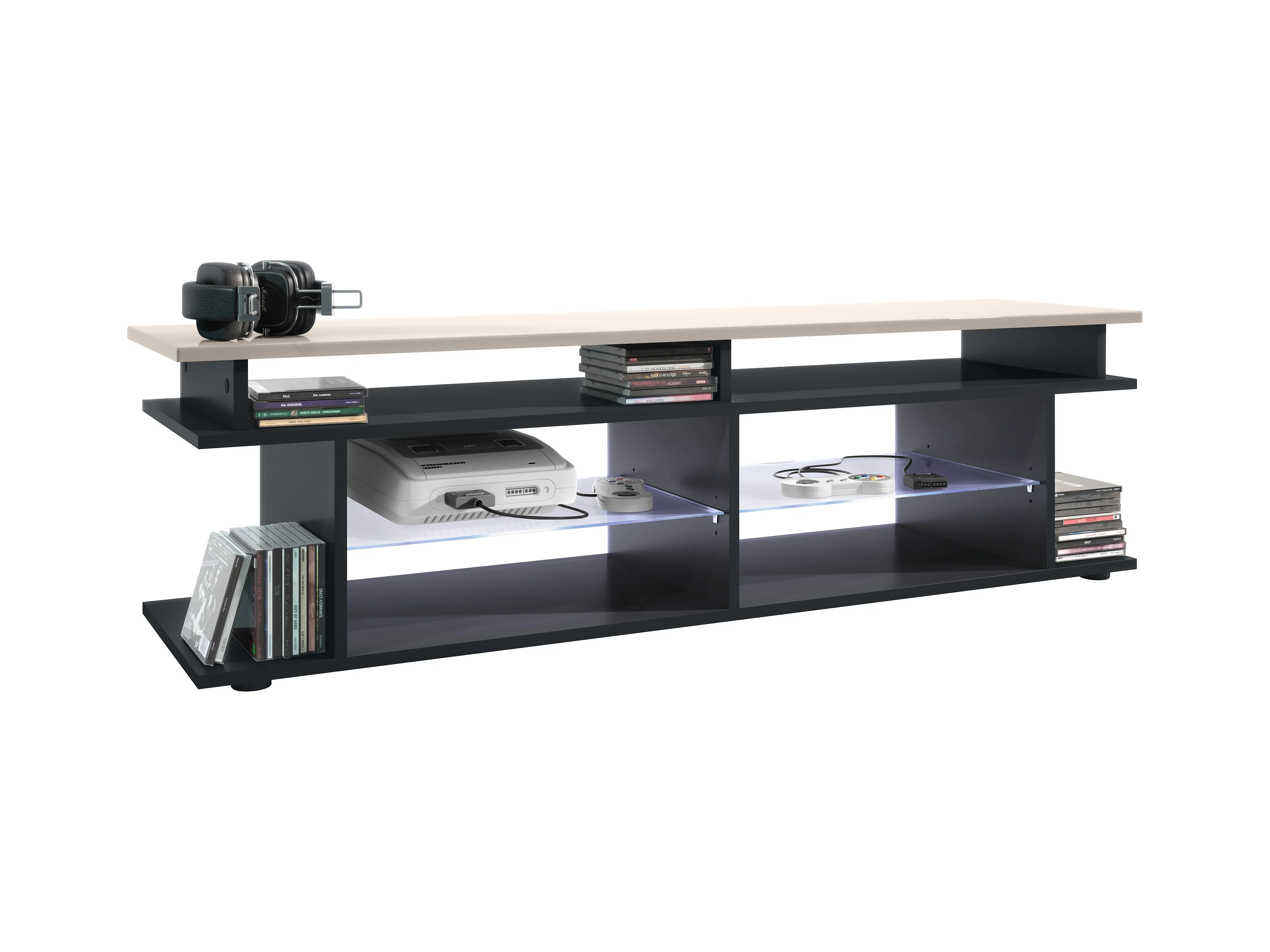 TV Board Movie V3 Game On 138,5 x 39 x 37,5 cm éclairage LED inclus Blanc, caisson en noir mat, élément supérieur en gris sable haute brillance