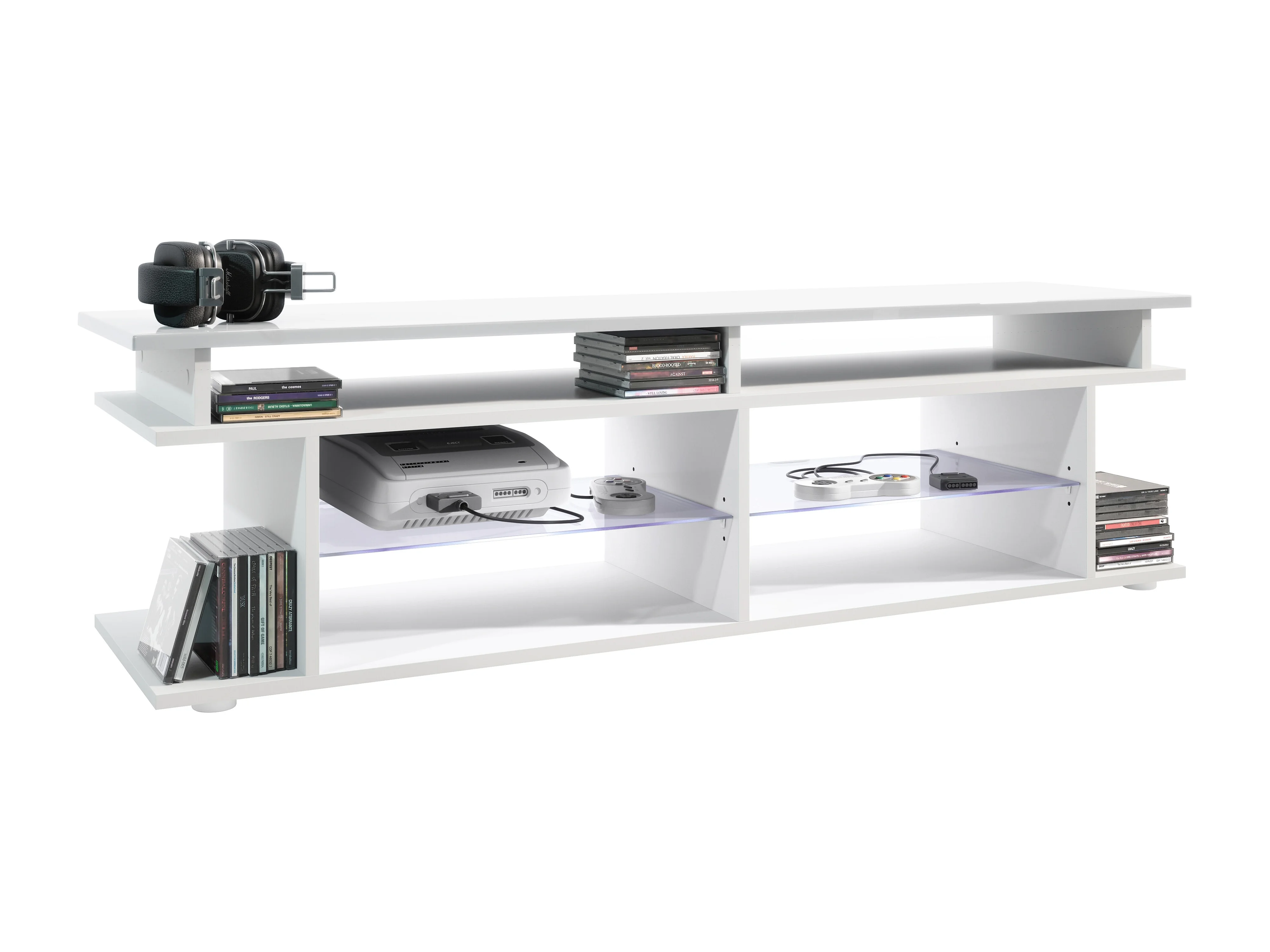 TV Board Movie V3 Game On 138,5 x 39 x 37,5 cm éclairage LED inclus Bleu, caisson en blanc mat, élément supérieur en blanc haute brillance