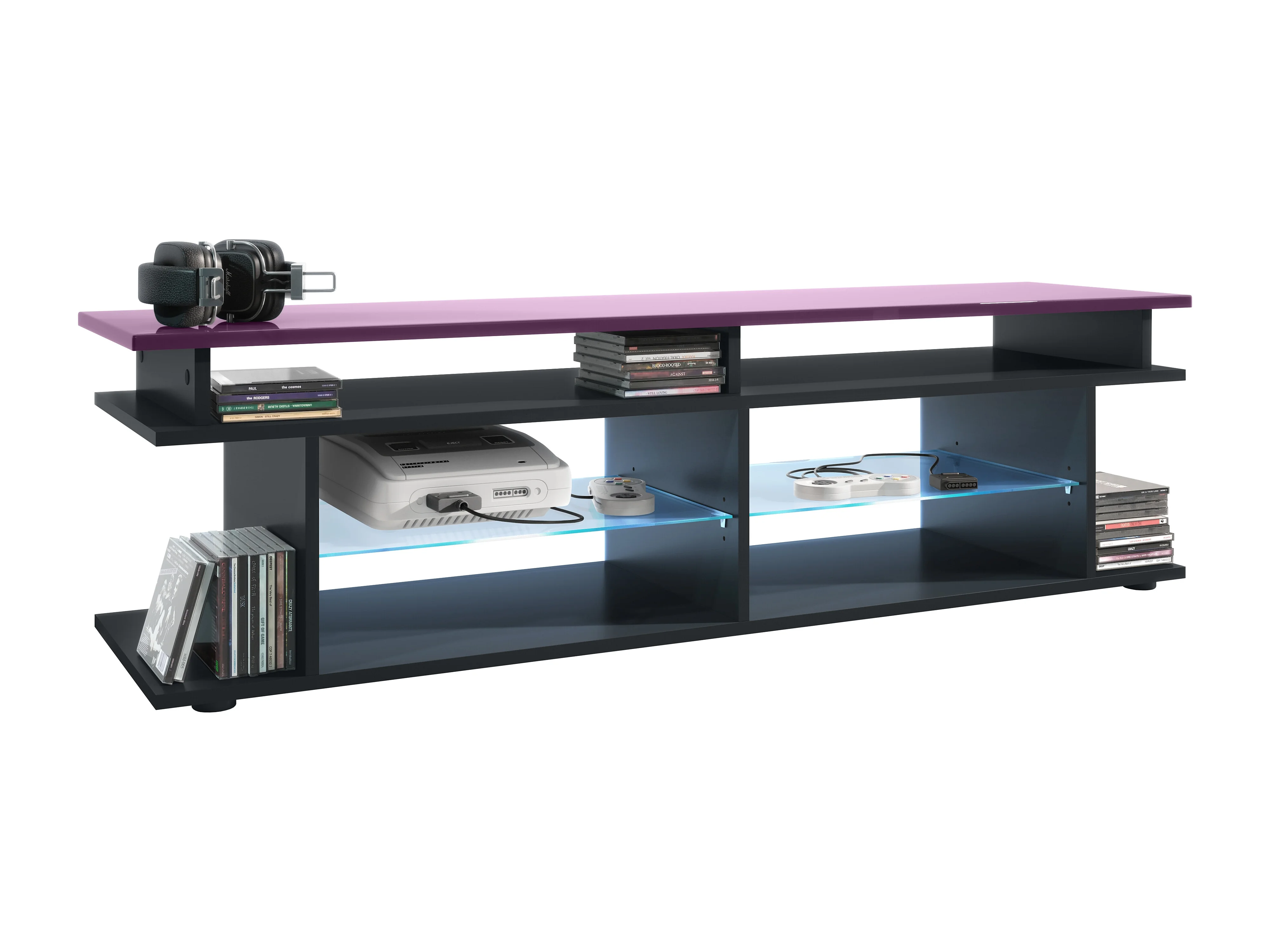 TV Board Movie V3 Game On 138,5 x 39 x 37,5 cm éclairage LED inclus Bleu, caisson en noir mat, élément supérieur en mûre haute brillance