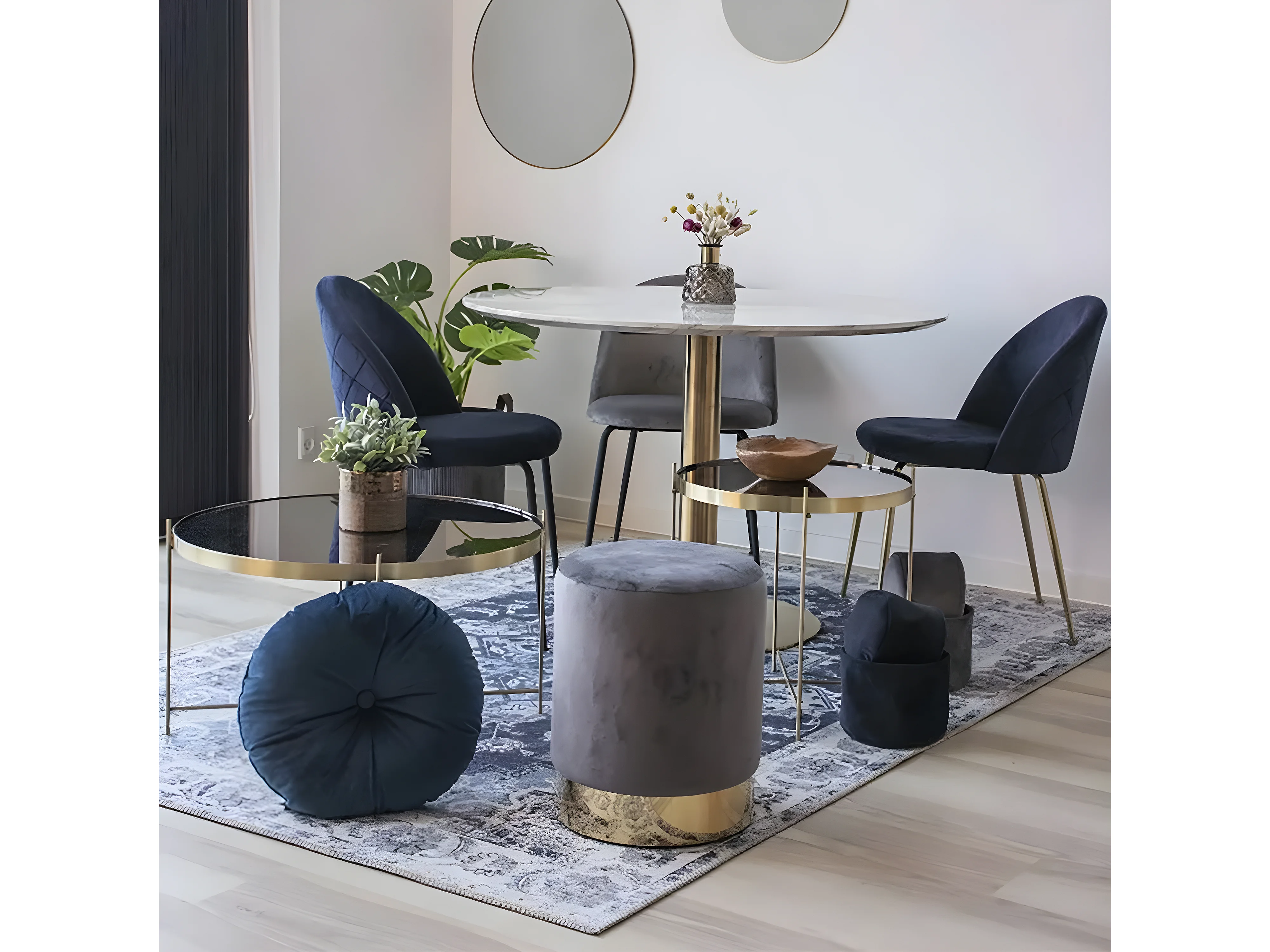 TYROL - Table Repas Ø110cm Plateau MDF Aspect Marbré et Pied Métal Doré