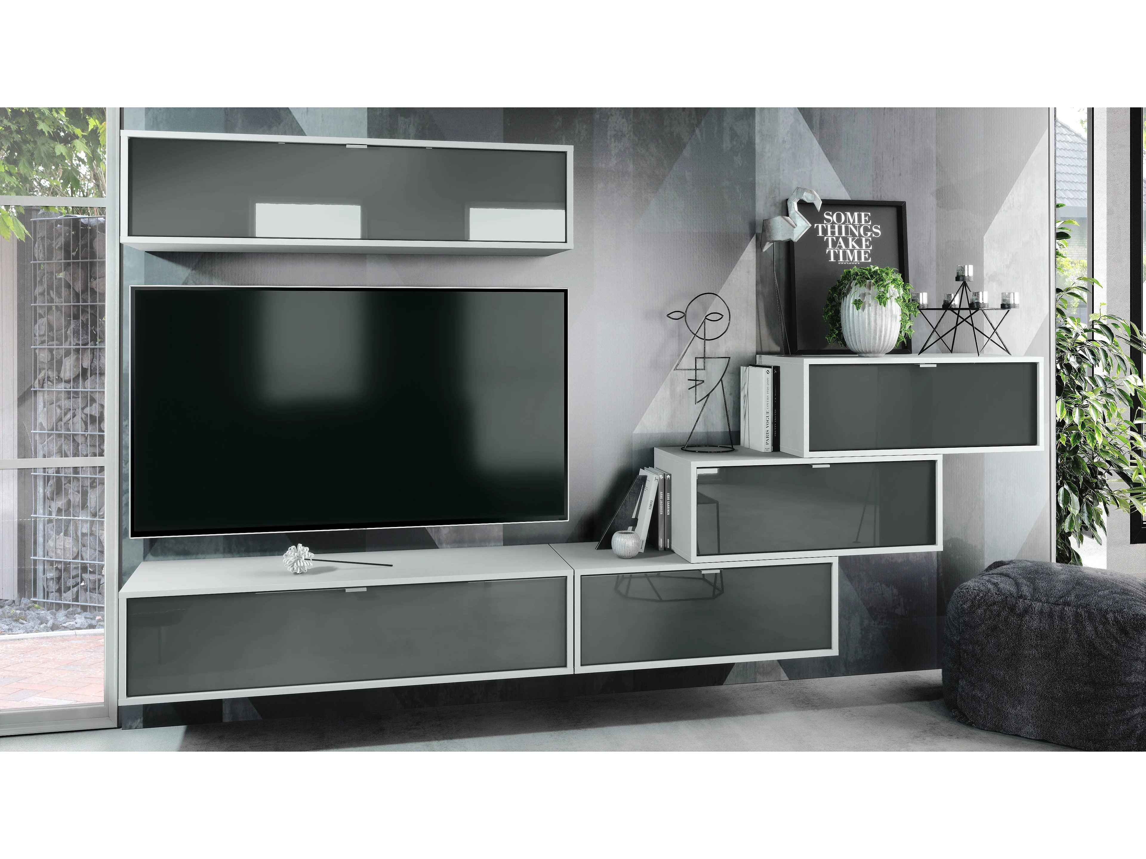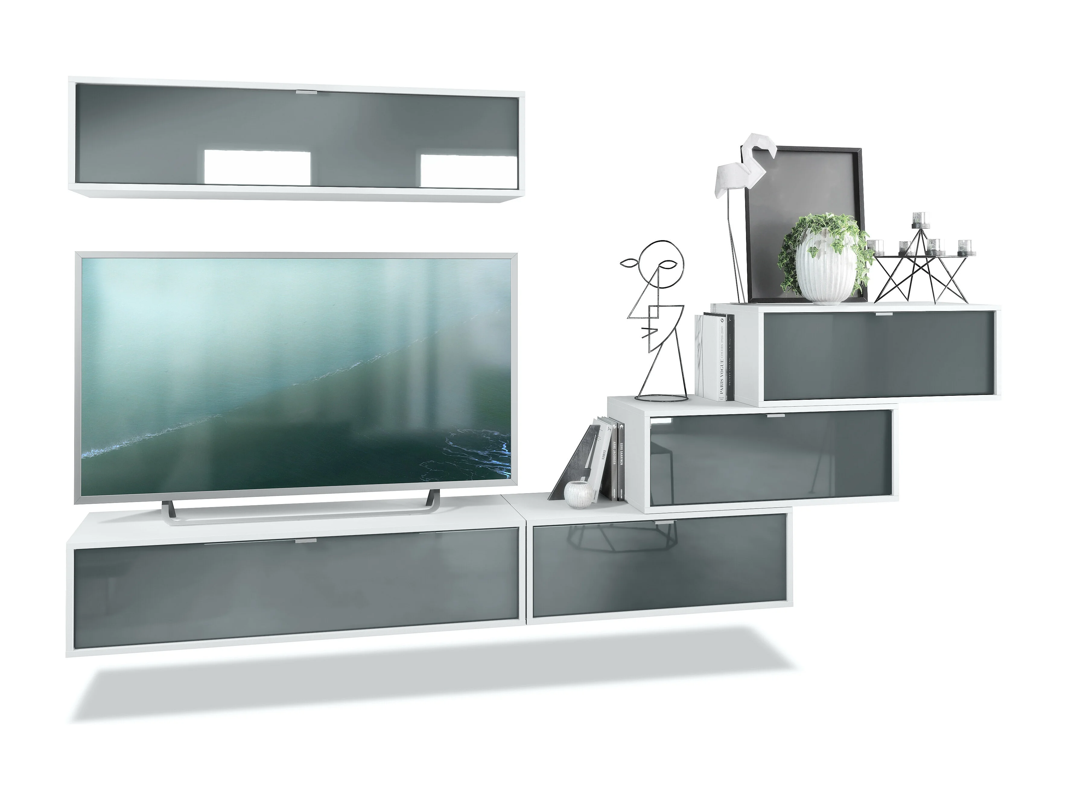 Unité murale Lana V1 composée de 5 unités murales à 12 compartiments, caisson en Blanc mat, façades en Gris haute brillance | Grand choix de couleurs