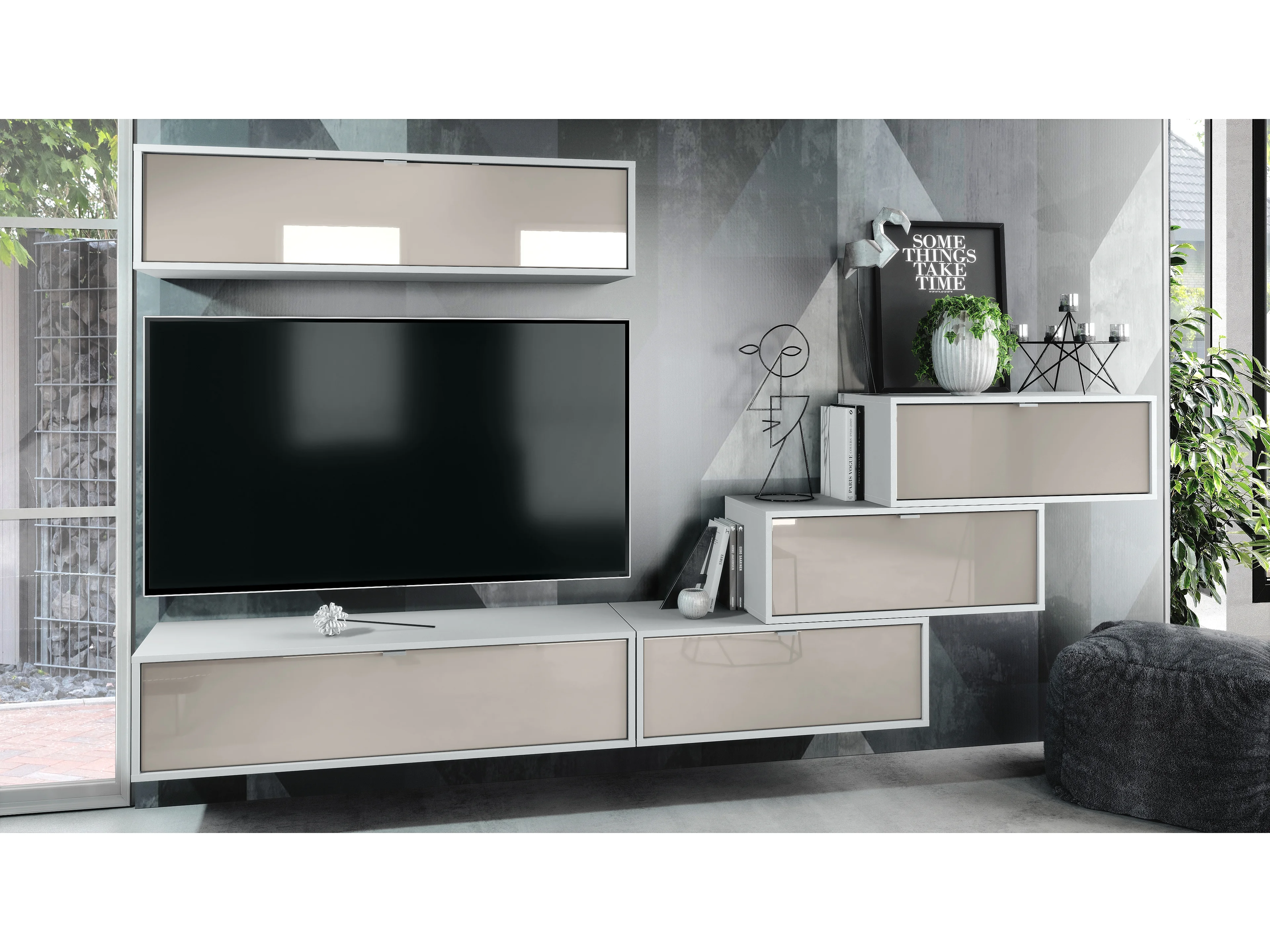 Unité murale Lana V1 composée de 5 unités murales à 12 compartiments, caisson en Blanc mat, façades en Gris sable haute brillance | Grand choix de couleurs