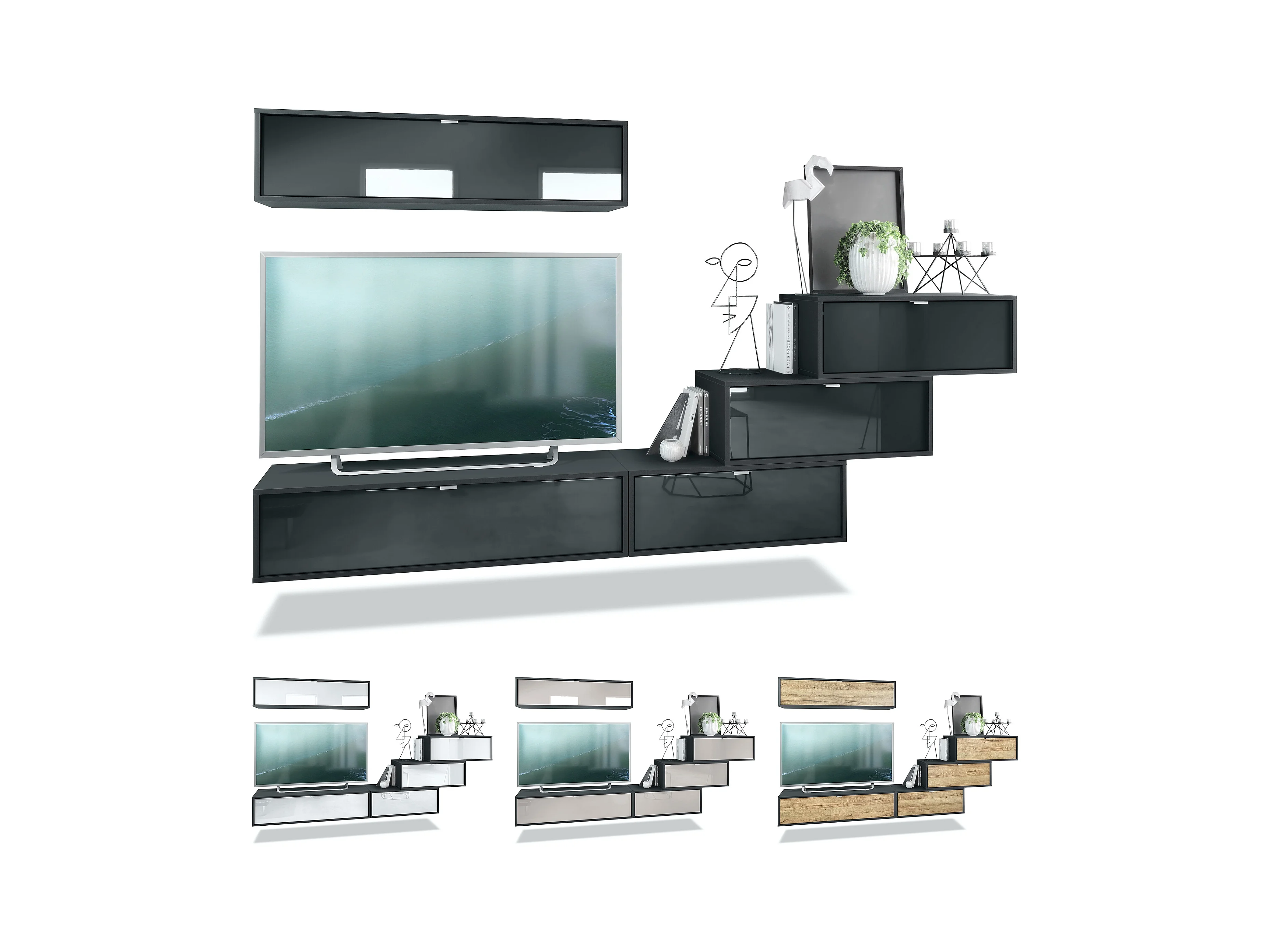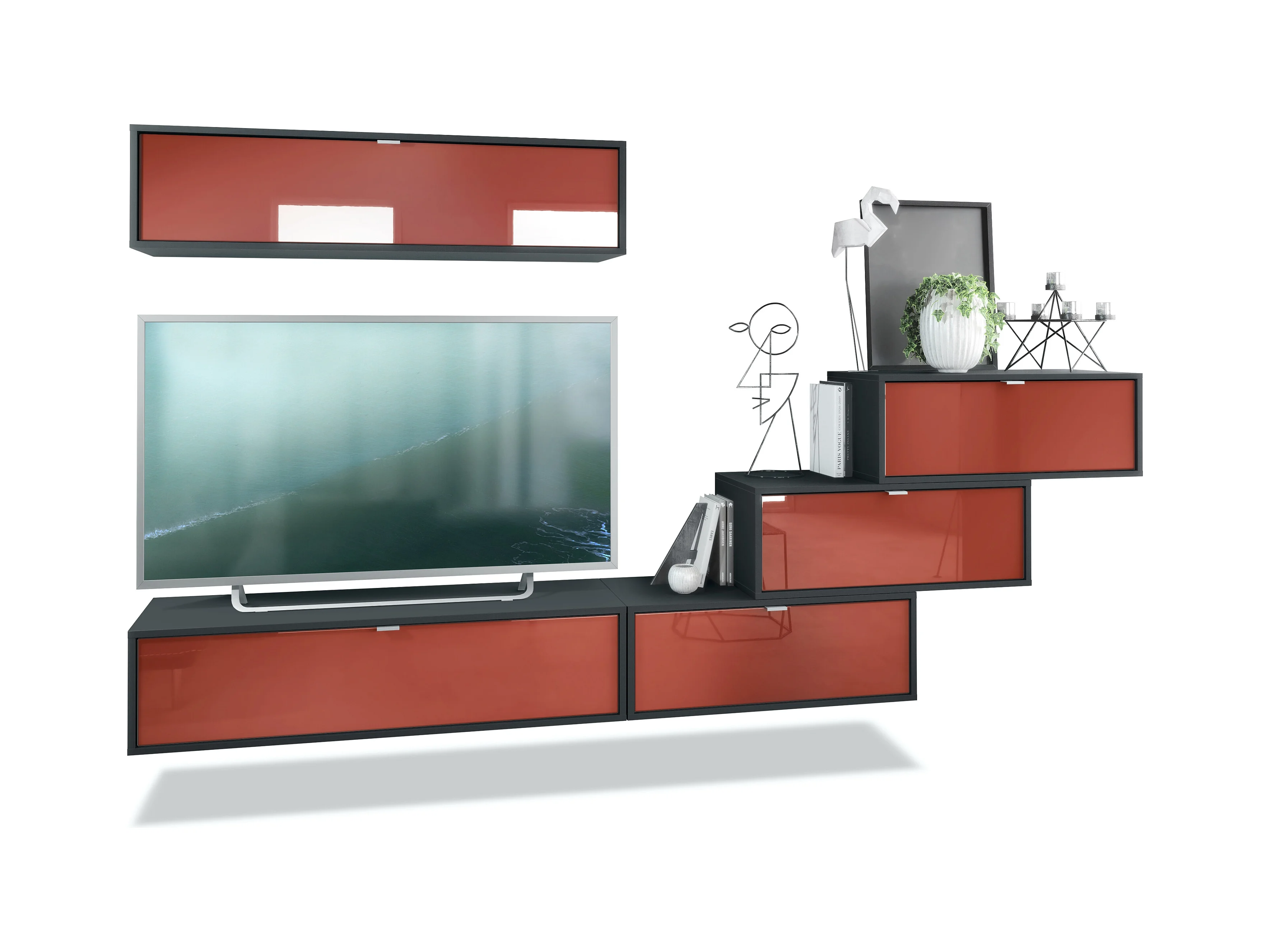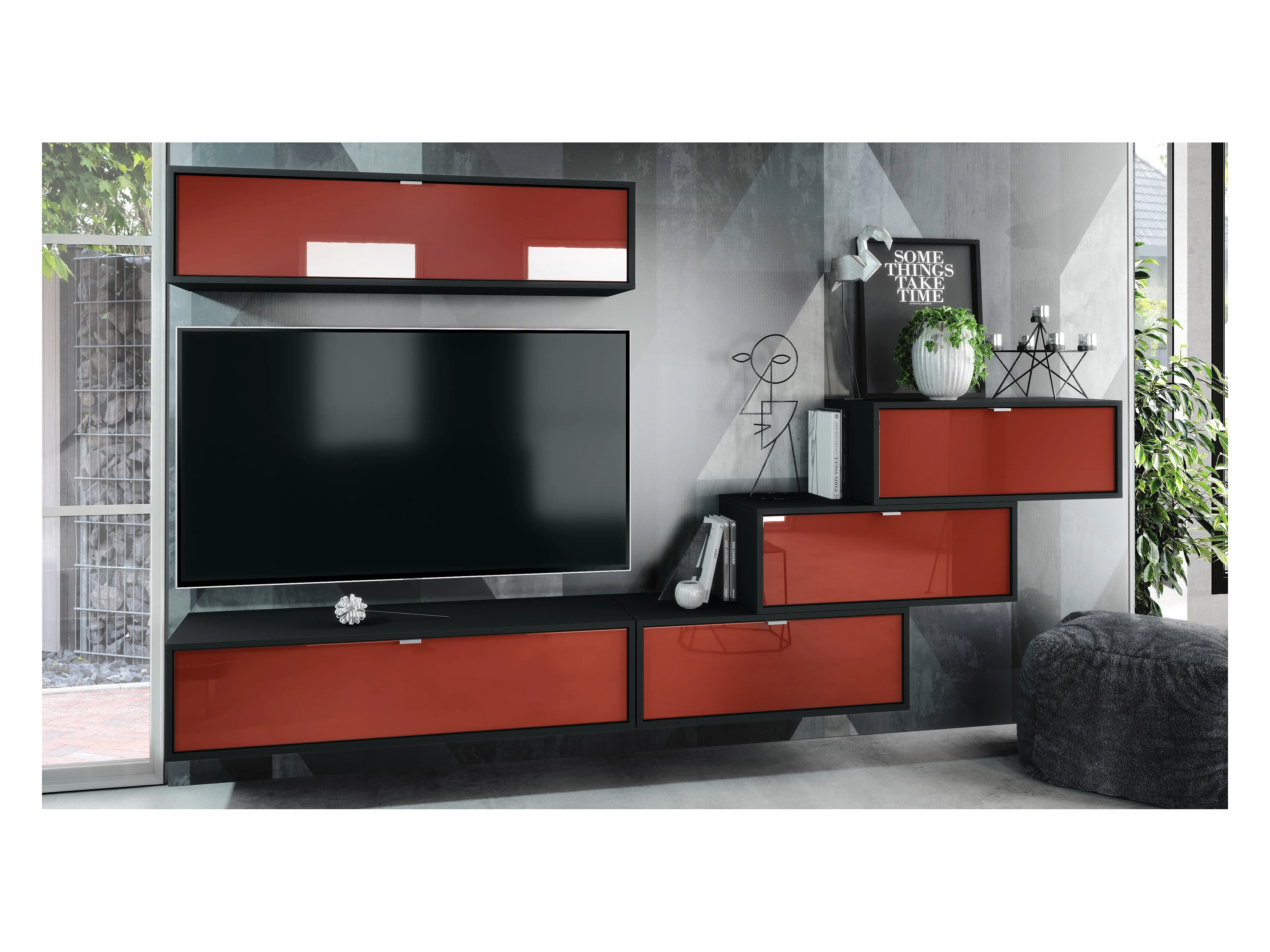 Unité murale Lana V1 composée de 5 unités murales à 12 compartiments, caisson en Noir mat, façades en Bordeaux haute brillance | Grand choix de couleurs