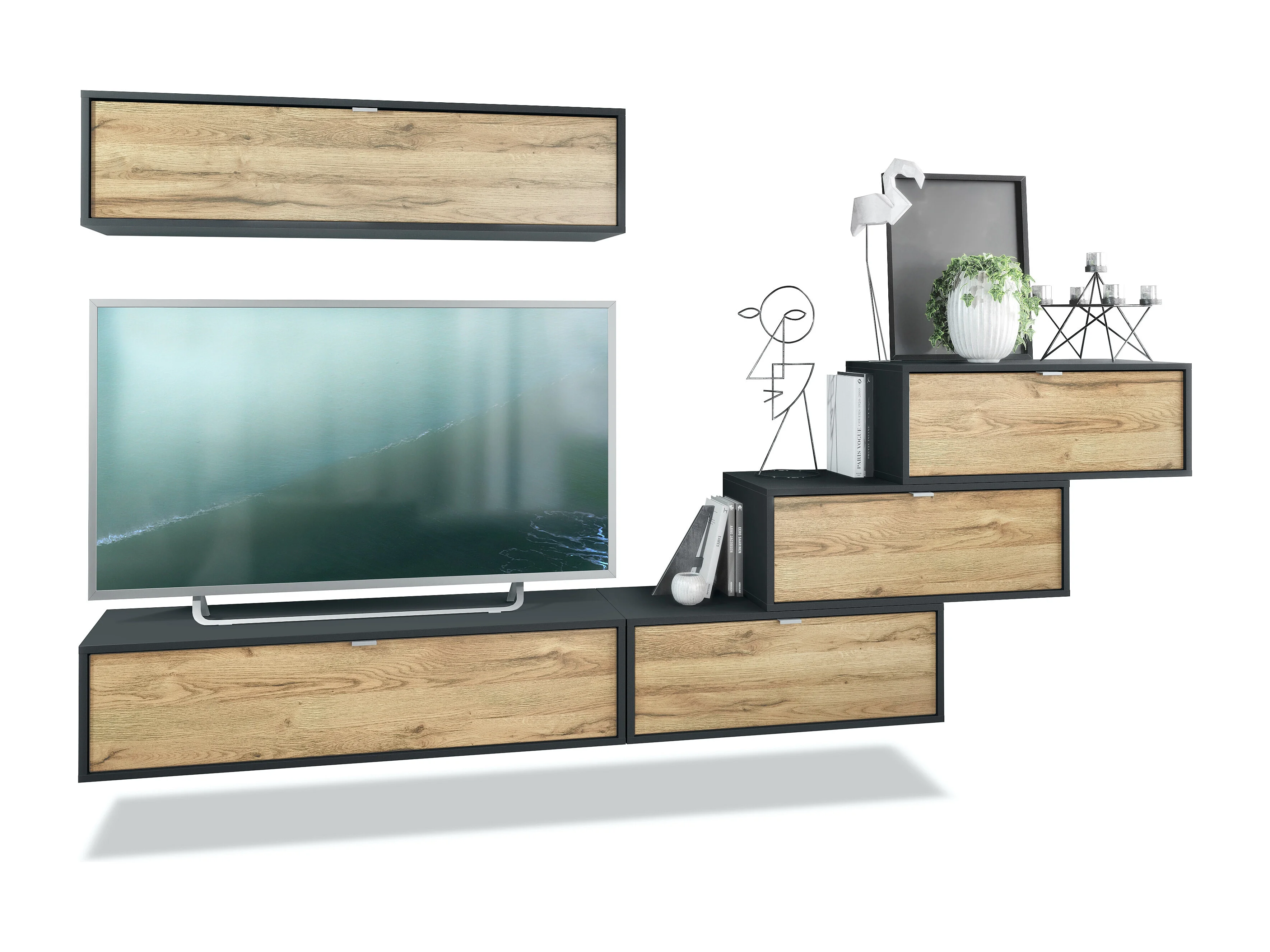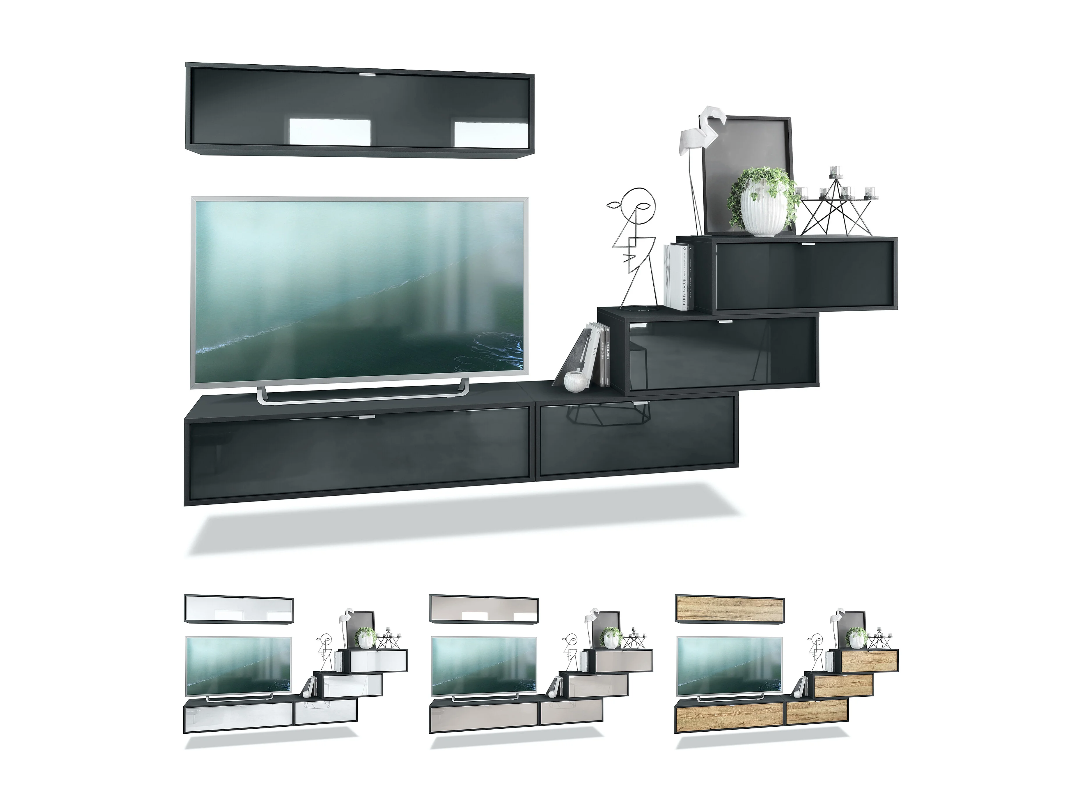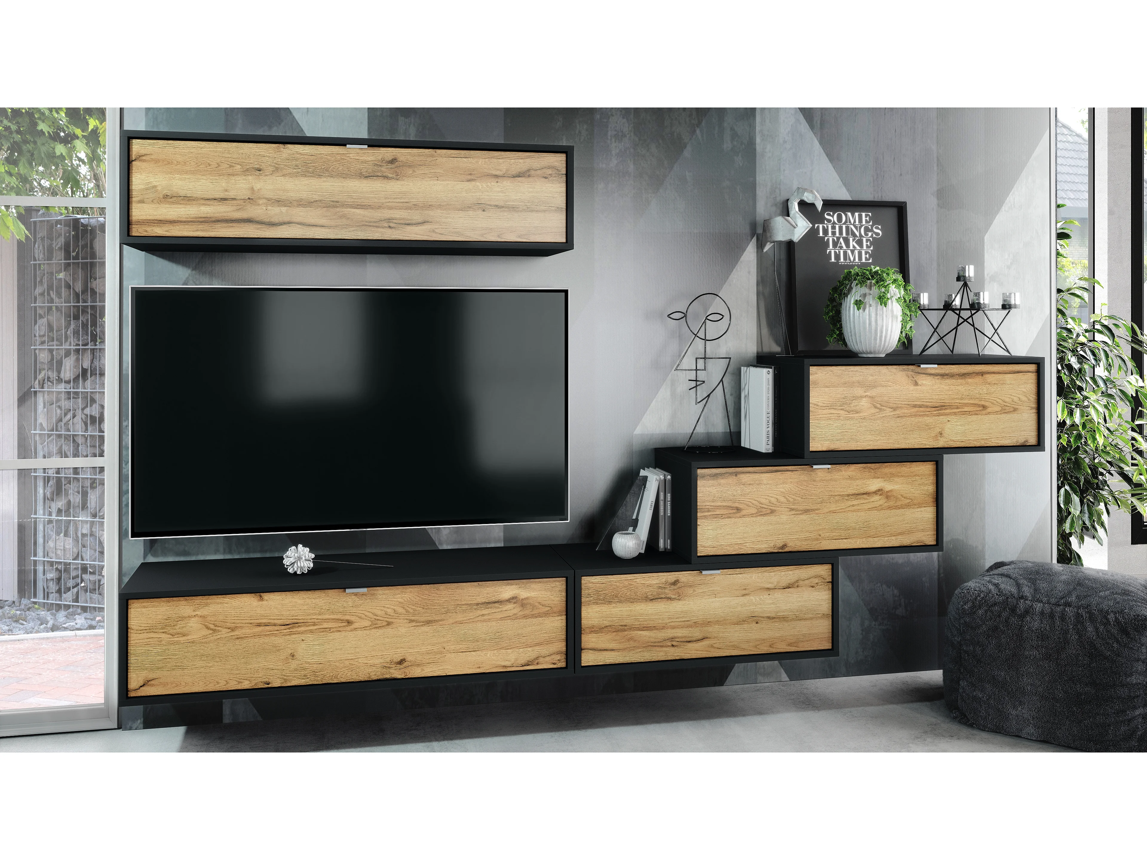 Unité murale Lana V1 composée de 5 unités murales à 12 compartiments, caisson en Noir mat, façades en Chêne Nature | Grand choix de couleurs